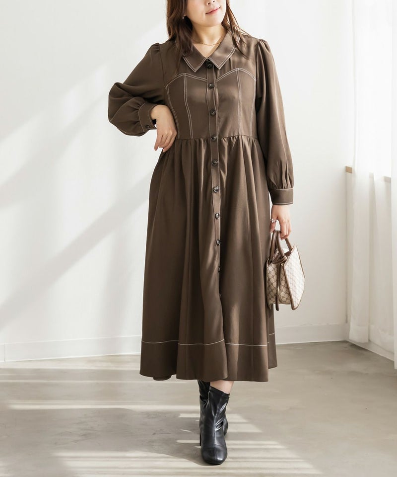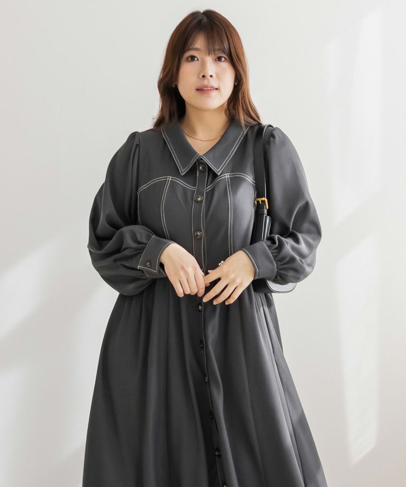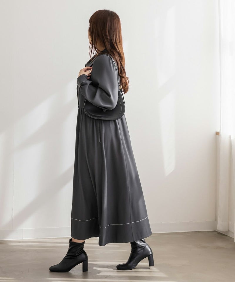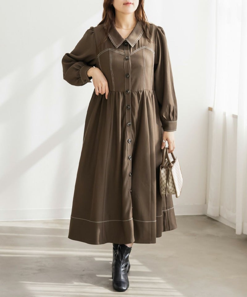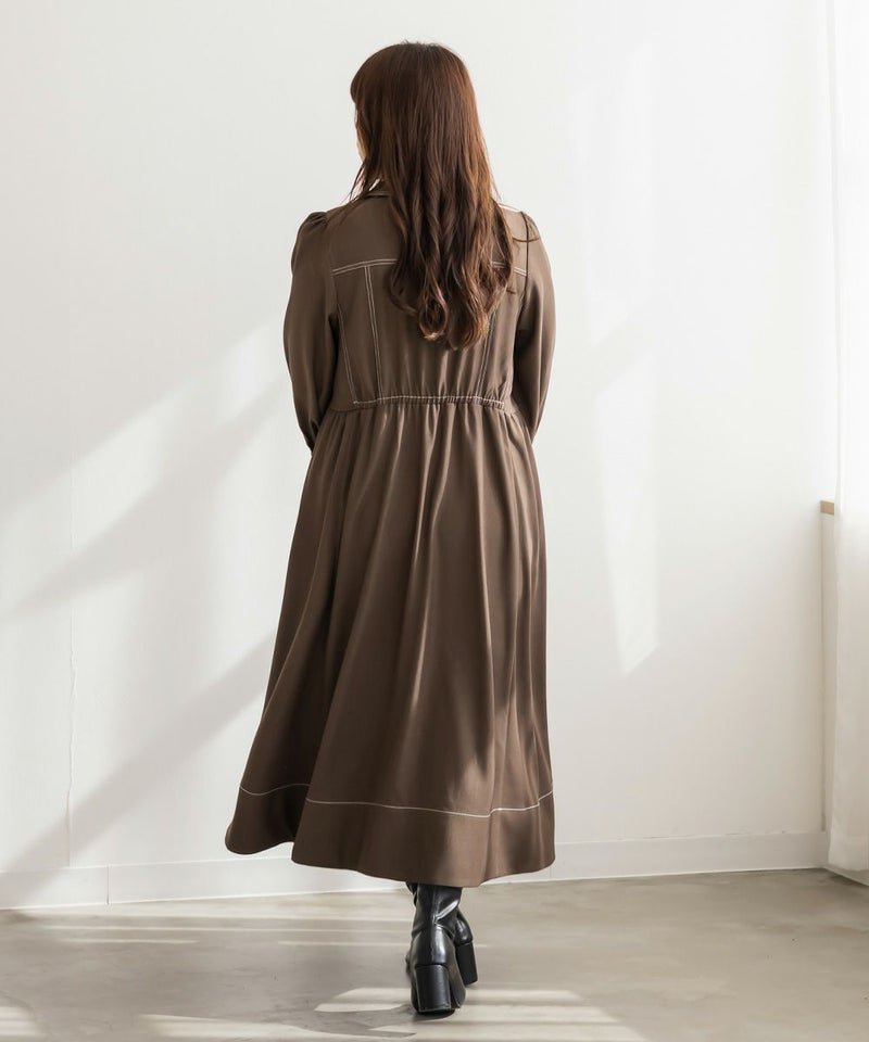 メリハリを与える配色ステッチデザインですっきりとモードな雰囲気にまとまる1枚。女性らしいビスチェ風の切替とウエスト切替のシルエットで甘くなり過ぎない大人っぽいスタイルに。第一釦まで止めても顔回りに抜け感を与える襟と、二の腕や下半身をカバーするシルエット。視覚効果とこだわりのバランスで着やせできるワンピース。