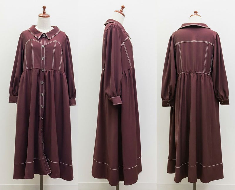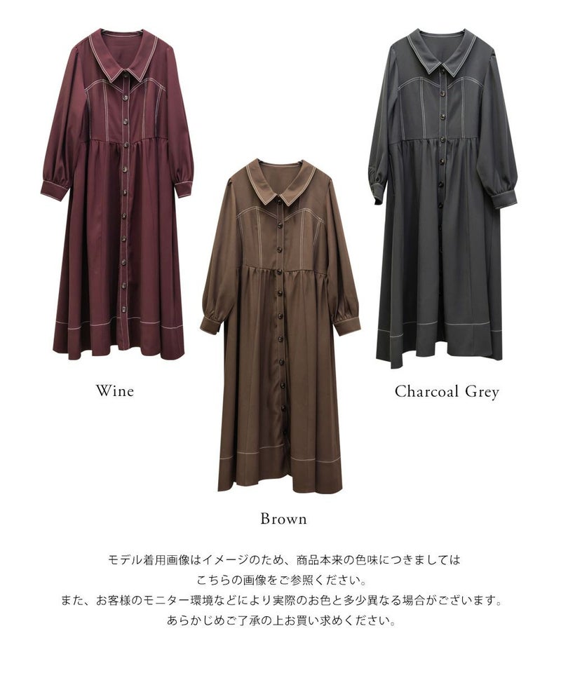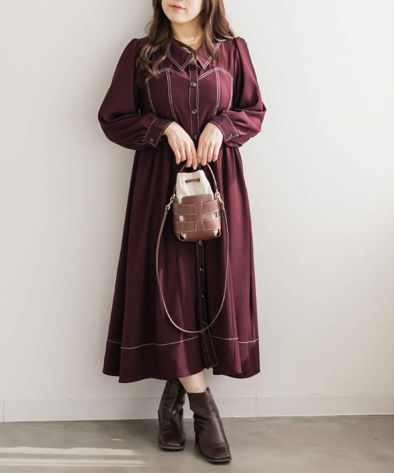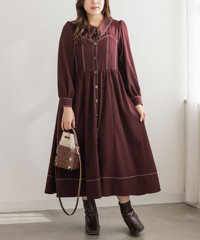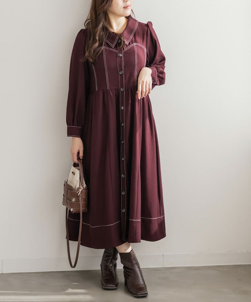 メリハリを与える配色ステッチデザインですっきりとモードな雰囲気にまとまる1枚。女性らしいビスチェ風の切替とウエスト切替のシルエットで甘くなり過ぎない大人っぽいスタイルに。第一釦まで止めても顔回りに抜け感を与える襟と、二の腕や下半身をカバーするシルエット。視覚効果とこだわりのバランスで着やせできるワンピース。