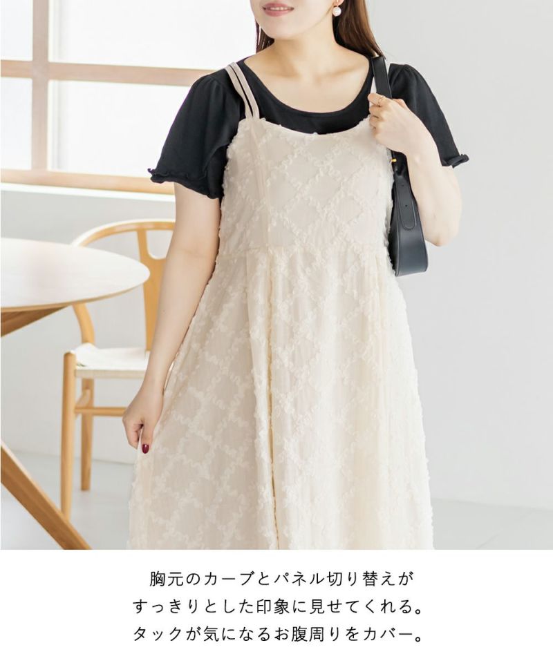 3Lサイズを着用しましたが、後ろはゴムでバストやウエストまわりに程よいゆとりがあり、全体的にちょうどいい着心地でした◎ チェックになったフリルの生地が可愛くて甘すぎず大人っぽい雰囲気で、カットソーやブラウスとのレイヤードも楽しめます!スカート部分はふんわりと広がり、気になる腰まわりやヒップも自然にカバーしてくれるシルエットでした!ダブルストラップになっていて、1つは自由にネックラインを変えられる仕様です。ホルターネックやクロスネックにして雰囲気が変えられるのもポイントです!オールシーズン使用できるのであると嬉しい1枚!お出かけやデートにピッタリな可愛いキャミワンピースです♪