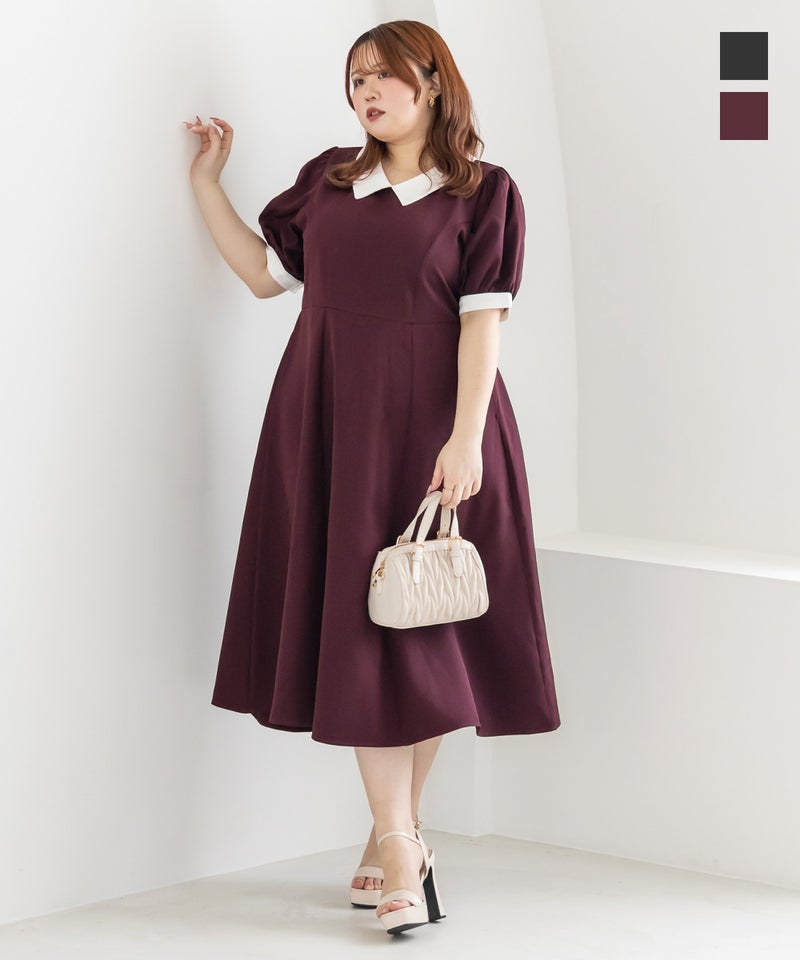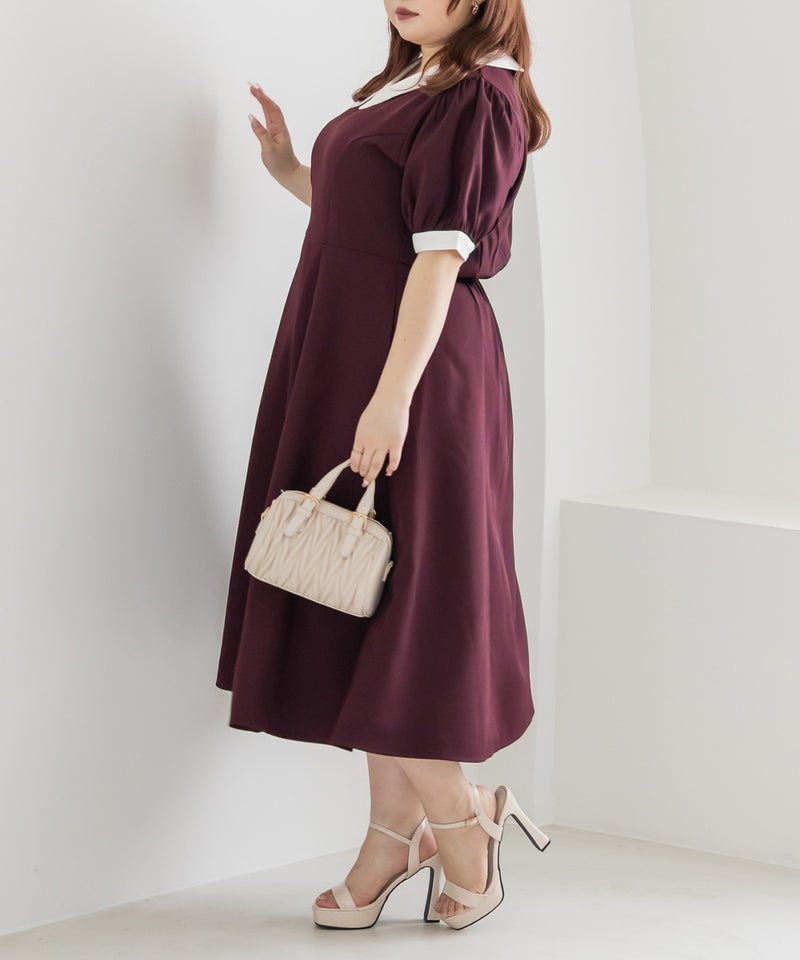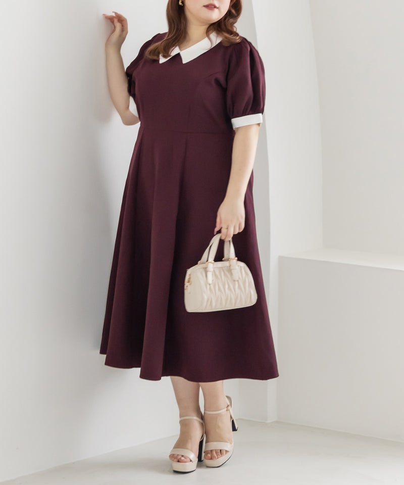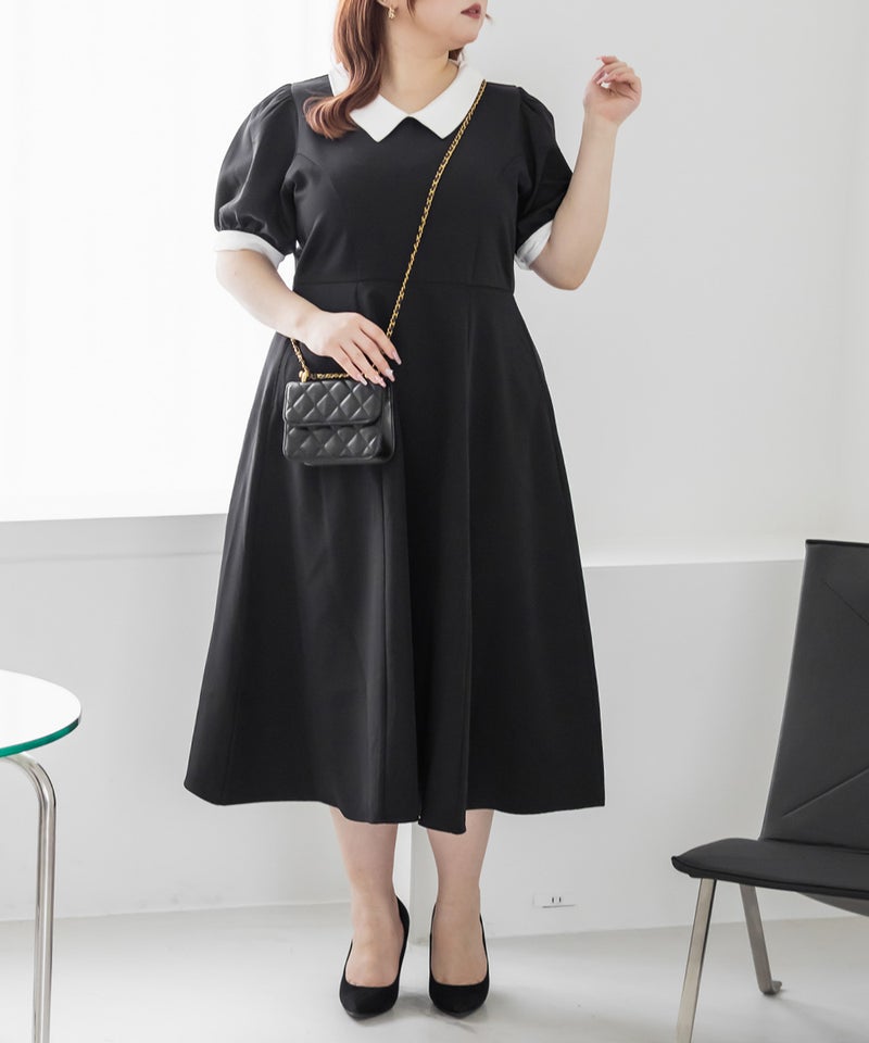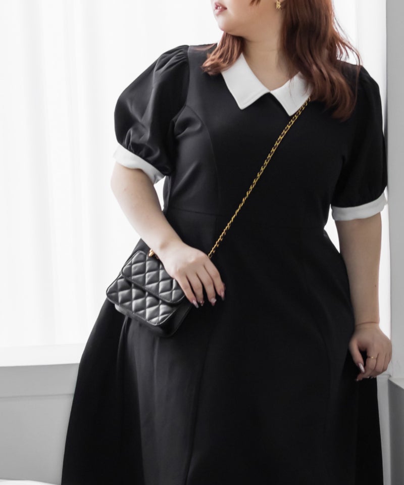 3Lを着て丁度いいサイズでした。王道のフィット&フレアでシルエットの綺麗なシルエットだから着るだけで着やせできます♪襟と袖が配色になっていて、上品でフェミニンな雰囲気に着こなせます!襟はほどよくあいていて、窮屈感がないのも嬉しいです。ポケット付きだからお出かけにも便利です◎シンプルだからこそ洗練されたスタイルになれるワンピースです!