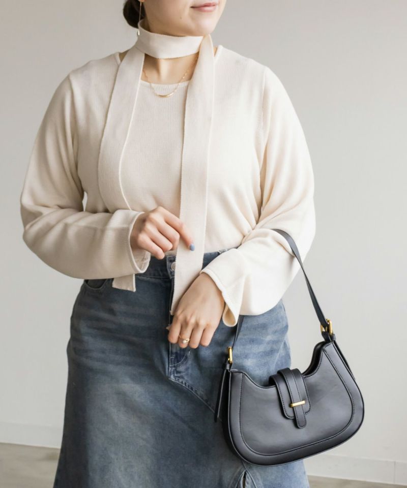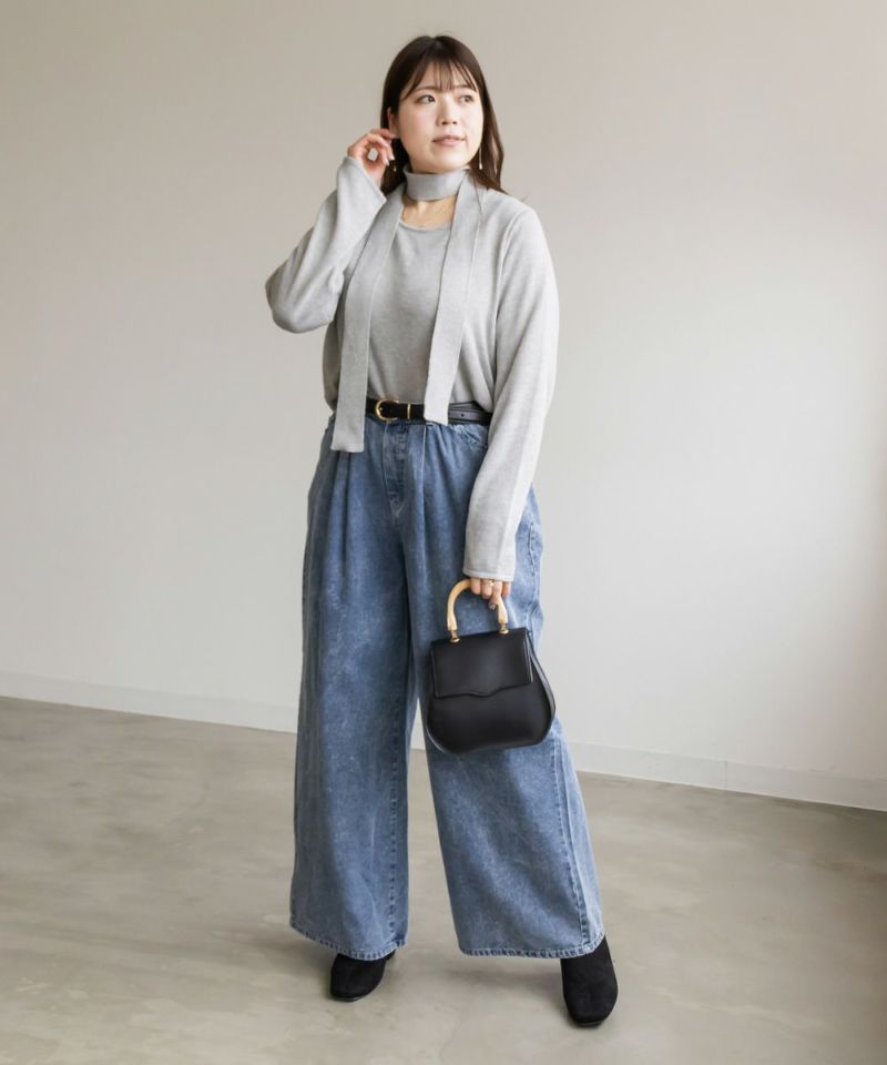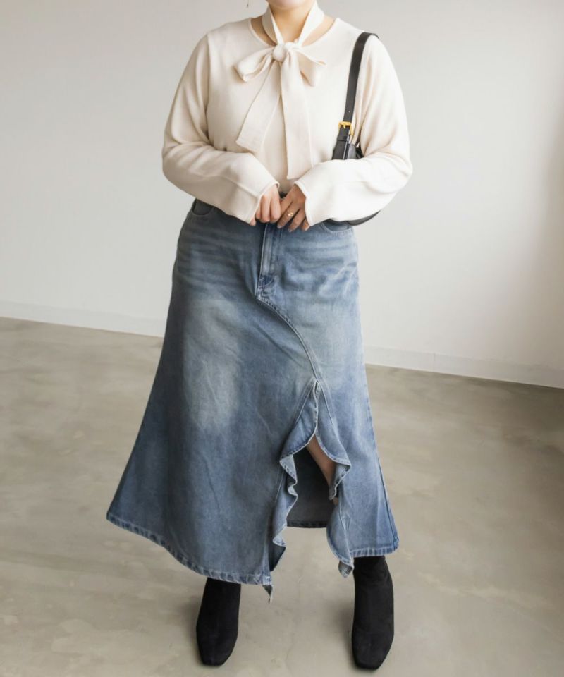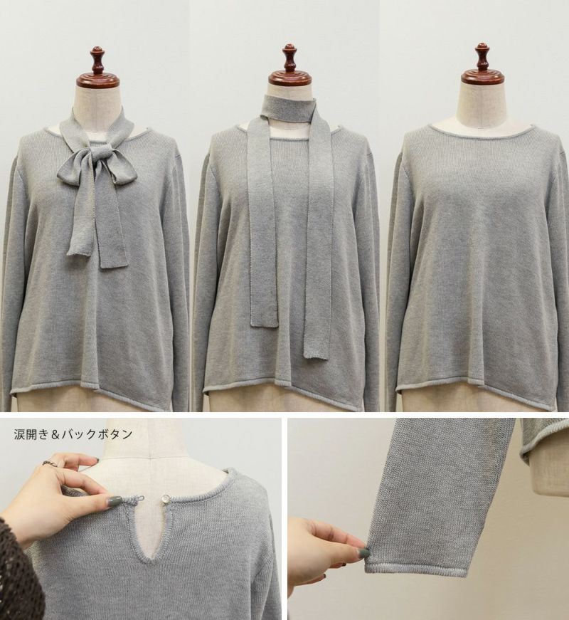 3Lサイズを着用して少しゆとりのある着心地もでした。ニットなので伸縮性もあり楽な着心地でした。秋~春大活躍しそうなニットです!マフラーのようなボウタイがついていて、共地なのですっきりお洒落な雰囲気になれます!首にくるっとして垂らしたらとっても今っぽいコーデになります♪リボン結びをしてもまた違った雰囲気でガーリーになります!トップス自体はシンプルなのでどんな雰囲気のアイテムとも合わせやすいです◎