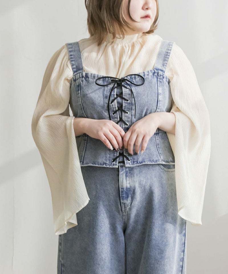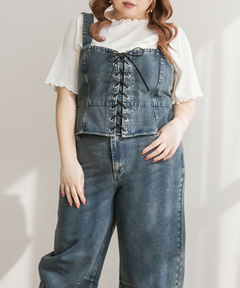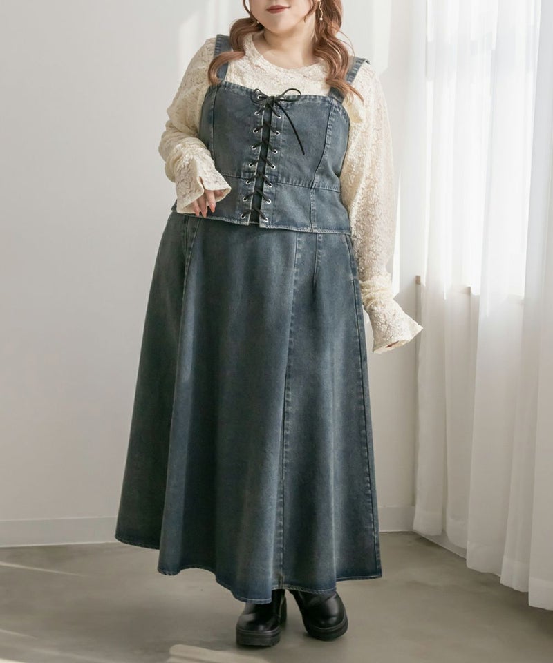 3Lを着てちょうどいいサイズでした!大きいサイズでこういったデザインのデニムビスチェはなかなかないので嬉しい1枚です!ボディラインを拾わないしっかりとしたデニム素材でフロントのレースアップリボンがメリハリがある印象で華奢見えします♪すっきりして見えるよう考えられたデザインなのが嬉しい◎後ゴムになっているからサイズの心配も少なく、楽ちんに来ることができます。心配な方はバストサイズの確認をお勧めします。ぽっこりおなかも気になりづらいペプラムっぽい切替が入っていて、おしゃれだけじゃない考えられた1枚です!オールシーズン着回しできて、ワンピにもスカートにもパンツにも、たくさんファッションを楽しめます!パンツとスカートはセットアップでも着られるので今っぽいスタイリングが楽しめます!