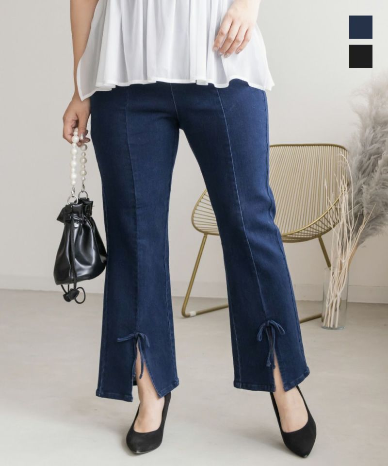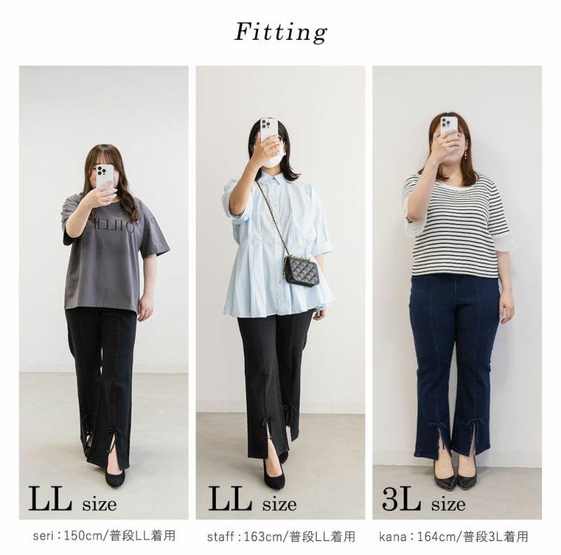 LLを着てちょうどいいサイズでした。股上が浅くなくしっかりとあって、ウエストゴムで生地自体の伸縮性もあるので安心感のある履き心地◎足部分もしっかりストレッチがあるので動きやすいです◎リボンとスリットがポイントのデザインで、デニムでもカジュアルになりすぎずに女性らしい印象になれます。太もも周りすっきりで裾がフレアになっていて、穿くだけで美脚になれちゃいます!オールシーズン使えるので、1本あると便利なデニムパンツです。
