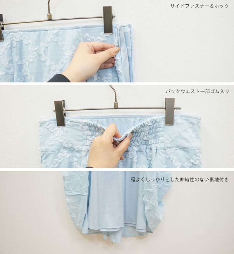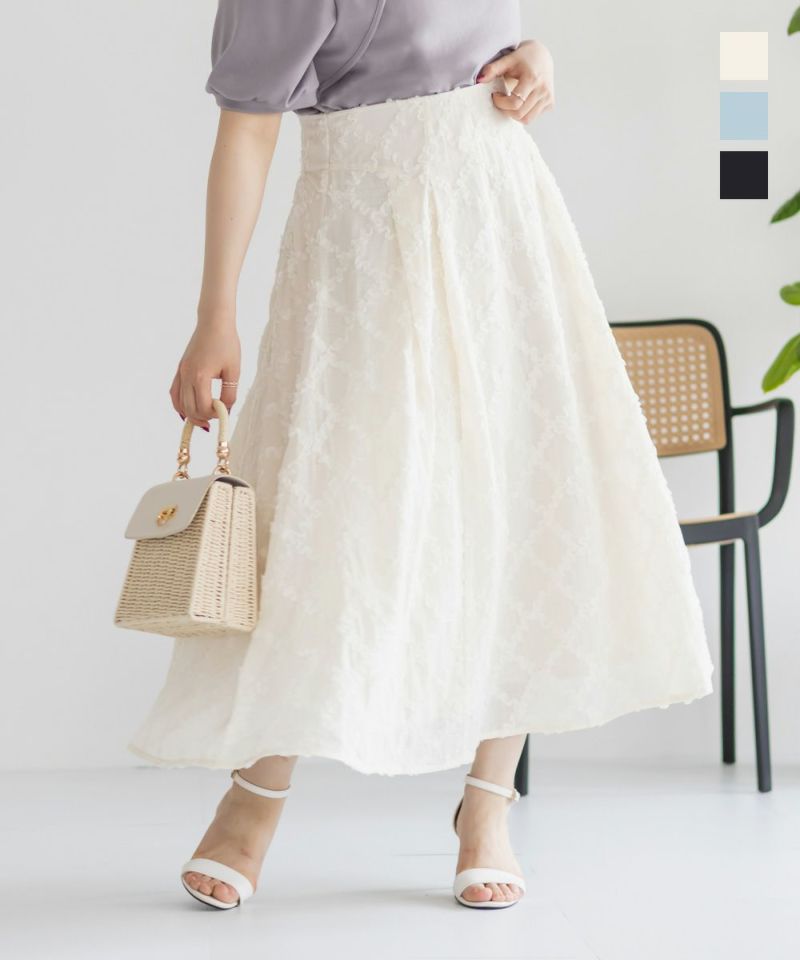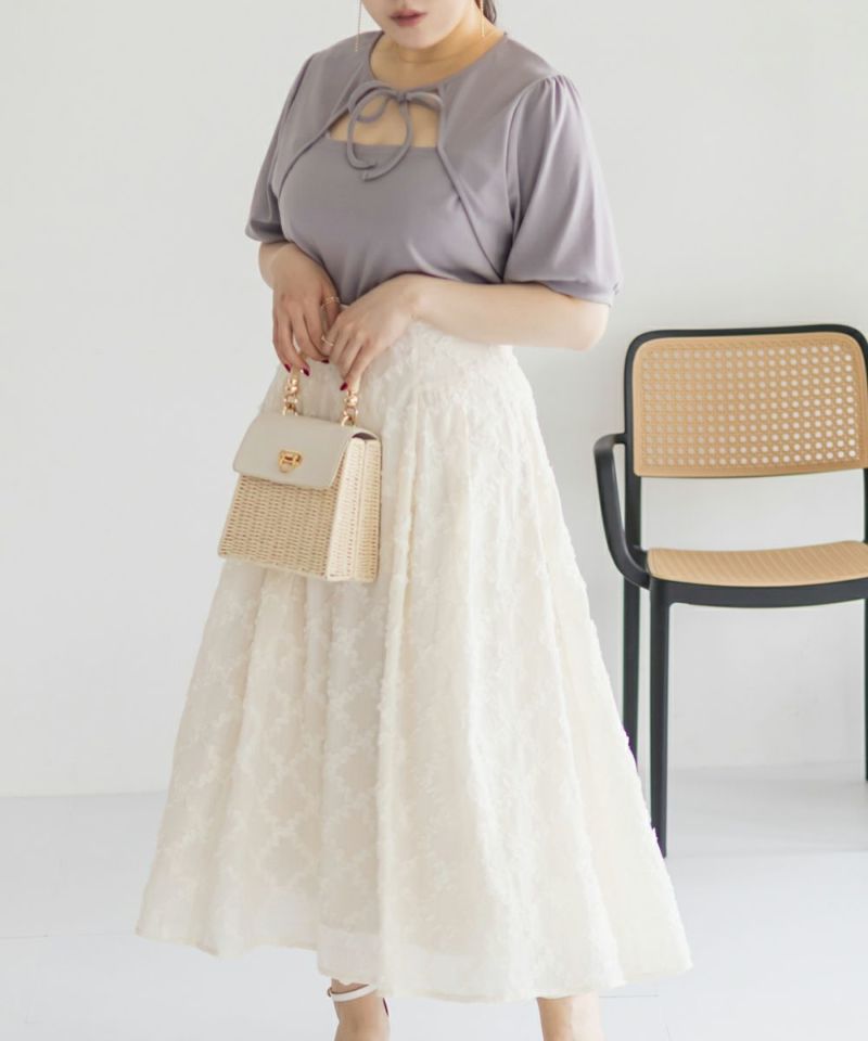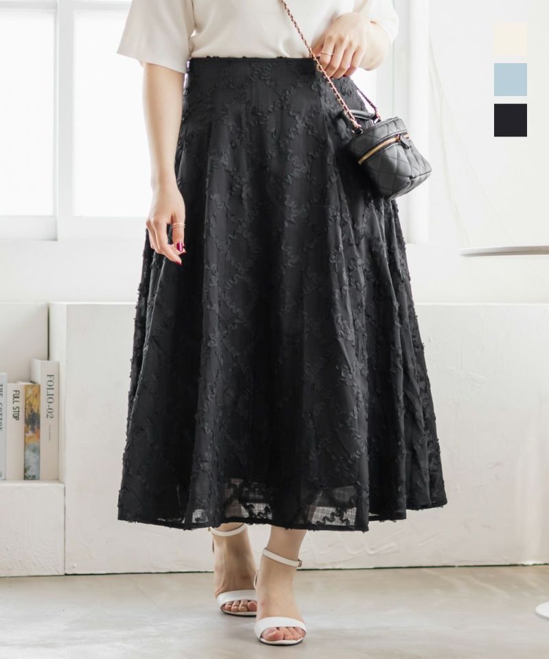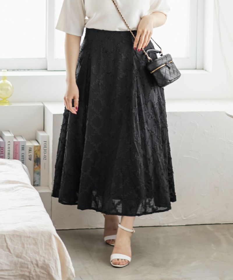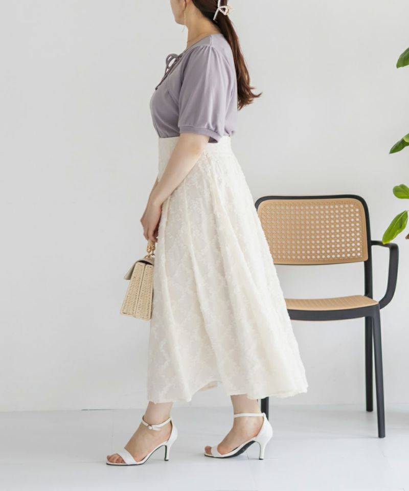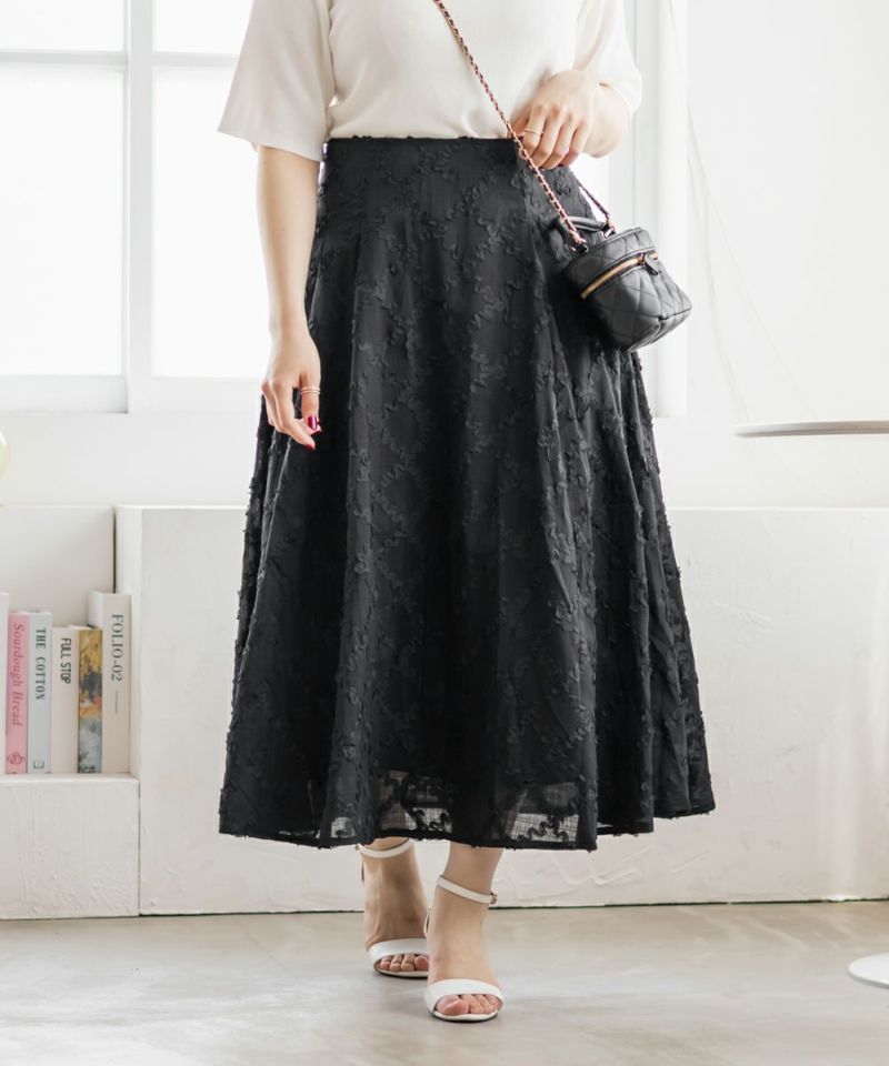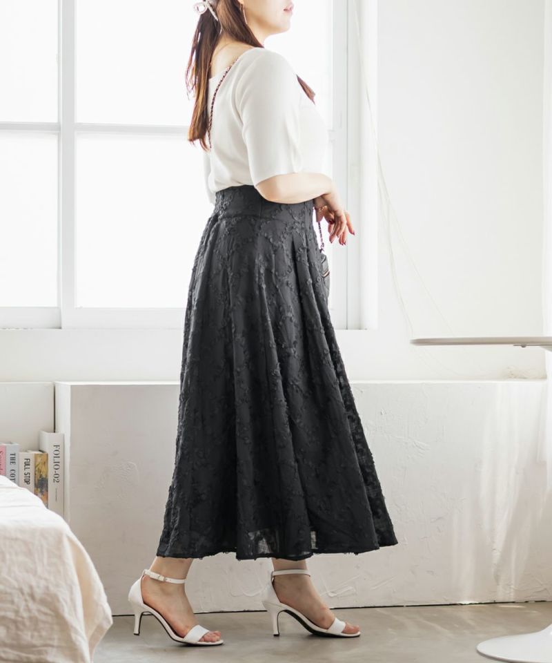 3Lサイズを着てみて丁度いいサイズでした!ウエストがキュッとして見えるハイウエストのデザインで着やせ効果が抜群なスカートです!ヒップや太ももなどが気になる方でも、裾に向かって綺麗に広がるシルエットのおかげでボディラインを拾わずスタイルアップして見えます。上品で大人っぽいシルエットと何より生地がとってもかわいいです♪凹凸があるのでシワも気になりにくいのが嬉しいです!甘すぎず、コーデに取り入れやすいので、上品な雰囲気にもガーリーにもなれます◎デイリーにもお出かけにも使える主役スカートです!