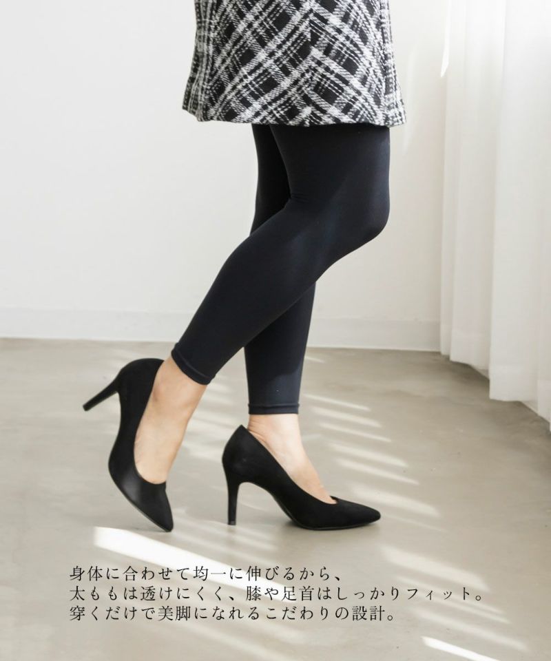 3L-4Lサイズを着用しました。商品を手に取ると見た目が通常サイズ(Mサイズなど)と変わらないので「これは本当に大きいサイズの人向けなのか?」と疑ってしまったのですが、穿いてみると驚くほどよく伸びて、快適な着心地で体型にフィットしてくれました!お腹やお尻の伸びが足りなくて下がってくることもないし、太もも、ふくらはぎ、足首まで色ムラなく綺麗にピタッとしてくれるのが嬉しいです!普通のレギンスだとお腹周りや太ももに窮屈感を感じる、所々薄くなって気になる、膝あたりや足首だけだぼつく、、、など体型によって色々な悩みがあると思いますが、どんな体型の人でも快適に、美脚に穿ける一品です◎あと私は真冬でもタイツではなくレギンスと靴下を合わせるのが好きなので(足に2枚着ている感覚が苦手!)オールシーズン使えるお気に入りのレギンスができて嬉しいです♪