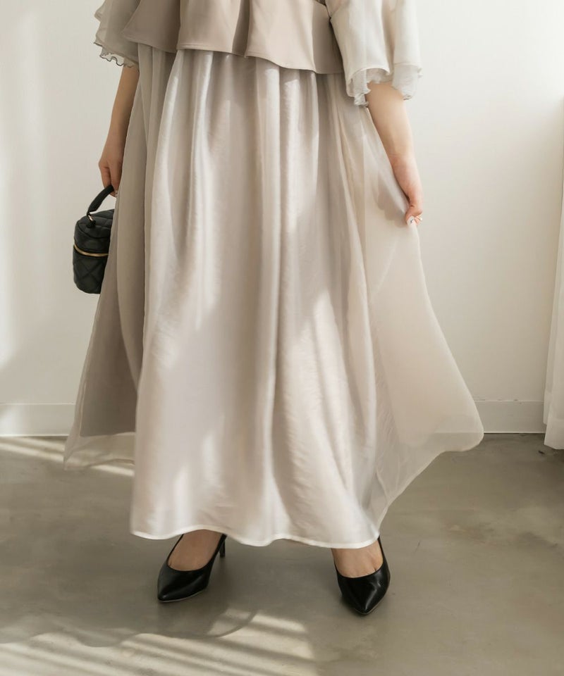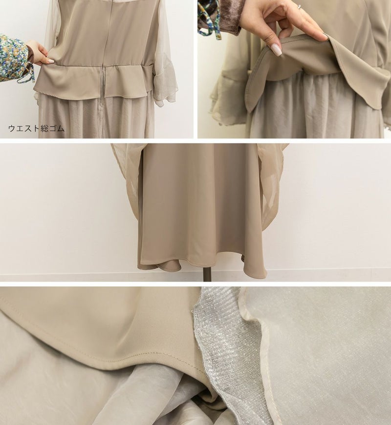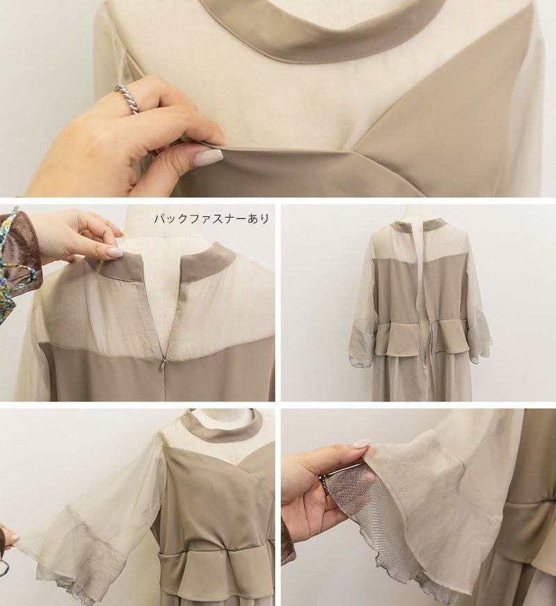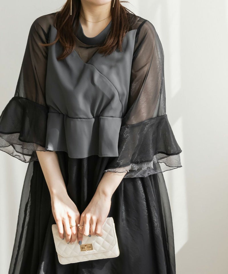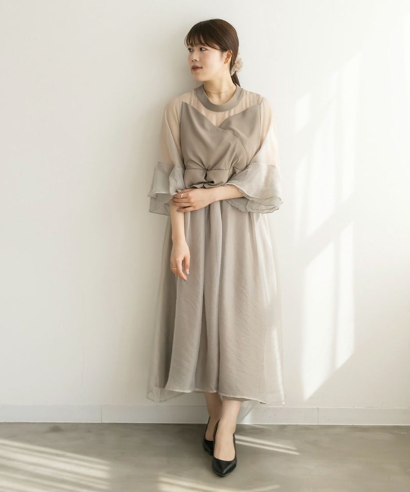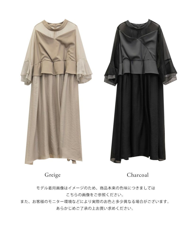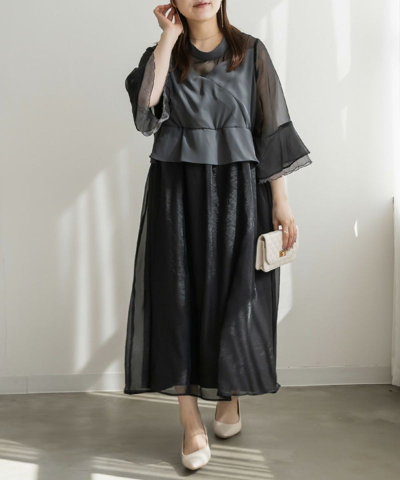 3Lサイズを着用して、ちょうどいいサイズ感でした♪ 軽やかなシフォン素材と程よい光沢感のある生地が上品で、オケージョンシーンにぴったり◎ フレアスリーブが華やかで、腕まわりをふんわりカバーしながら女性らしい印象に。ペプラムデザインがウエストラインを引き締めて見せてくれるので、メリハリのあるシルエットで着こなせました♪ 結婚式やパーティーはもちろん、ジャケットを羽織ればフォーマルなお仕事シーンにも◎ 1枚で華やかに決まる、大人フェミニンなドレスです。