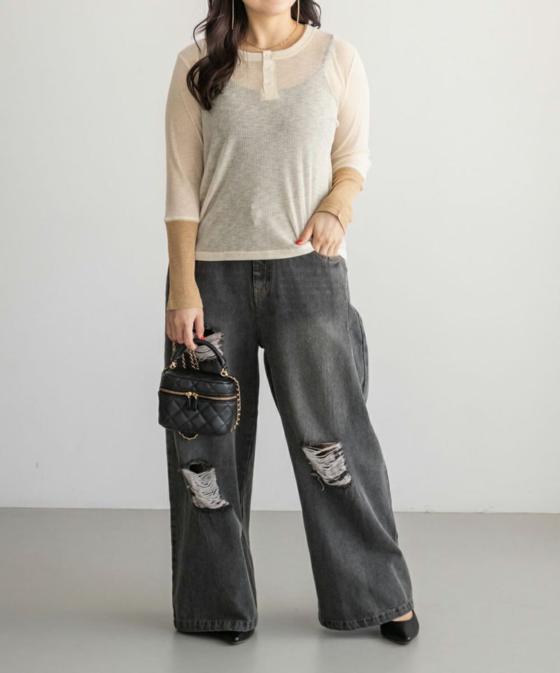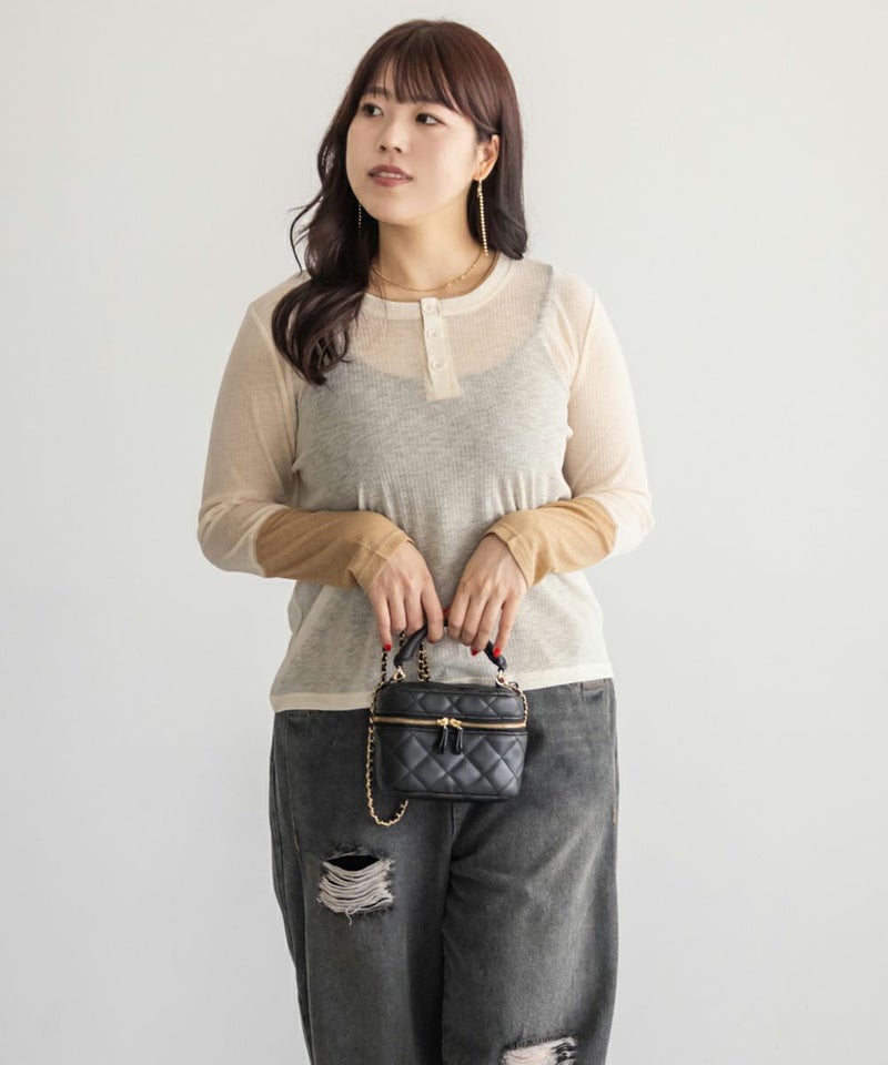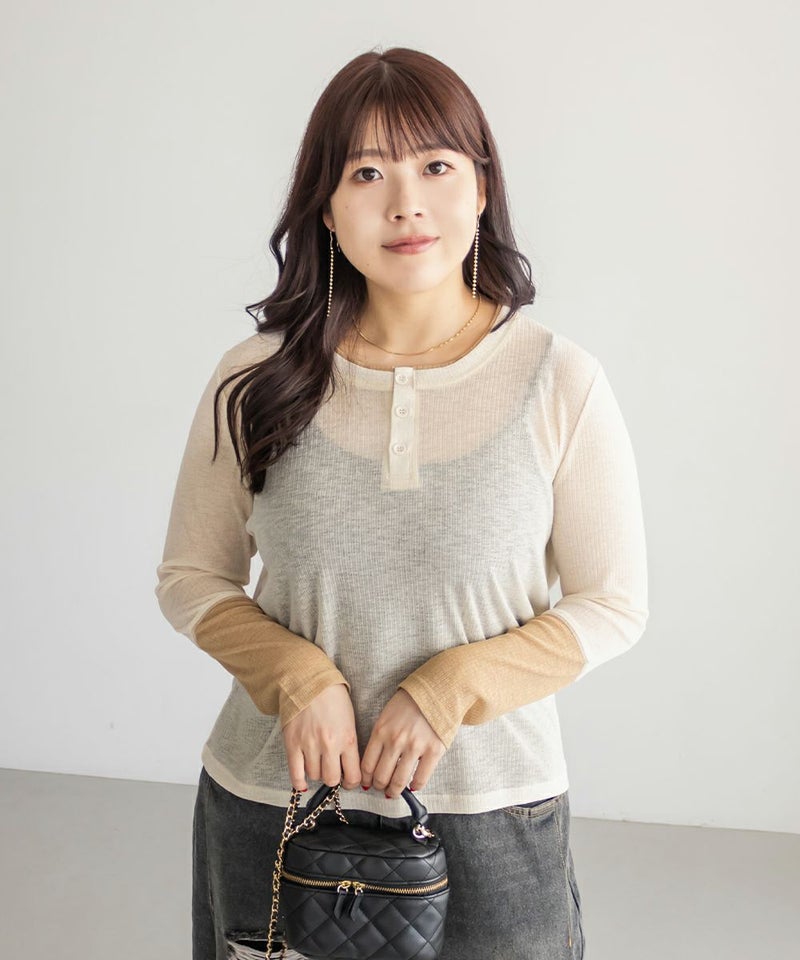 3Lサイズを着てちょうどよい着心地でした。やわらかく軽いさらっとした生地で、窮屈感も全くなく着られます◎透け感があって長袖でも涼しく着られるので、秋らしい着こなしにピッタリです!1枚でさりげないアクセントになる重ね着したようなデザインで、今っぽいヘンリーネックが大人っぽくお洒落な雰囲気です。一枚でも様になり、ワンピなどを重ね着しても可愛いと思います♪ボタンを少し開けて、抜け感のある着こなしもおすすめです。