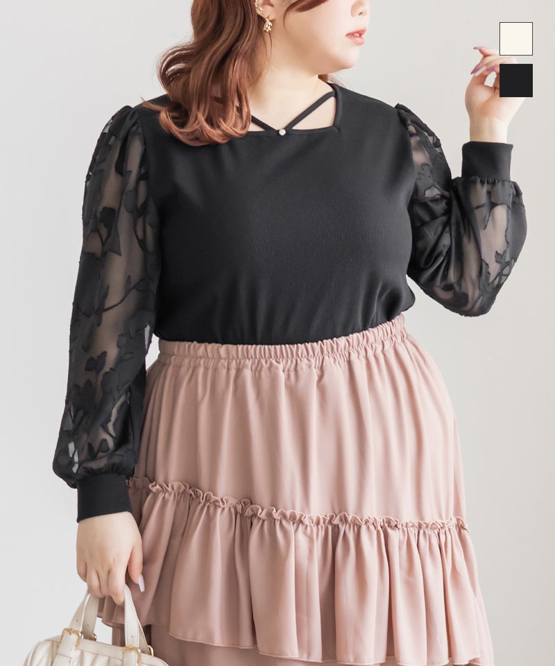 3Lサイズを着て丁度いいサイズ感でした!柔らかなリブのカットソーでストレスのない着心地です◎顔回りを女性らしい雰囲気にしてくれるネックラインで、クロスになっているからメリハリが出て引き締まって見えるのも嬉しいです♪お袖はシアー花柄になっていて、フェミニンな雰囲気たっぷりです!