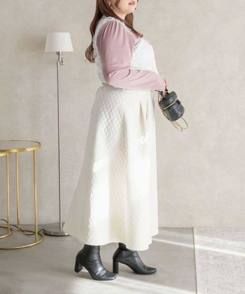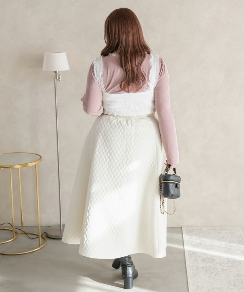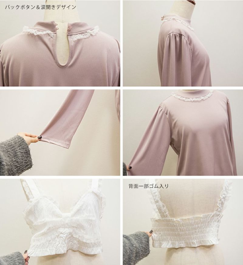 3Lサイズを着用してちょうどいいサイズ感でした!ビスチェはゴム入りだけど生地自体は伸びないのでバストサイズの確認をお勧めします◎トップスとビスチェのセットでそれぞれ別のアイテムと合わせて着ても可愛いです!トップスはサラサラのリブカットソーで着心地抜群です!首元にもレースが施されていて細かいディティールも可愛い♪ガーリーなスタイルになれちゃう1枚です!