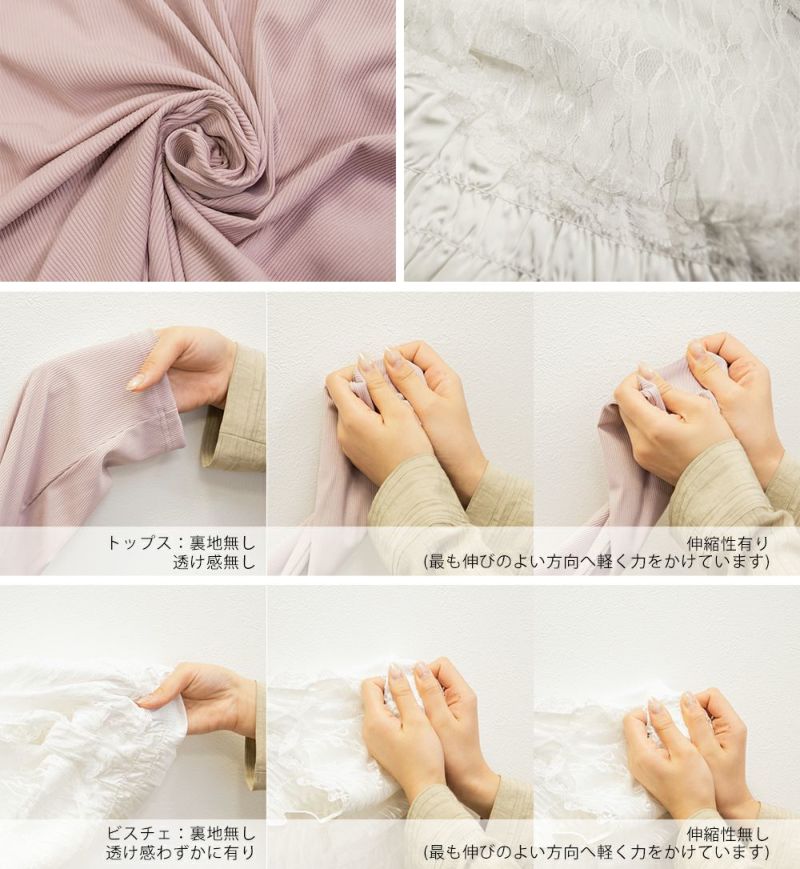 裏地・透け感・伸縮性 ビスチェ:裏地有り、透け感無し、伸縮性無し / プルオーバー:裏地無し、透け感無し、伸縮性有り