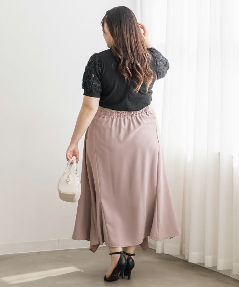 3Lサイズを着用して、ぴったりしすぎず、ちょうどいい着心地でした◎身頃はカットソー素材で柔らかく伸びるので、動きやすさも抜群♪袖は繊細なフラワーレースに切り替えられていて、肌がほんのり透けて見えるのが可愛いです!リボンデザインもガーリーでさりげないアクセントになっていて、甘いコーデがお好きな方にお勧めです◎スカートに合わせるだけで、コーデがパッと華やかになります!