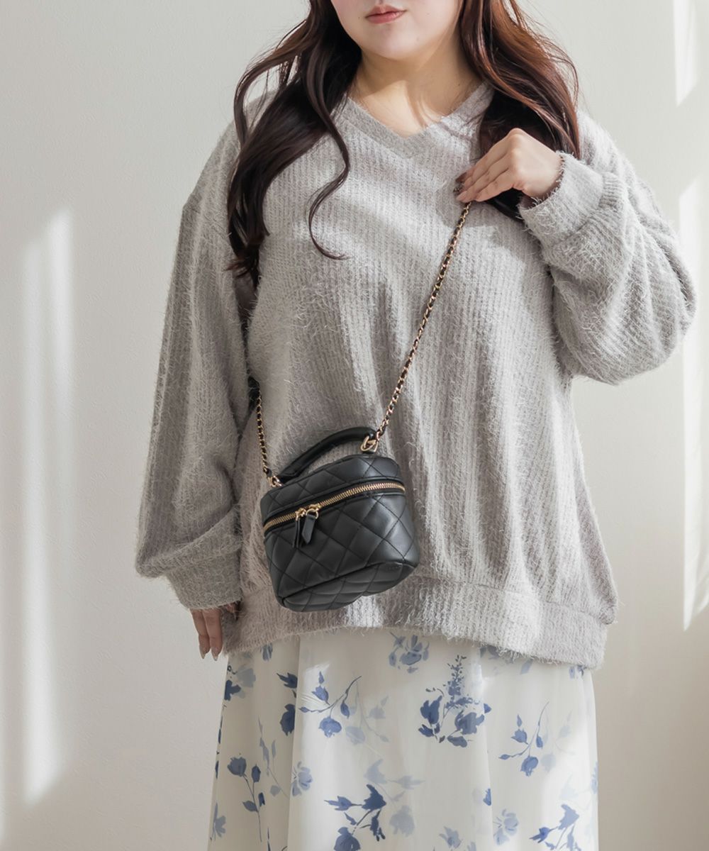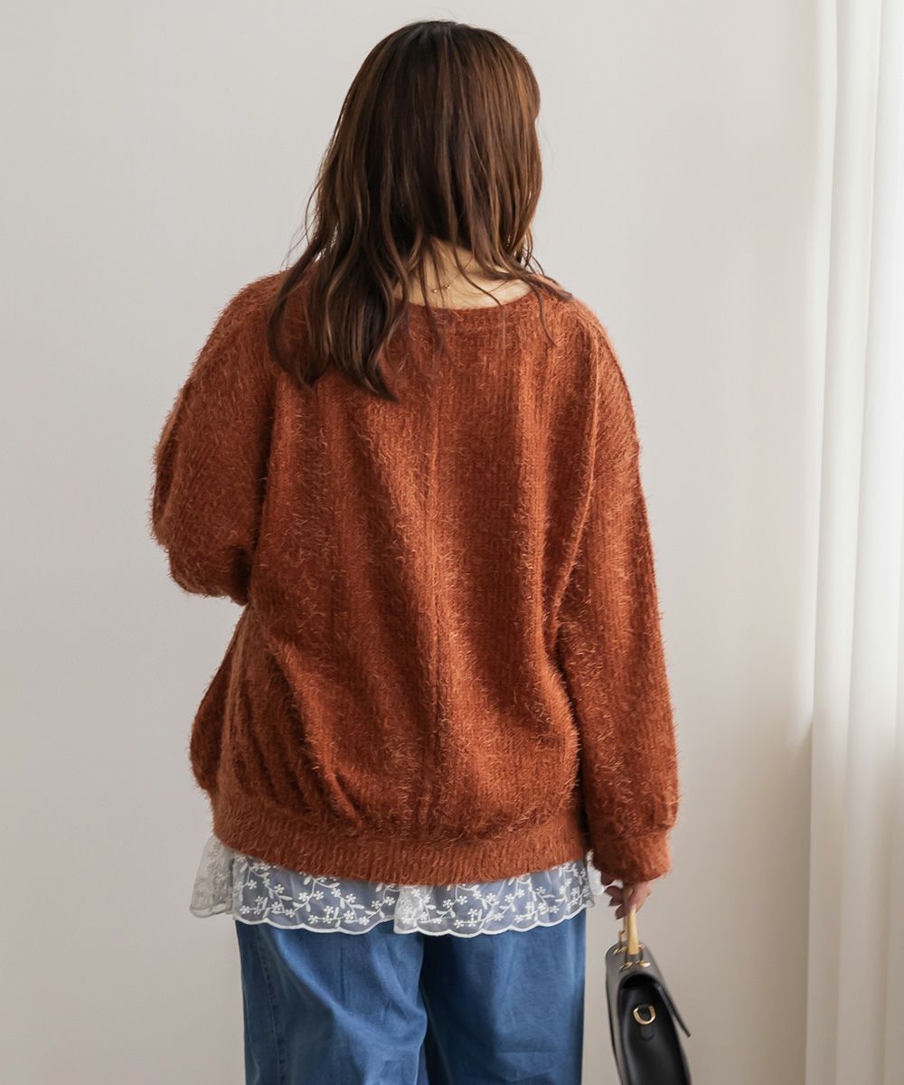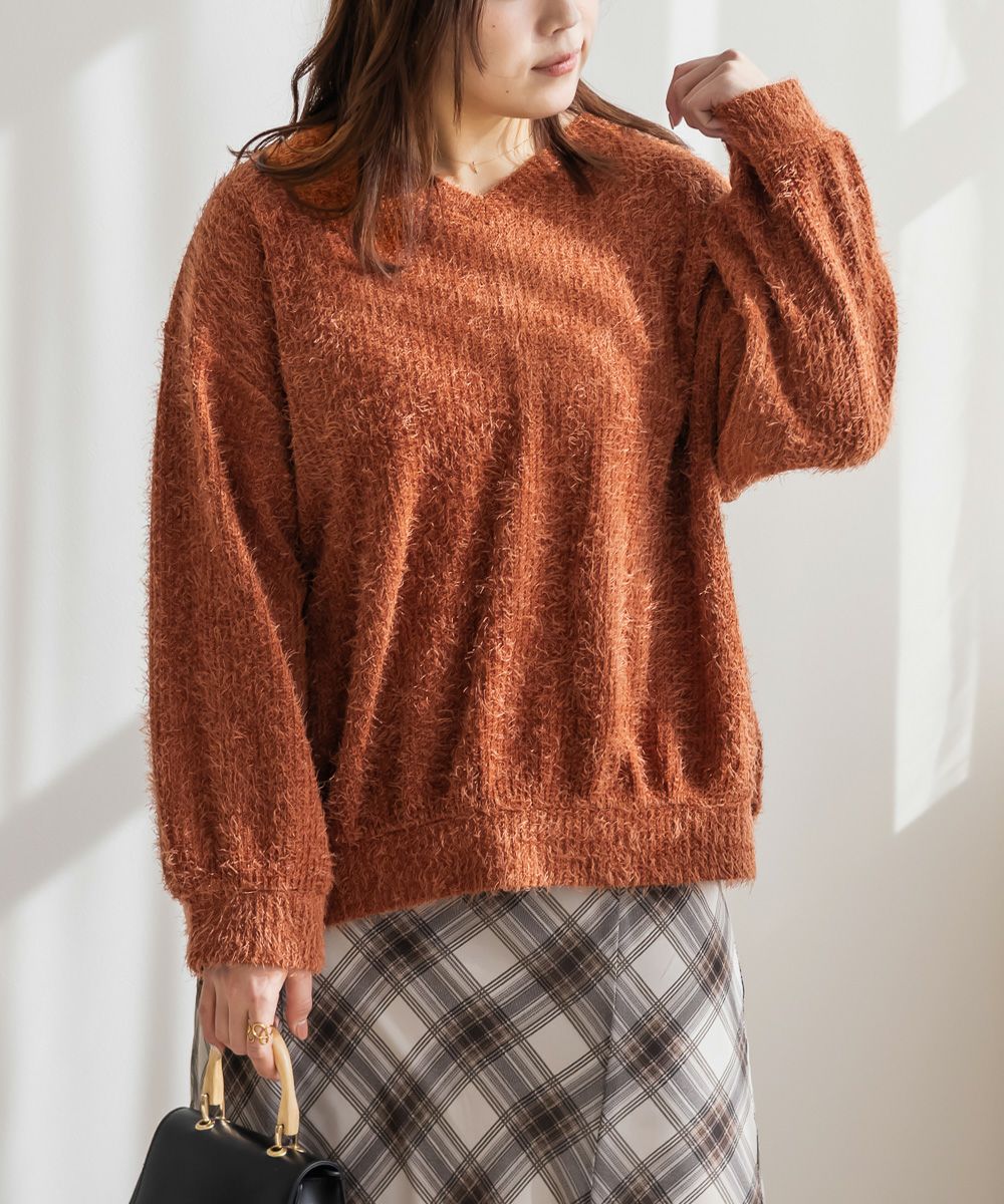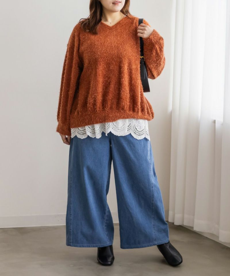3Lを着て程よくゆるっとしたシルエットで着ることが出来ました!いつも通りのサイズ選びで問題なさそうでです◎体も腕回りもゆったりとしたサイズ感で、お尻あたりまで隠してくれる丈なので気になる部分をすっぽりカバーしてくれました!Vネックで顔回りは抜け感があるので、すっきりとした印象で着こなせます。フワフワのシャギー感が可愛いけど厚みが無く軽いので、楽で暑くならないのが嬉しい!パンツにもスカートにも、バランスよくコーディネートできました。色々着回しできる1枚です♪