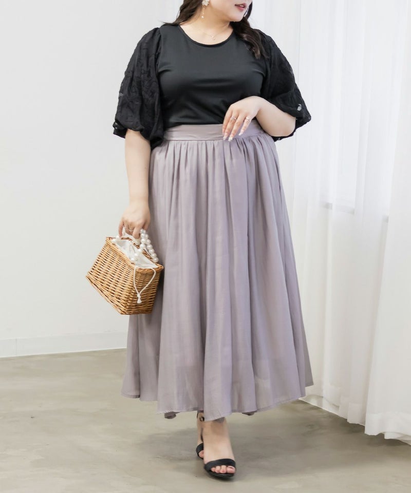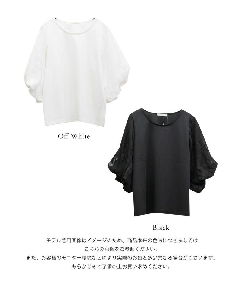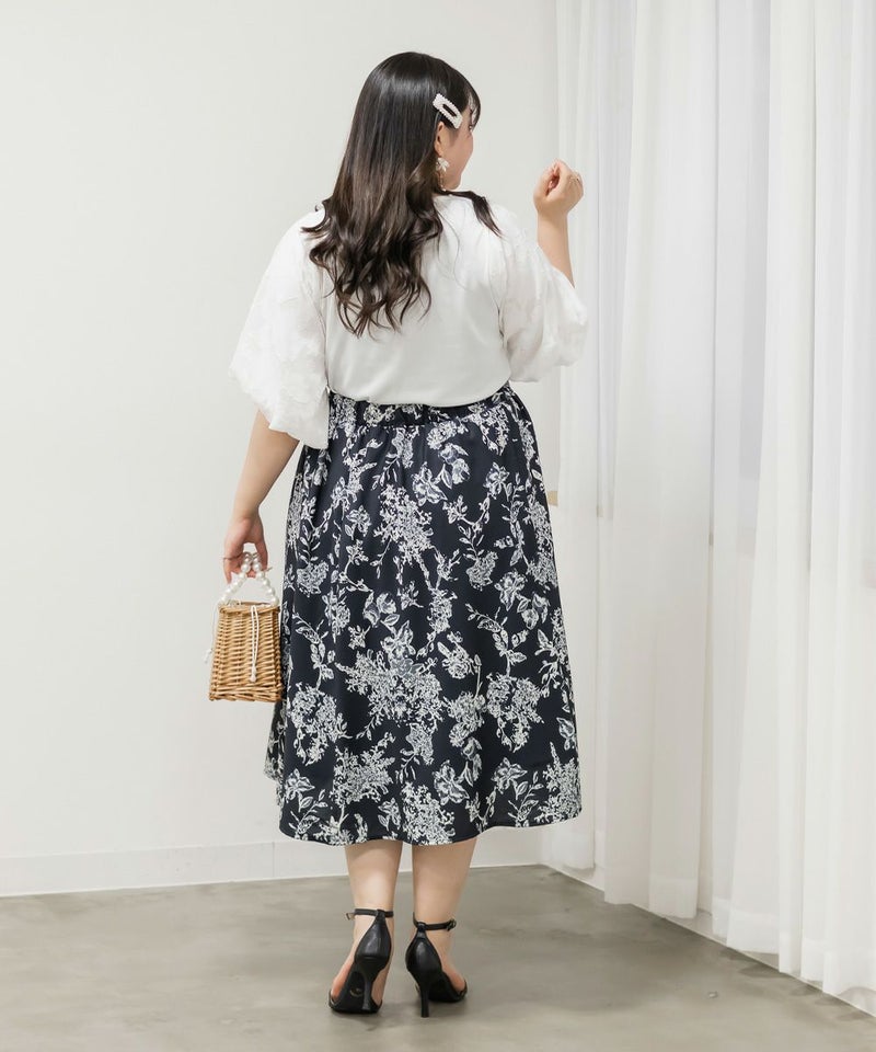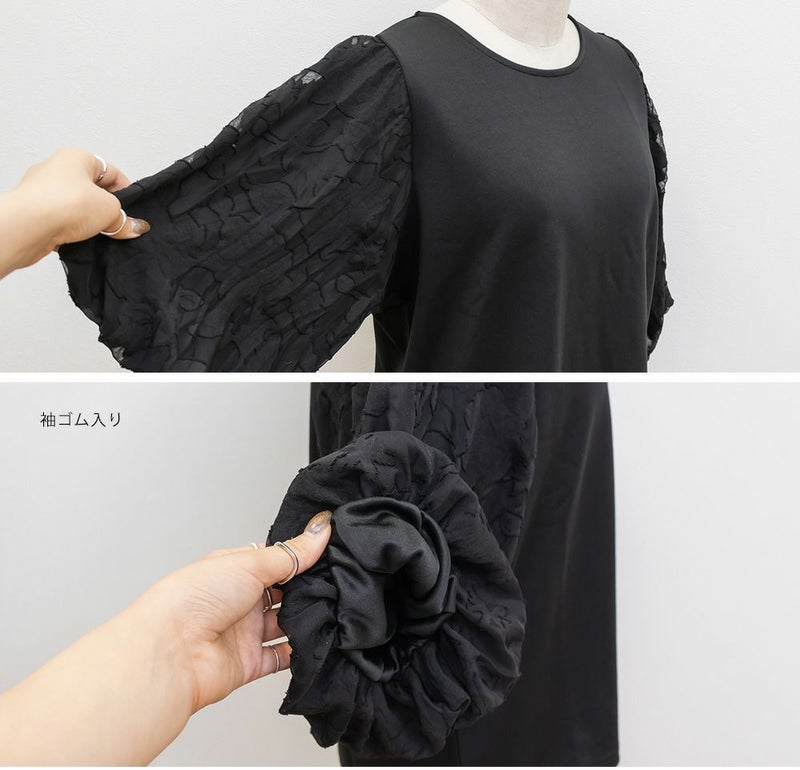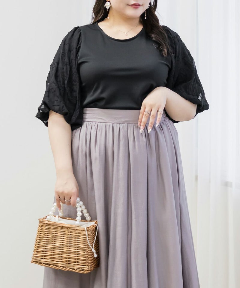 3Lサイズを着用しました。締め付け感のないちょうどいい着心地でした◎ 袖の花柄ジャガードが上品で華やかさをプラスしてくれるので、これ1枚でシンプルながらコーデが華やぐ印象に♪ 身頃は軽い無地カットソー素材で伸縮性があり、動きやすさも抜群です。着丈も長すぎず短すぎずで、スカートにもパンツにも合わせやすく、オンオフ問わず使える万能トップスです!