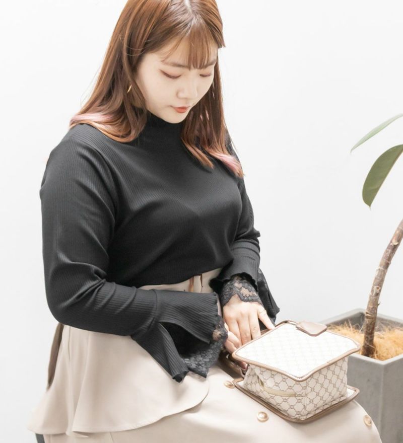 3Lを着てちょうどいいサイズ感でした。二の腕はピタッとしすぎずに、手元はひらりと女性らしいレース使いのフレア袖になっています。プチハイネックが上品で、ワンピースのインナーとしても合わせやすいです◎フェミニンだけど幼く見えない、着心地の良いリブトップスです♪