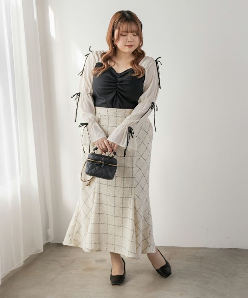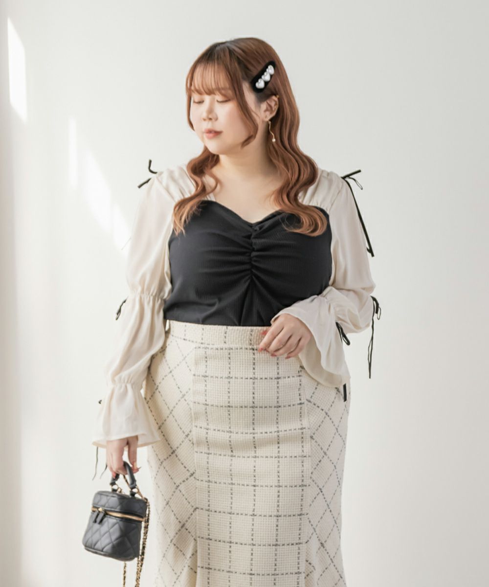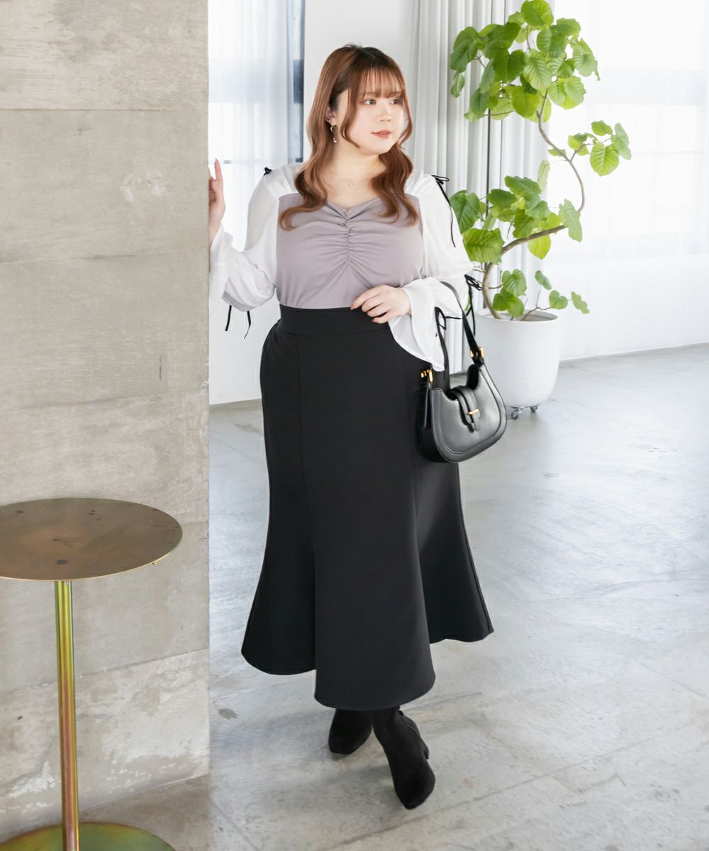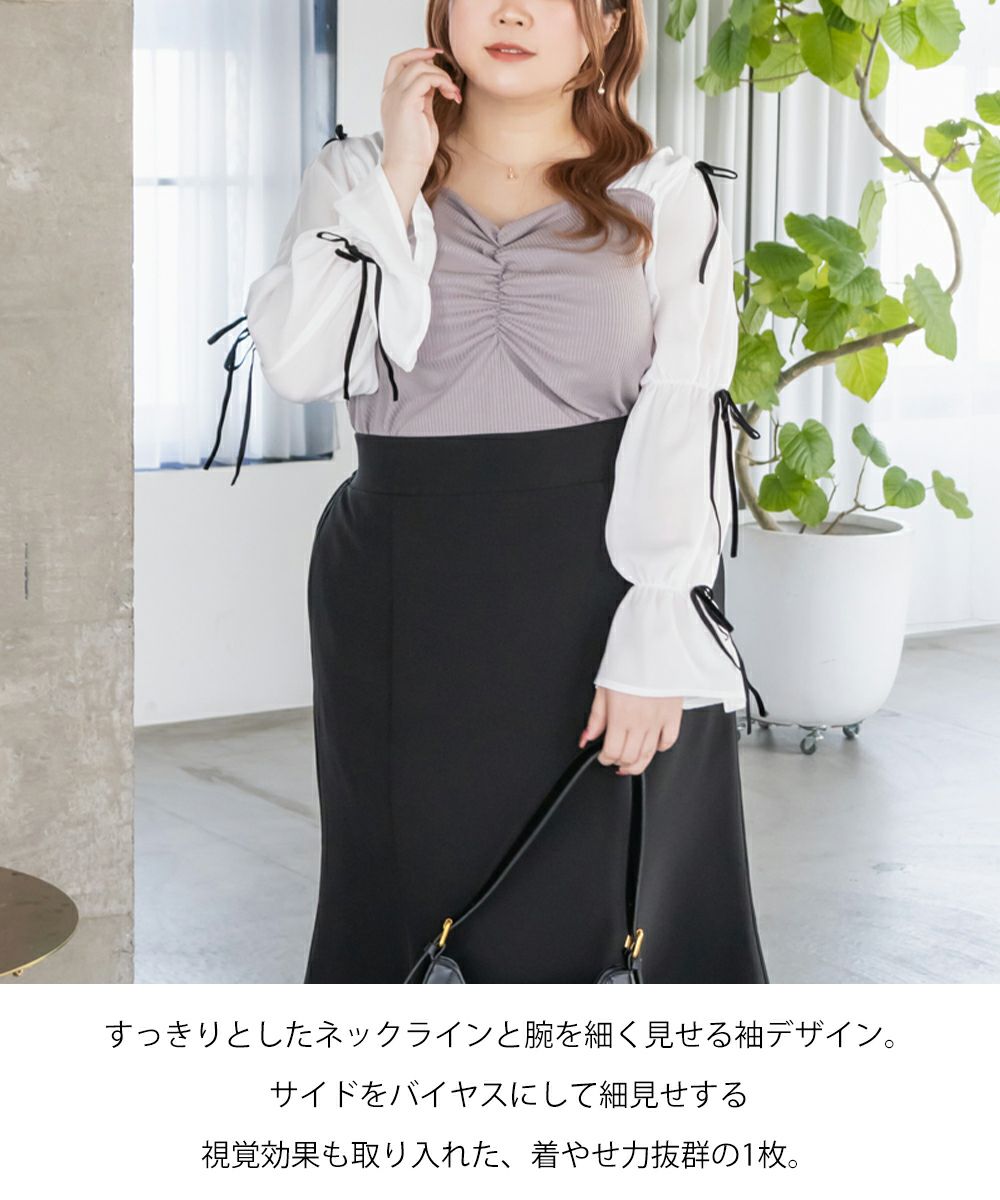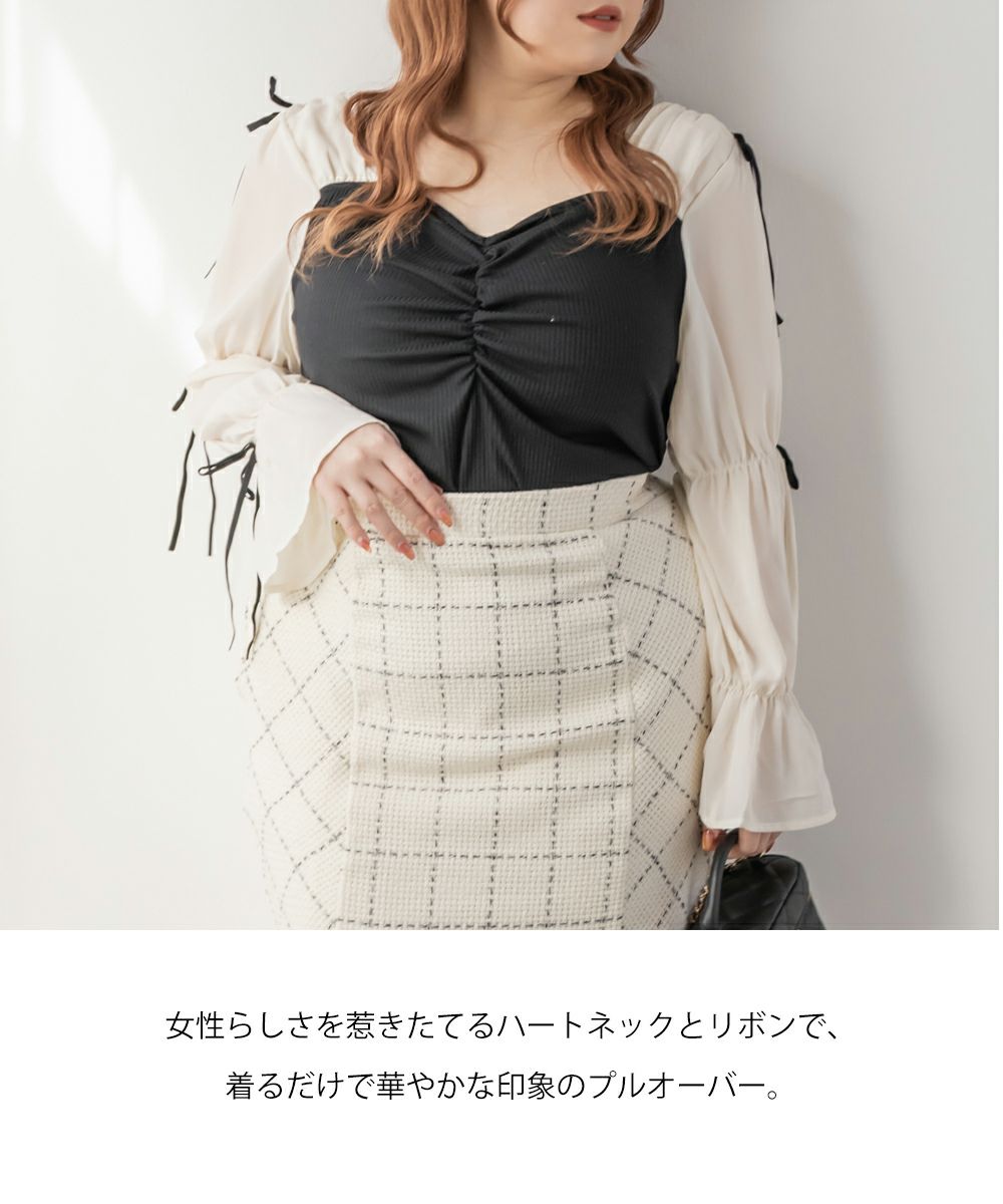 3Lサイズを着用してちょうどよい着心地でした。窮屈に感じるところがなくノンストレスでした。ネックラインはハートに開いていて、フェミニンで顔回りもすっきりとした印象で着られました◎見頃はらくちんなリブカットソーなのもポイント!なにより袖デザインが可愛くて1枚で華やかになれるプルオーバーです♪1枚で主役になるアイテムなのでシンプルなボトムとコーデしても華やかになれます!