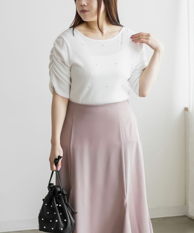 3Lサイズを着用して、フィット感もちょうどよく、リブ素材で程よく身体に馴染んでくれる着心地です。パワショルのデザインでさりげなく肩にボリュームが出るので、華奢見えするのが嬉しいポイント◎二の腕もすっきり見える絶妙なシルエットです。ビーズのアクセントがさりげなく華やかで、シンプルながらもおしゃれ感のある一枚。きれいめにもカジュアルにも使えるので、デイリーに着回せるアイテムです。