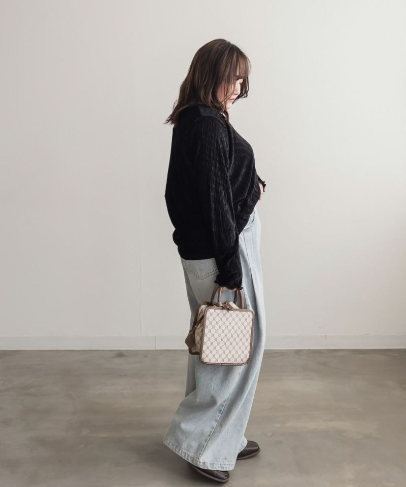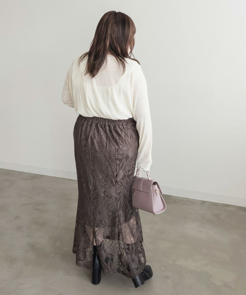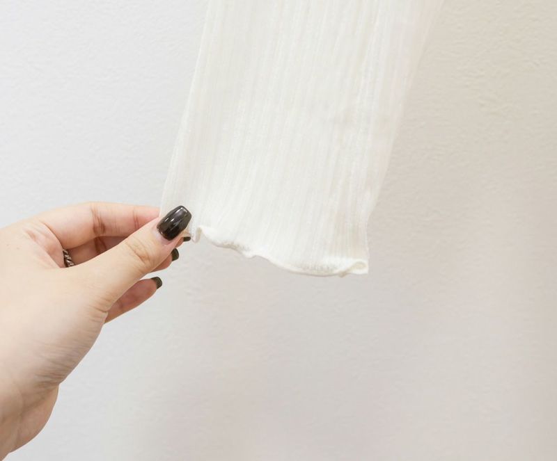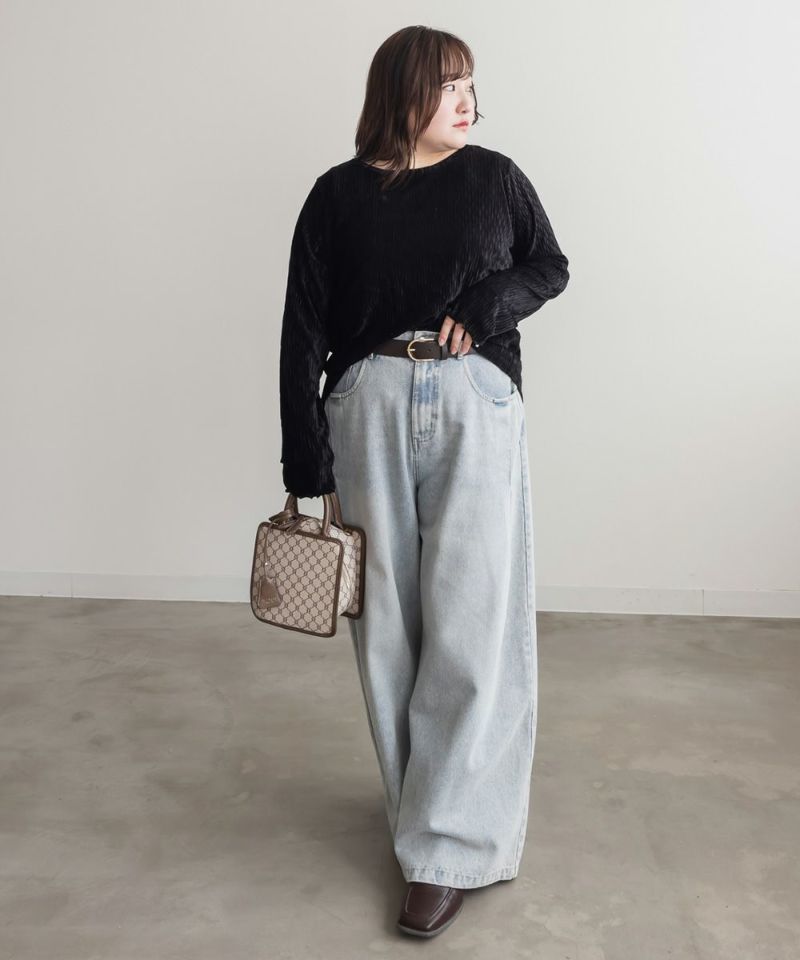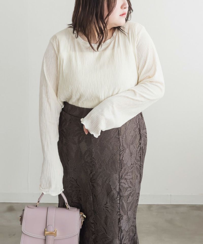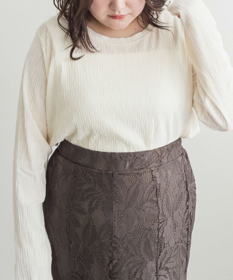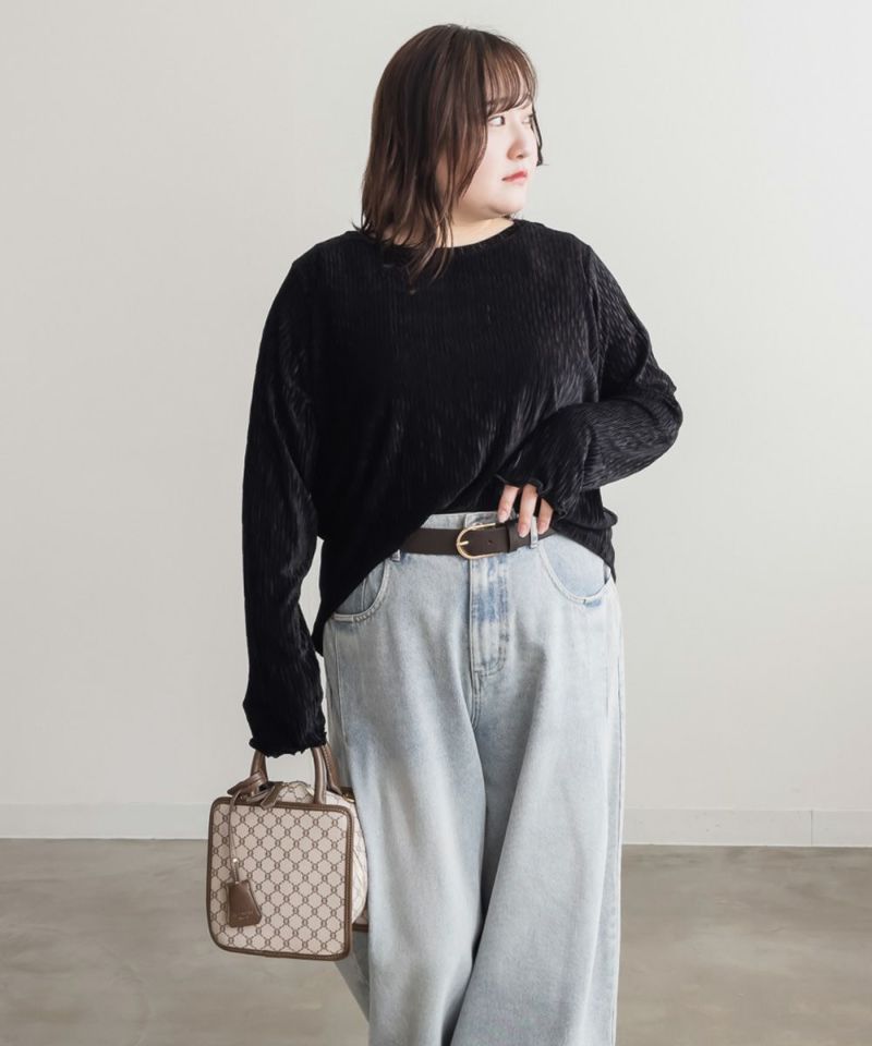 3Lサイズを着用しました。着用感はゆとりのある着心地です!透け感があるベロア生地で重たくならず見た目も着心地も軽さがあるのが魅力です!縦リブになっていてシンプルながらも存在感があり、ボディラインをカバーしてくれます!シアー感があるのでトップスとしてもキャミワンピなどのインナーにしても活躍しそうです♪長いシーズン使えてシンプルな形なのでたくさん着回しが出来そうです◎
