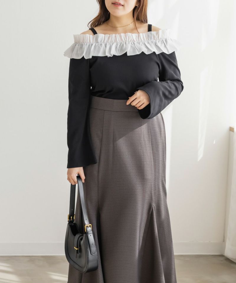 3Lを着用してちょうどいいサイズ感でした。程よく薄手のカットソーで伸びもあってとても楽に着られました!デコルテがすっきりと開きながら、下着の肩紐が見えないようなデザインになっているのがポイントでインナーに困らないのが嬉しいです。女性らしい肌見せが叶う1着です◎胸元のフリルはフェミニンさとメリハリをプラスしてくれて、とってもかわいいです♪袖先は少しフレアに広がっていて手元もおしゃれで可愛いです。丈はタックインせずに着られるのでパンツともスカートも相性のいいので、1枚持っておきたいトップスです!