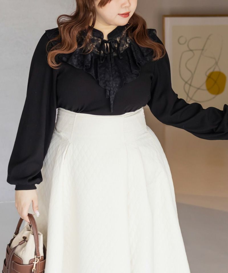 デコルテ部分がレースで切り替わったフェミニンなデザインの、フリルとリボンがポイントのカットソープルオーバー。ちらりと肌見せできるレースの透け感が女っぽさを上げてくれる。二の腕を細く見せるゆとりのある袖デザインと、顔回りをシャープに見せるVラインに切り替わったフリルもポイント◎