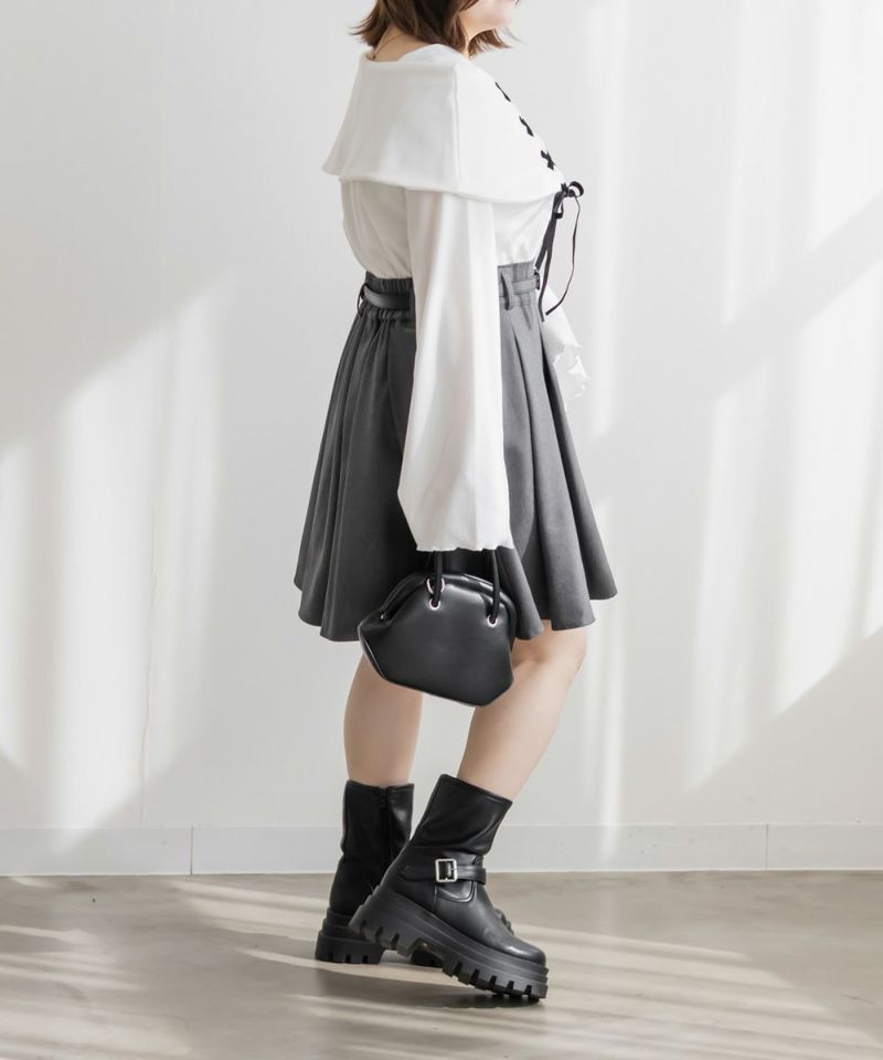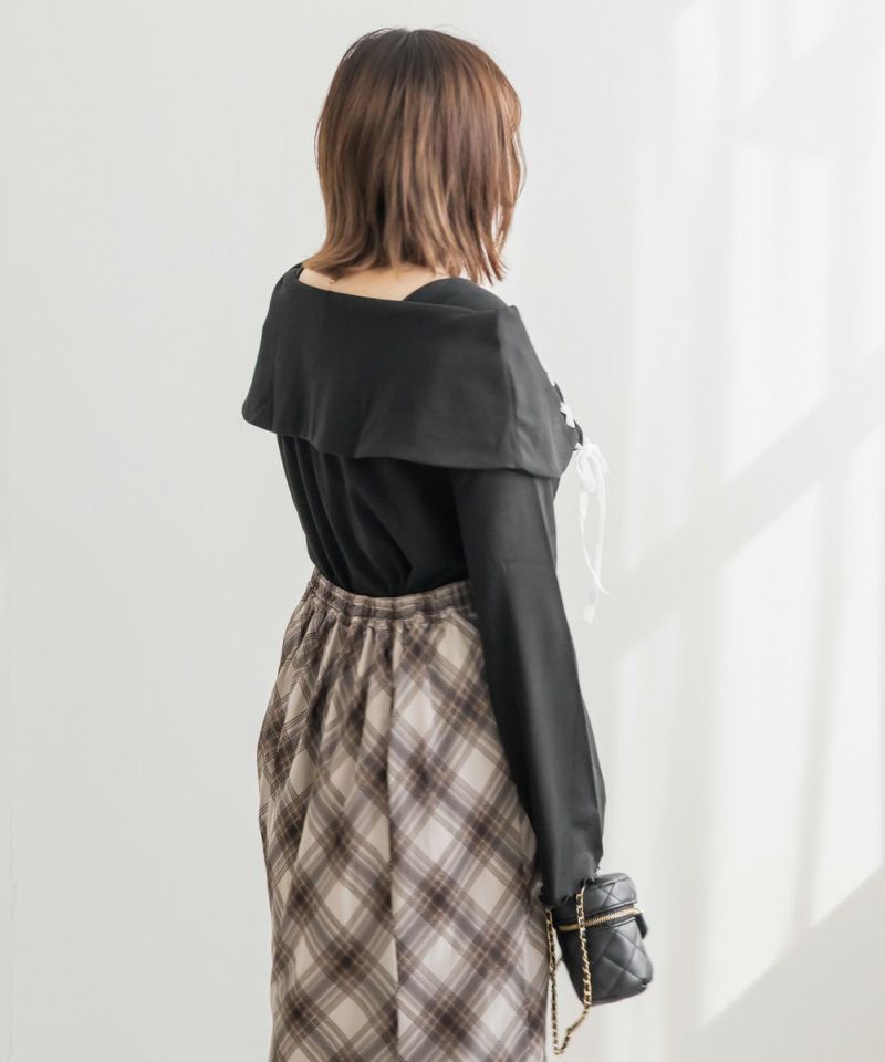 LLを着用してちょうどいいサイズ感でした。ネック回りが綺麗に開きながら、下着の肩紐が見えないようなデザインになっているのがポイントでインナーに困らないのが嬉しい!オフショルは苦手だけど女性らしいデザインを探している方におすすめです♪レースアップのリボンがアクセントになっていて、メリハリのあるすっきりとした印象になれます!袖もフレアに広がっていて女性らしさたっぷりで手元もおしゃれで可愛い◎丈はタックインせずに着られるのでパンツともスカートも相性のいい1枚持っておきたいトップスです!