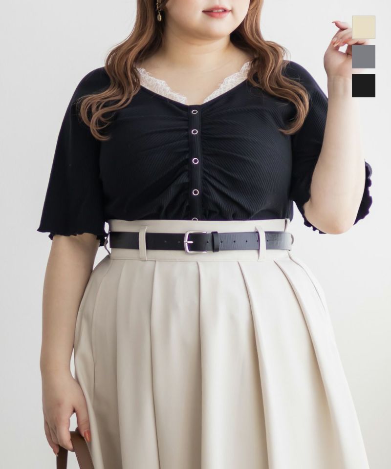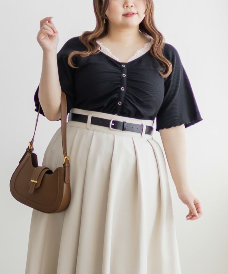 3Lサイズを着用しましたが、ちょうどいいサイズ感でした◎伸縮性のあるリブカットソー生地が快適な着心地で、軽やかに着られるので春夏にもぴったりです!胸元のレースキャミを重ね着したようなデザインが今っぽく、コーデに甘さをプラスしてくれて、1枚でレイヤード風のスタイルが完成するのが嬉しいポイントです!身頃はボディラインをカバーしてくれるふんわりとしたシャーリングになっていて、お洒落さと着?せを両立してくれます♪デニムやワイドパンツと合わせて、カジュアルガーリーなコーデを楽しみたいです!