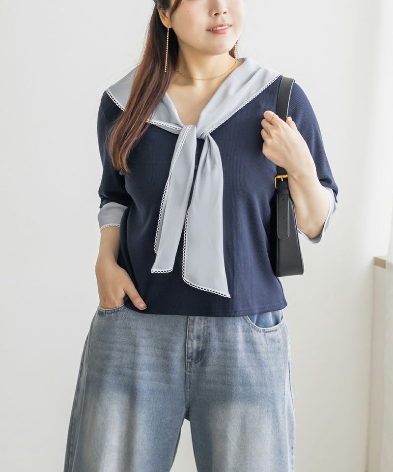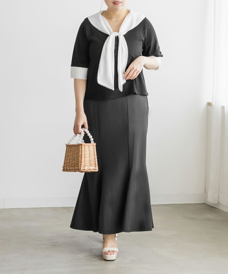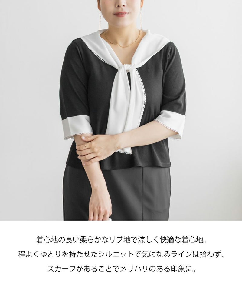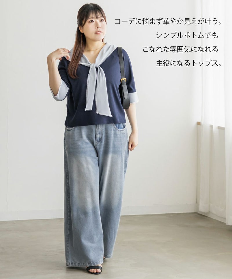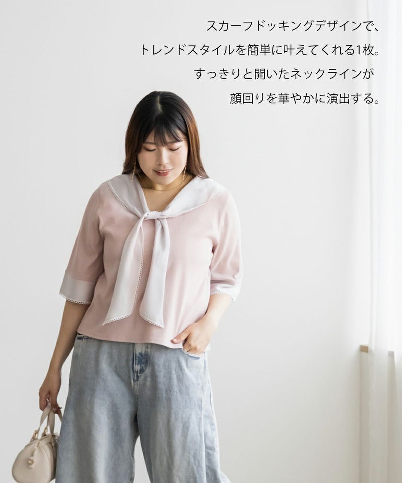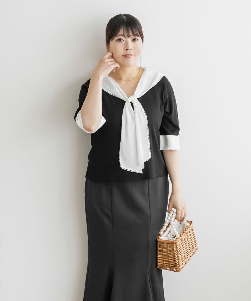 3Lサイズを着て、バストまわりや腕もほどよくゆとりがあり、体のラインを拾わず快適な着心地でした!薄手で柔らかなリブカットソーで、真夏でも涼しく着られます◎1枚でコーデが華やぐ、主役級プルオーバーです!胸元にあしらわれたスカーフ風デザインが目を引き、レイヤード風のディテールで着るだけでおしゃれ感がアップします!裾はタックアウトでもバランス良く決まり、オンにもオフにも活躍しそう♪スカーフがあることで背中周りもカバーしてくれます!トレンドのスカーフを取り入れやすいデザインなので今っぽく決まります◎デニムには勿論、スカートとも相性抜群です!