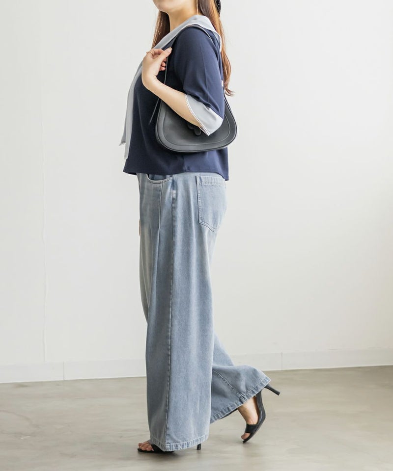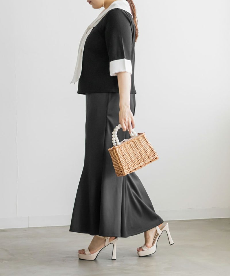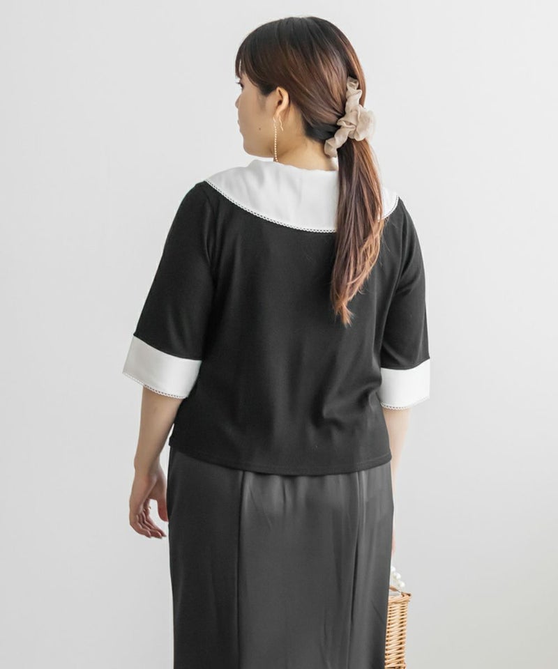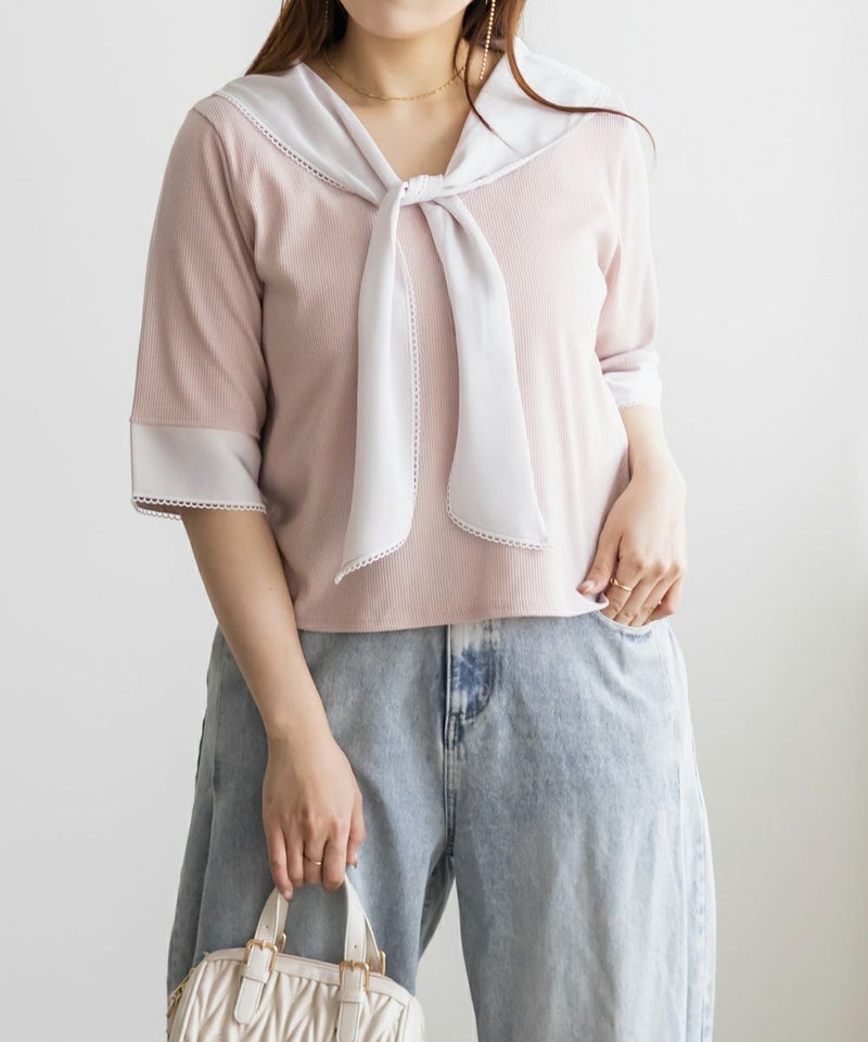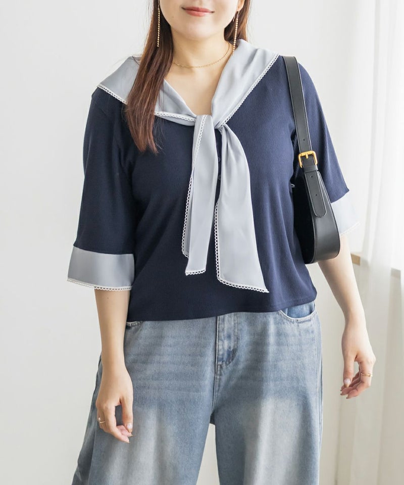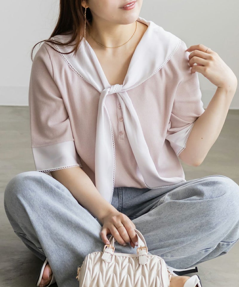3Lサイズを着て、バストまわりや腕もほどよくゆとりがあり、体のラインを拾わず快適な着心地でした!薄手で柔らかなリブカットソーで、真夏でも涼しく着られます◎1枚でコーデが華やぐ、主役級プルオーバーです!胸元にあしらわれたスカーフ風デザインが目を引き、レイヤード風のディテールで着るだけでおしゃれ感がアップします!裾はタックアウトでもバランス良く決まり、オンにもオフにも活躍しそう♪スカーフがあることで背中周りもカバーしてくれます!トレンドのスカーフを取り入れやすいデザインなので今っぽく決まります◎デニムには勿論、スカートとも相性抜群です!