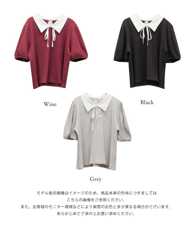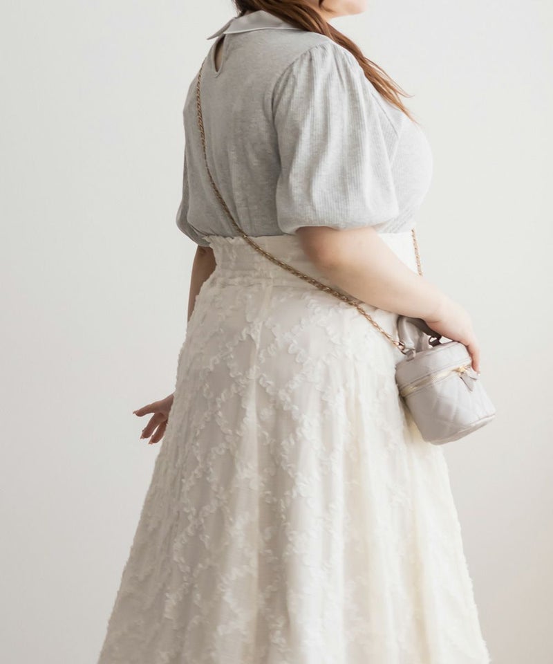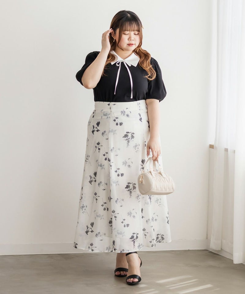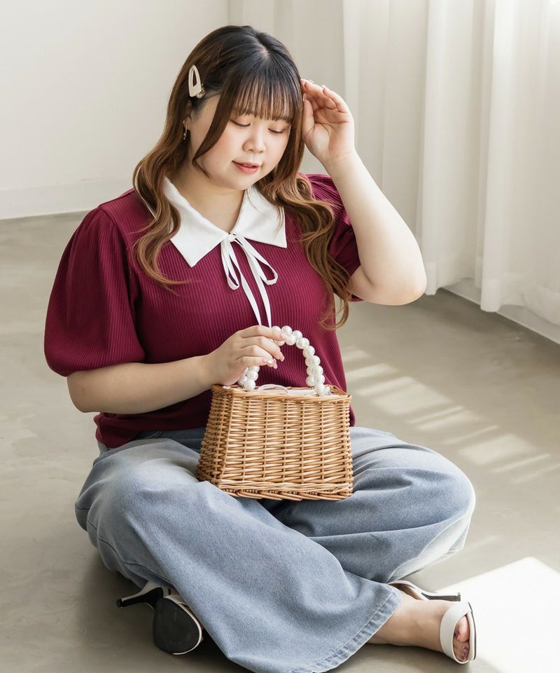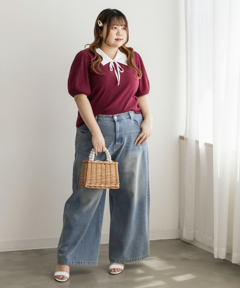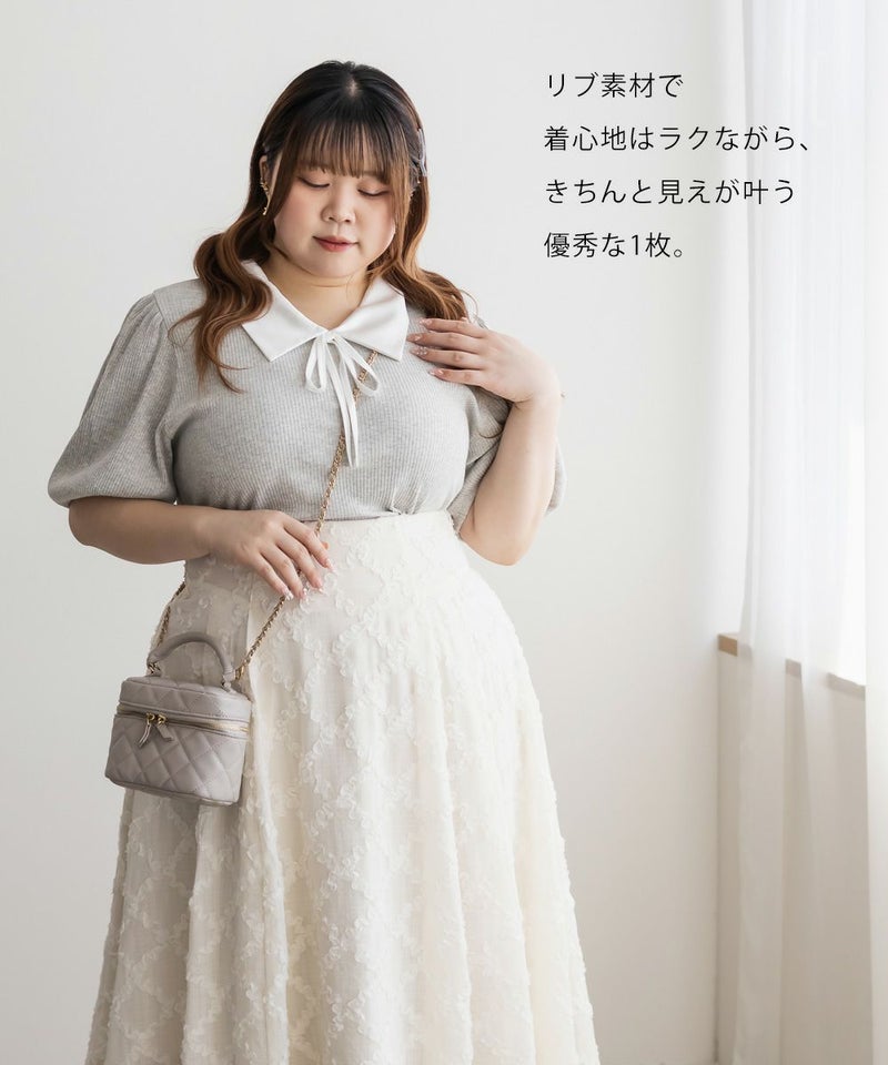 3Lを着ていつも通りのサイズ感でした。伸びのいいリブ素材だけど、身体のラインをを拾いすぎないゆとりを持たせたシルエットで嬉しいです! 袖もふんわりしていてぴったりせず、二の腕が気にならないのがポイント!光沢感のある襟とリボンがアクセントになっていて、着るだけでコーデが華やかになるトップスです◎カットソー生地だけど、デザインが上品にもフェミニンにも仕上がる雰囲気なのでパンツにもスカートにも合わせやすく、オンにもオフにも活躍するアイテムです♪