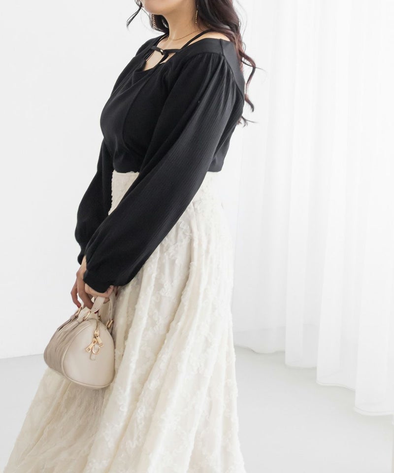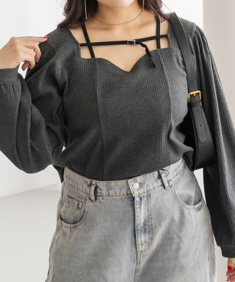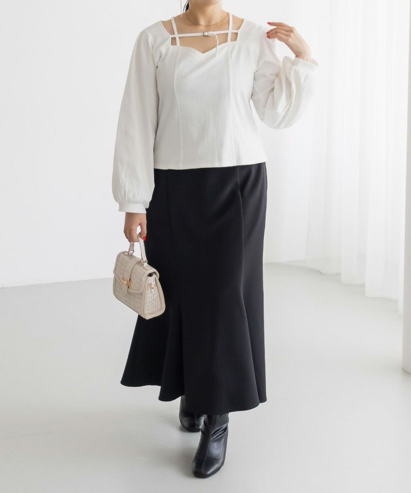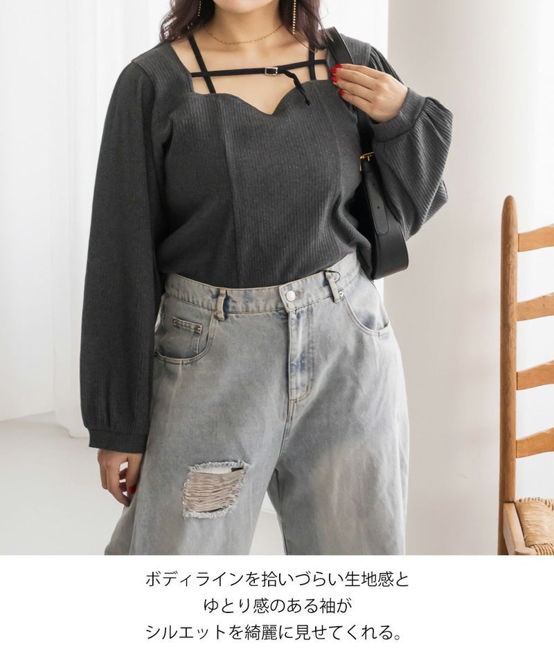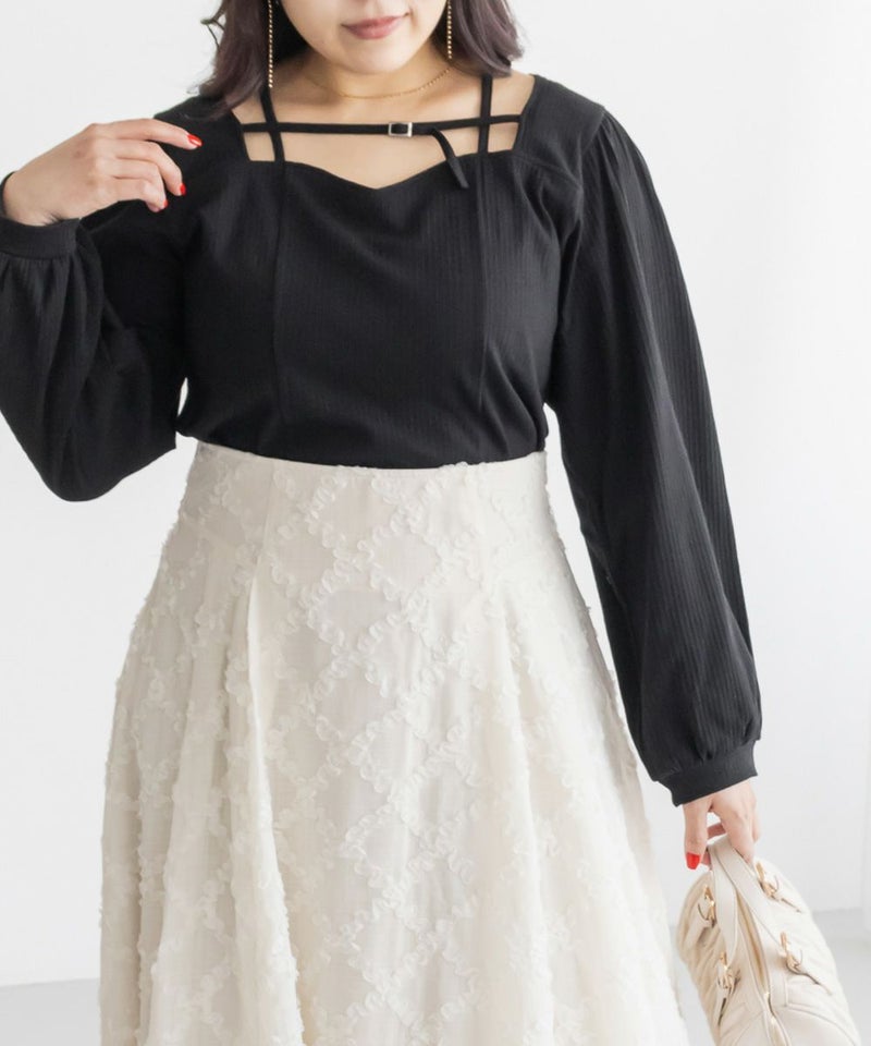 3Lサイズを着用しましたが、ちょうどいいサイズ感でした◎ピタッとなりすぎないのに、シルエットをきれいに見せてくれます。伸縮性のある生地で着心地もとてもよく、長時間着ていても窮屈さを感じませんでした。デコルテ部分のベルトデザインがアクセントになっていて、シンプルな中にさりげないおしゃれ感をプラスしてくれます!肌見せし過ぎないのにデコルテにデザインがあるだけで、しっかり抜け感を出してくれて、メリハリのあるすっきりとした印象になります◎デートや普段のおでかけにもおすすめです!