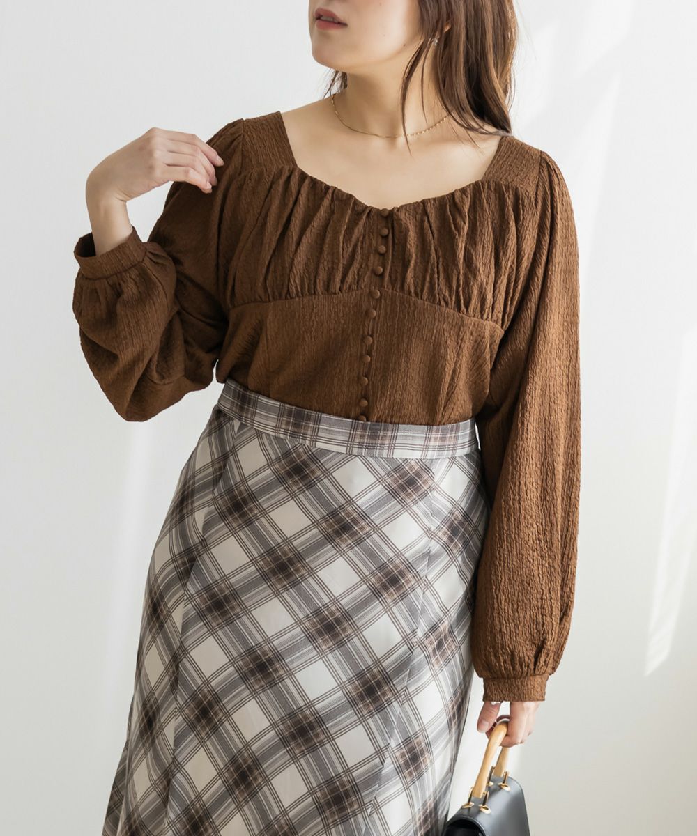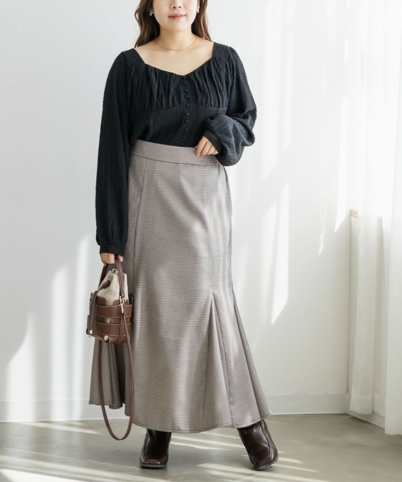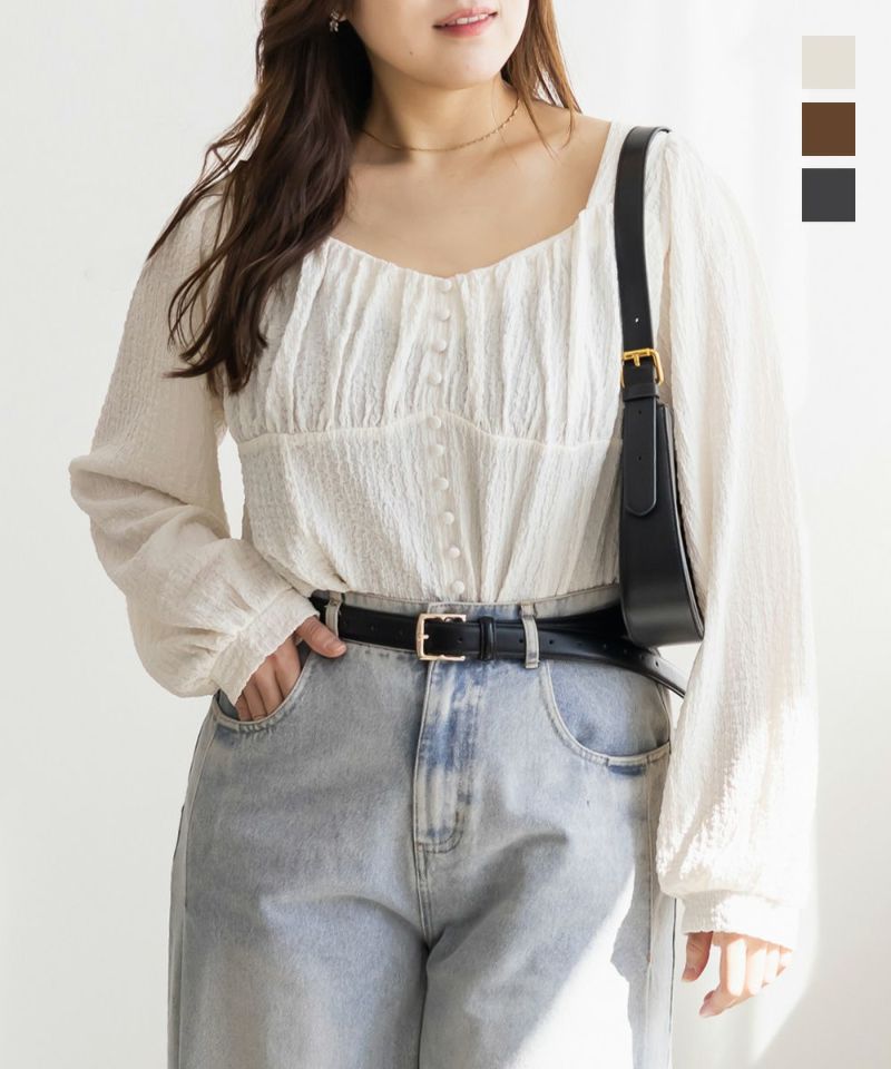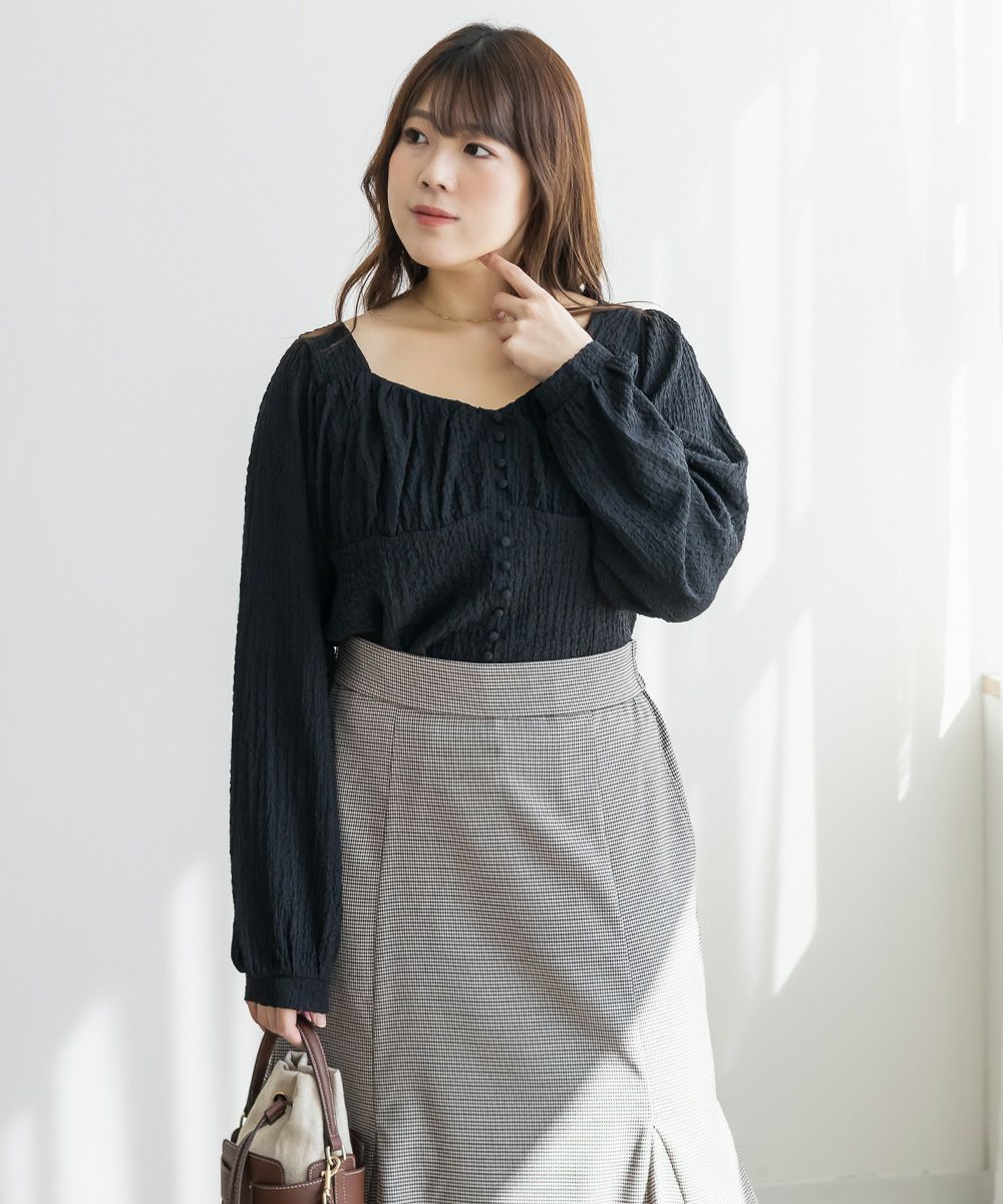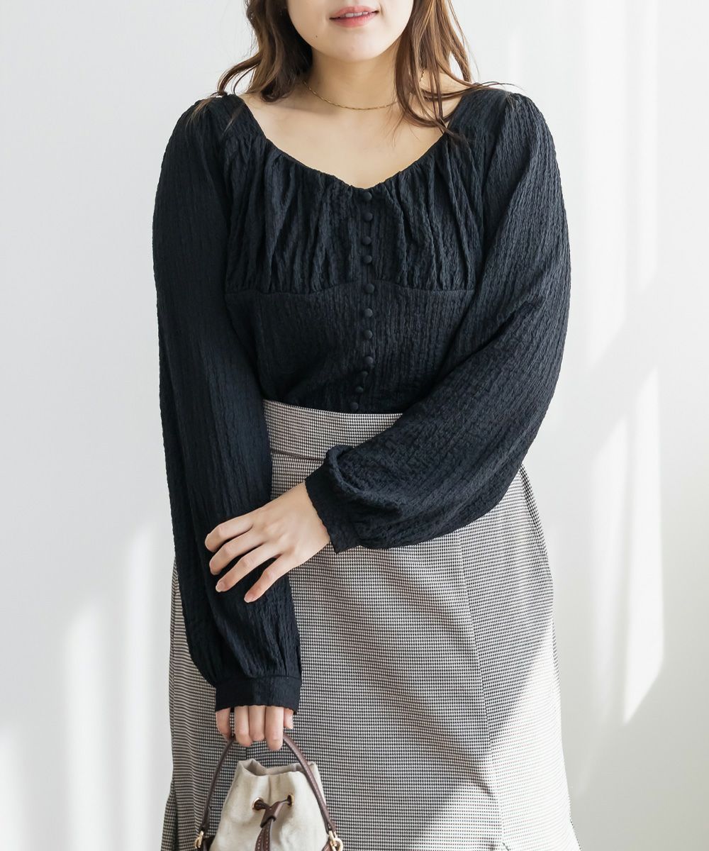 3Lサイズを着用して、ほどよくゆとりを持って着られる着心地でした。軽くて伸縮性のある生地で、とても楽な着用感でした。凹凸のある表面でボディラインを拾いずらいのも嬉しいポイントです。バストにギャザーが寄せてあって、女性らしくメリハリのある雰囲気になります。胸下からはすっきりとしたデザインになっていて、着痩せして見えます。デザイン性があって大人っぽくも、フェミニンにも合わせられるので、ボトムを選ばずに着回しできます◎秋~春とロングシーズン活躍する1枚です♪