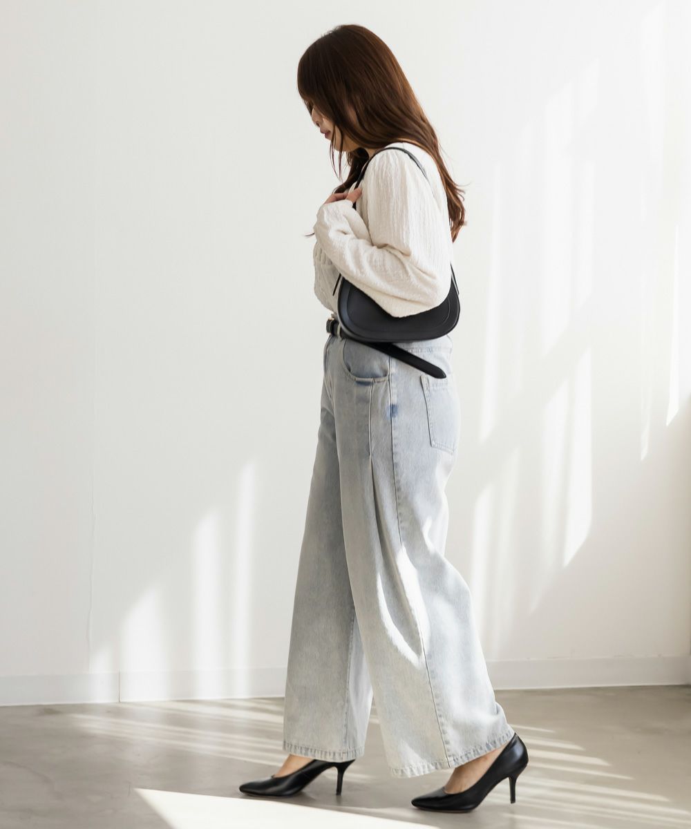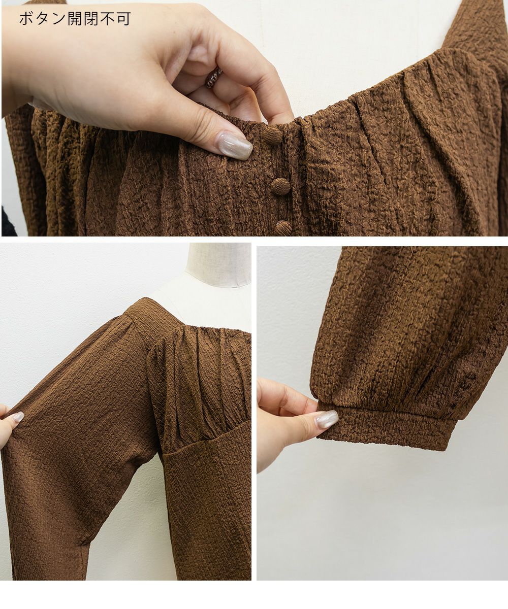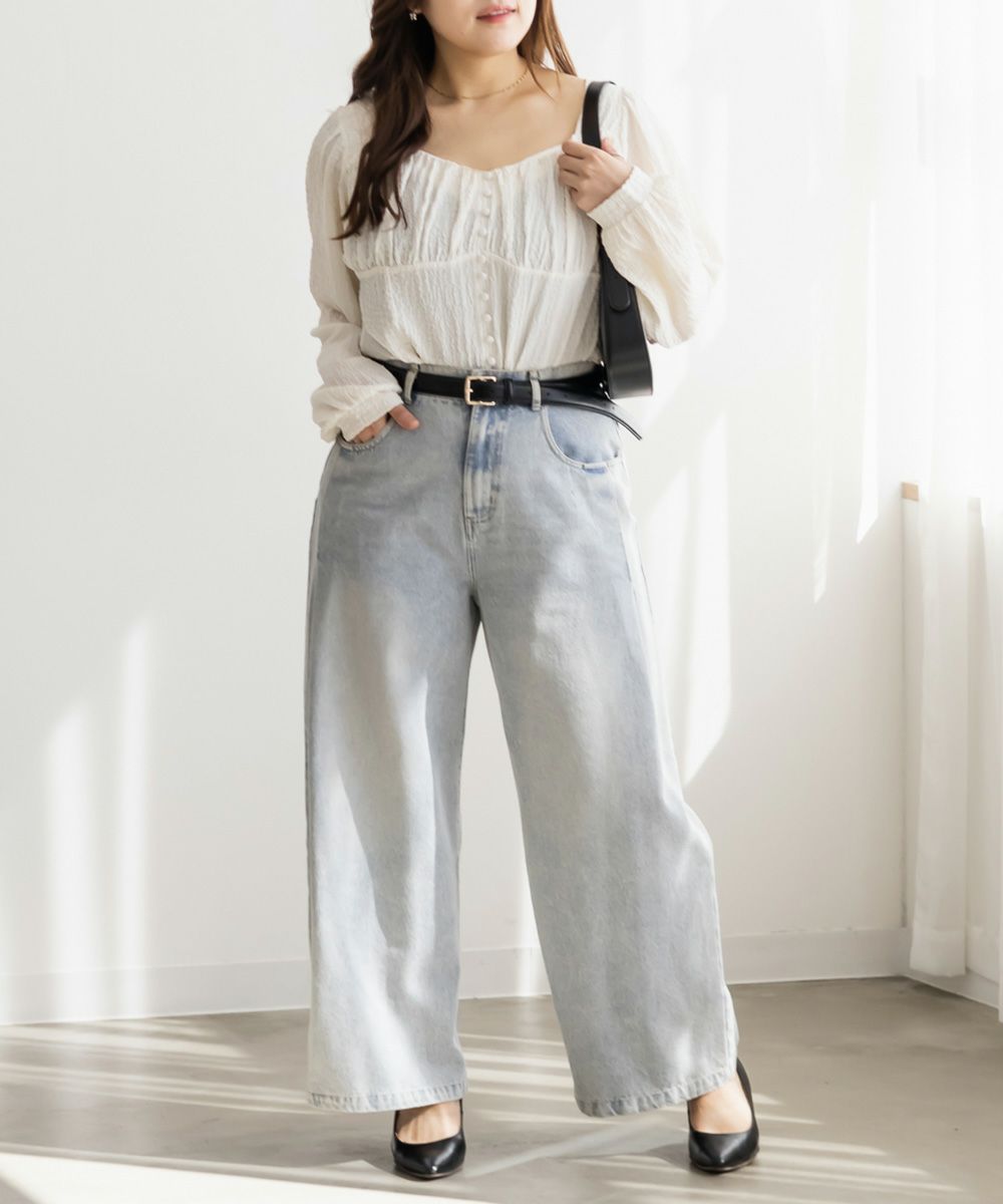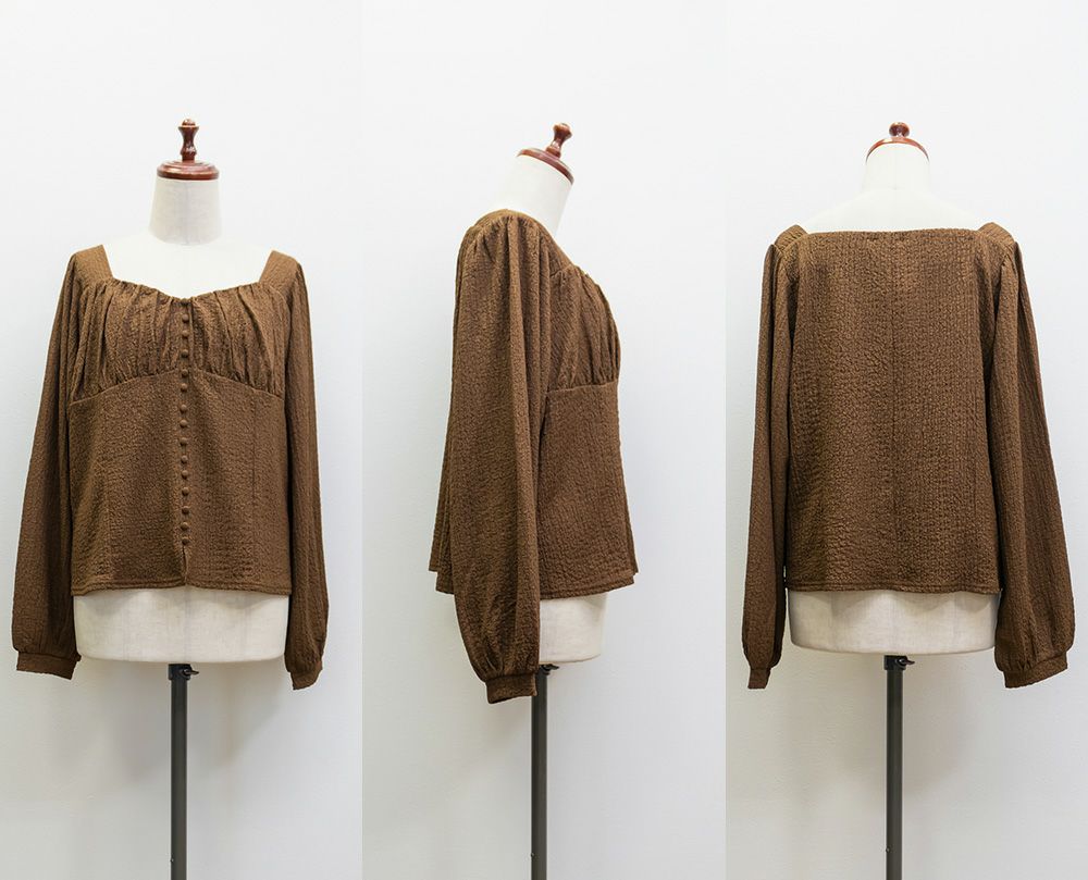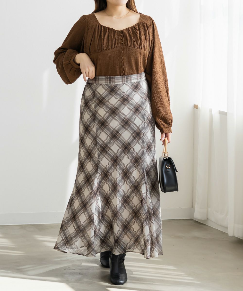 3Lサイズを着用して、ほどよくゆとりを持って着られる着心地でした。軽くて伸縮性のある生地で、とても楽な着用感でした。凹凸のある表面でボディラインを拾いずらいのも嬉しいポイントです。バストにギャザーが寄せてあって、女性らしくメリハリのある雰囲気になります。胸下からはすっきりとしたデザインになっていて、着痩せして見えます。デザイン性があって大人っぽくも、フェミニンにも合わせられるので、ボトムを選ばずに着回しできます◎秋~春とロングシーズン活躍する1枚です♪