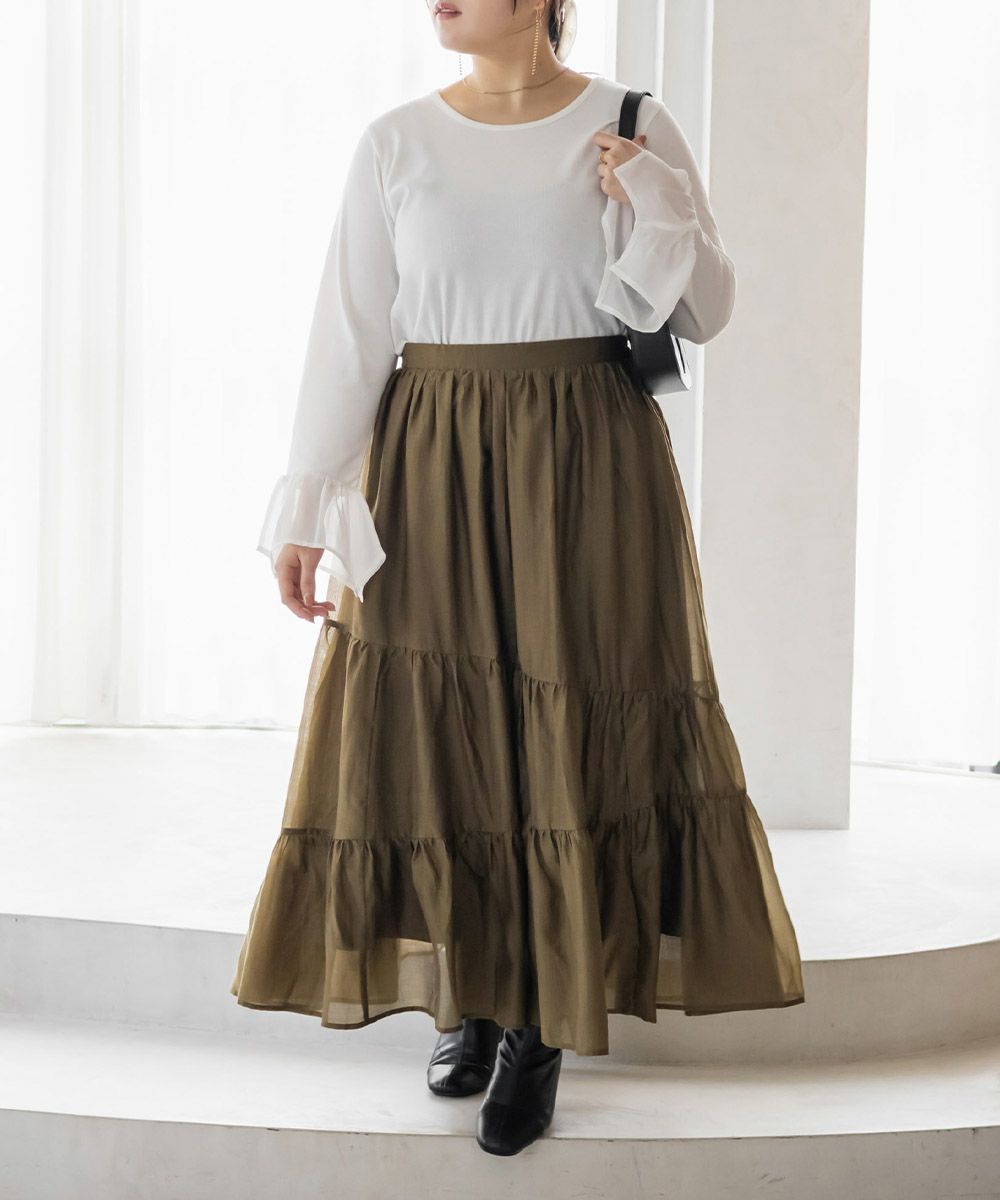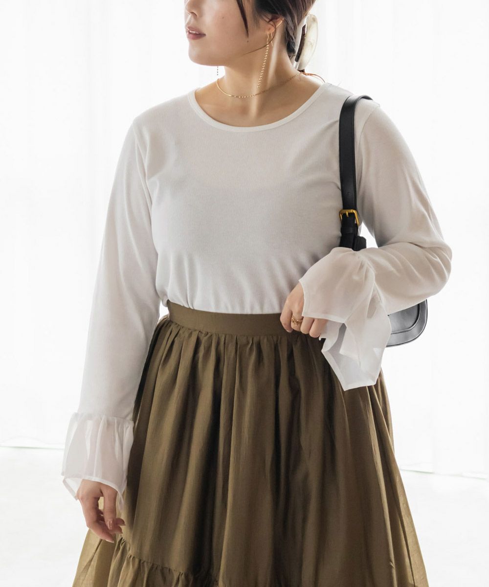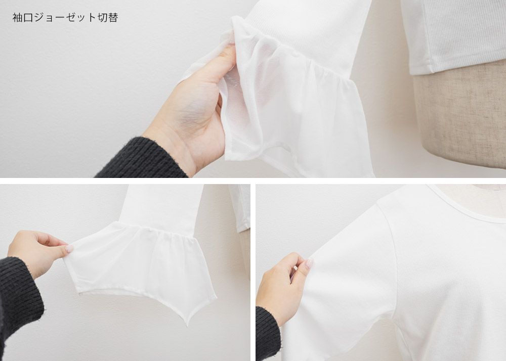 本体はリブカットソーで袖部分はさらりとしたジョーゼット素材。真夏以外のロングシーズン使える生地です。程よい生地感だからインナーとして着てももたつかず、コーデの主役トップスとして着る事も可能。