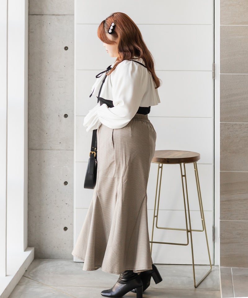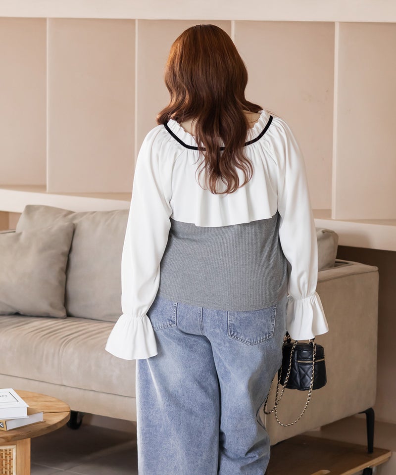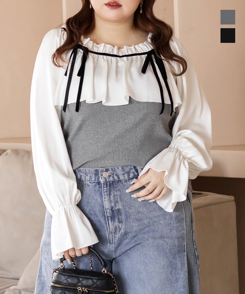 3Lを着てちょうどいいサイズでした。胸元にケープのようなフリルとリボンがついていて肩回りの肉感をしっかりカバーしてくれます!配色デザインになっているのがアクセントになってすっきりとした印象にしてくれます。生地はリブカットソーで、伸びが良くらくちんです。デザインが甘めなので、スカートは勿論パンツとの合わせも可愛いです!長いシーズン着回しできるアイテムです。
