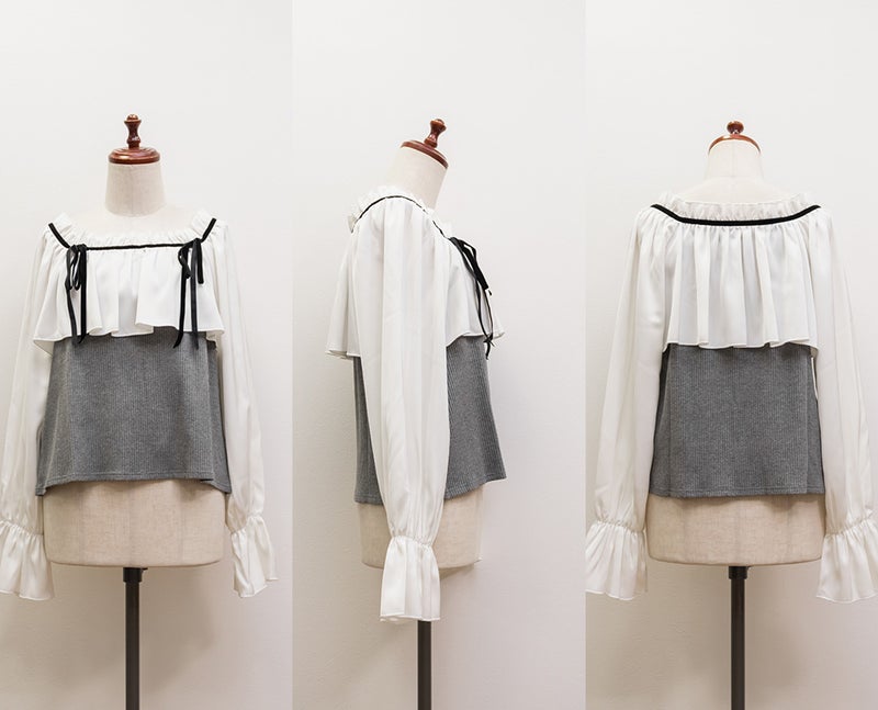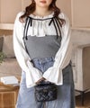 異素材ドッキングのどこかクラシックでフェミニンなプルオーバー。配色のリボンとフレアシルエットの胸元でバストを華奢見せ。