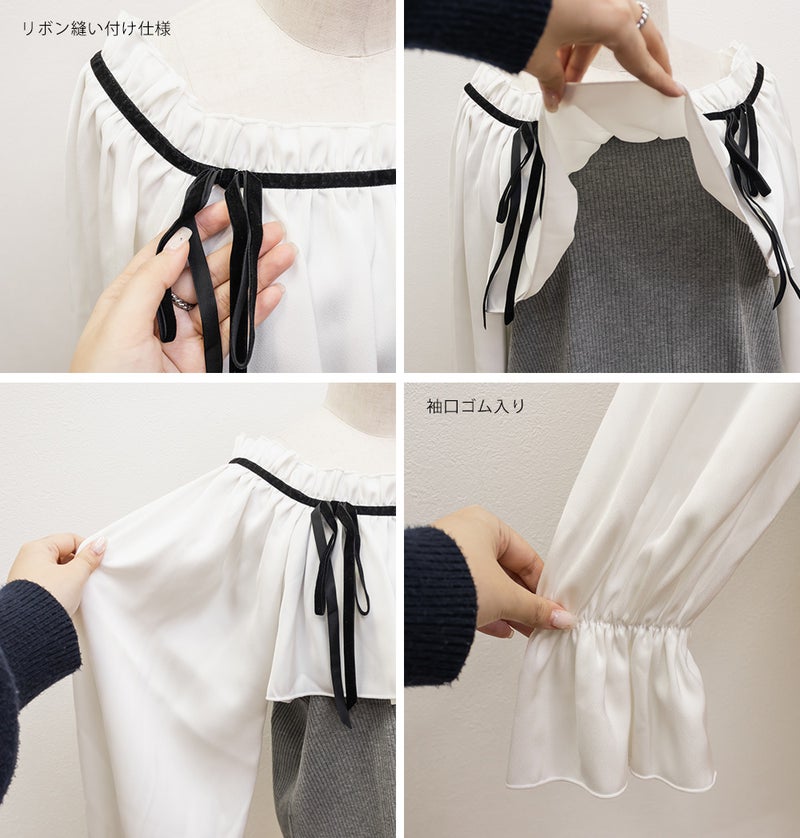 程よくしっかりとした伸縮性のあるリブ素材と落ち感のある柔らかい布帛素材とのドッキング。リボン部分は上品なベロアテープ。