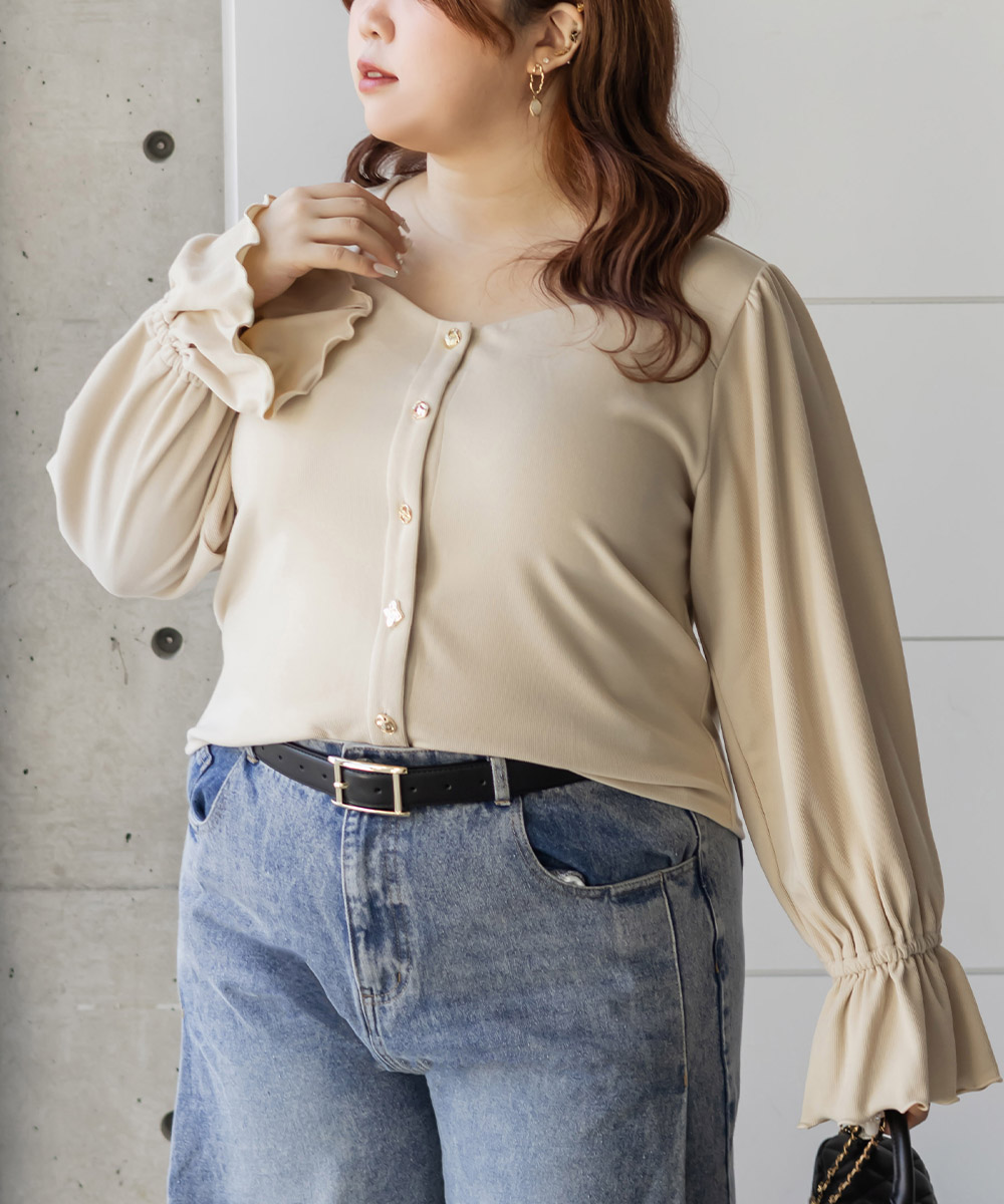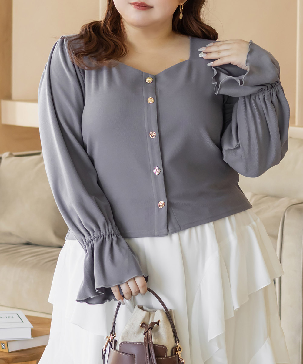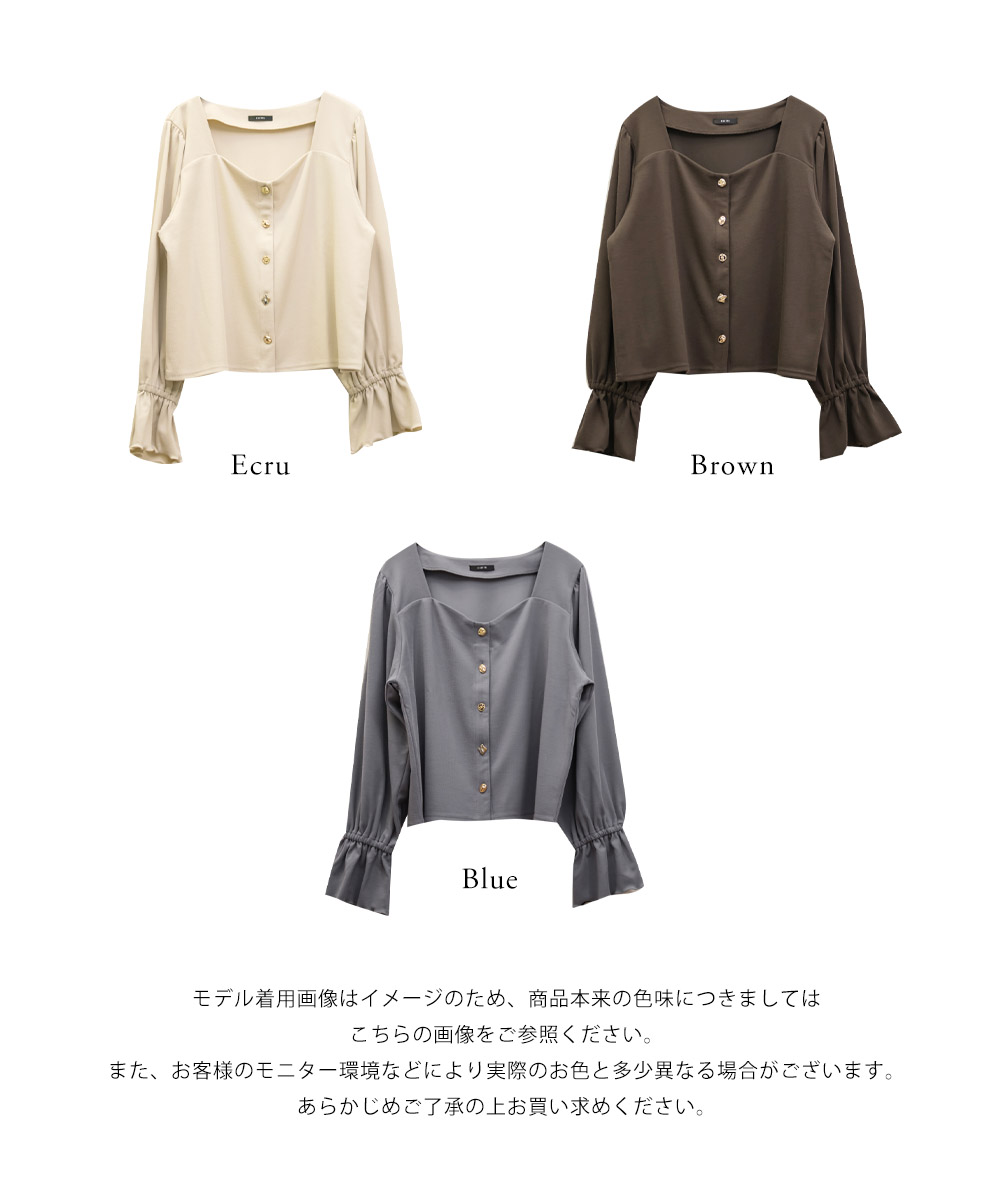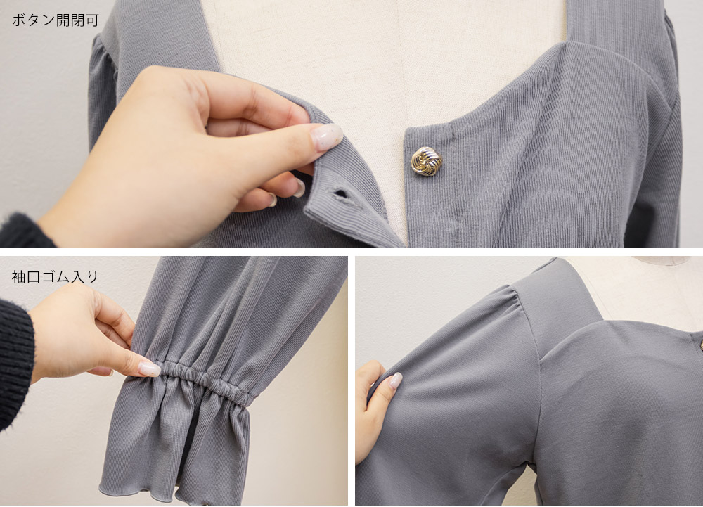 デザインちがいのアソートボタンが遊び心のあるフェミニンなプルオーバー。すっきりとした印象のスクエアネックと二の腕をカバーしつつ手元を華奢見せするキャンディースリーブで着やせ効果もアップ。
