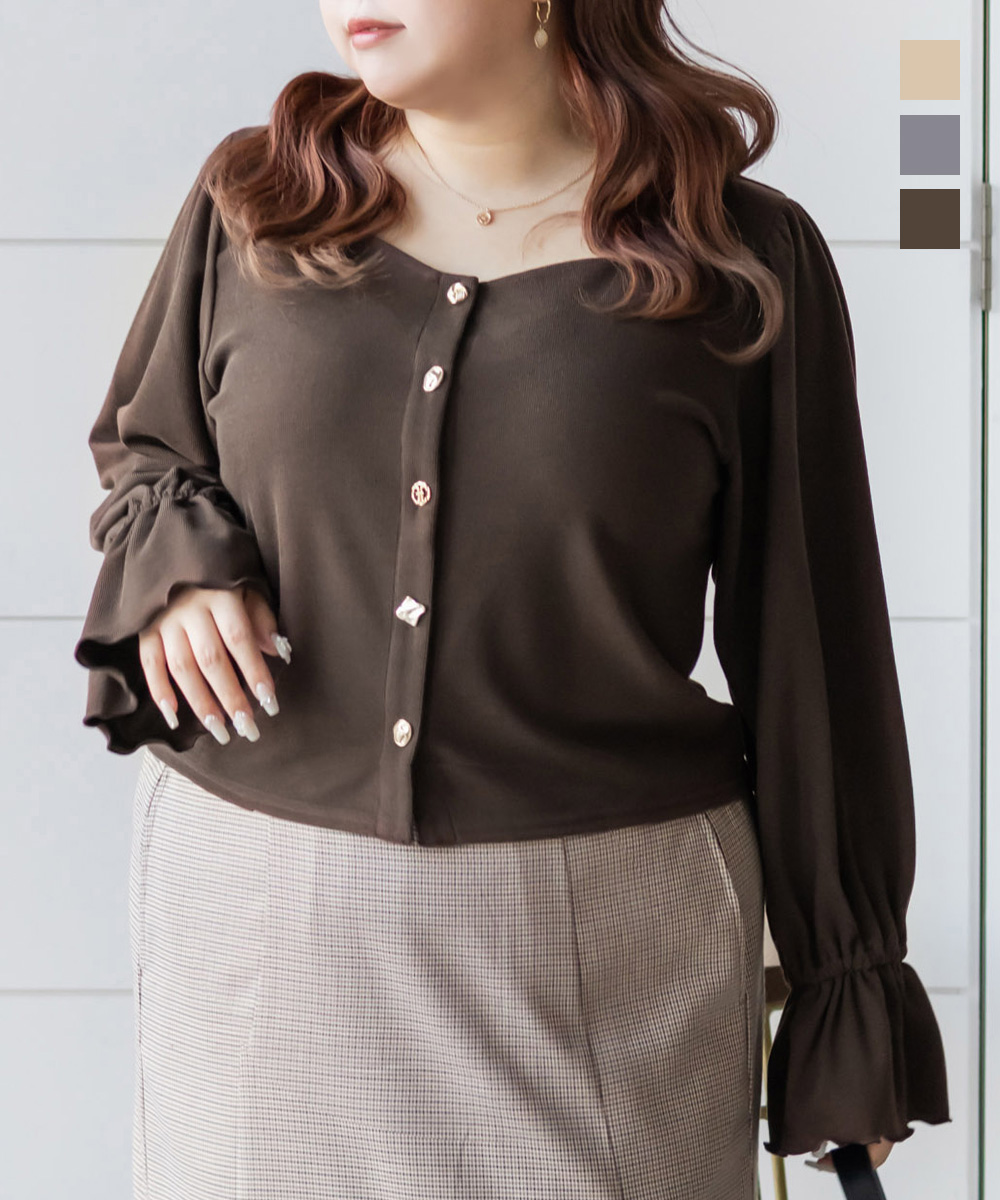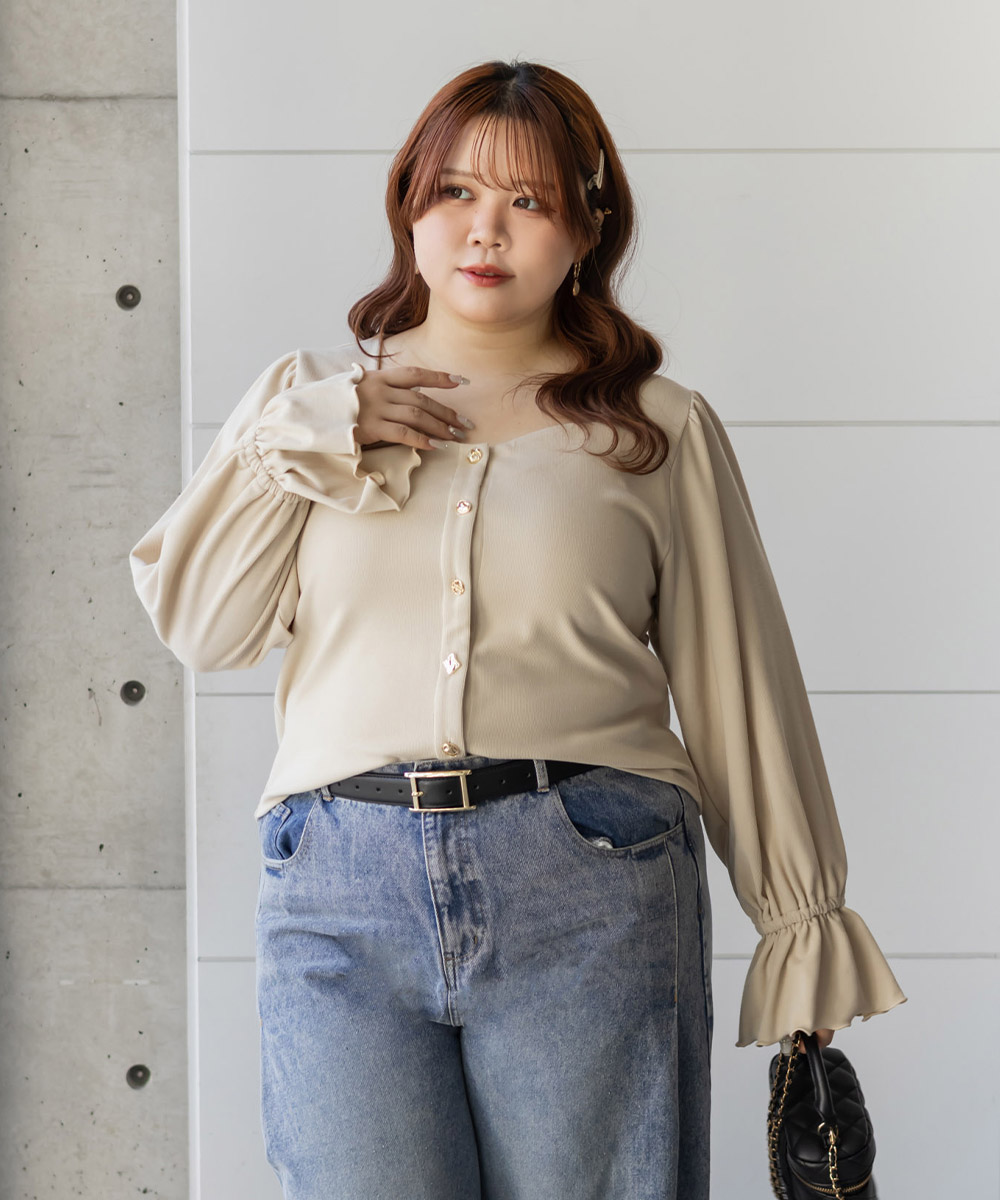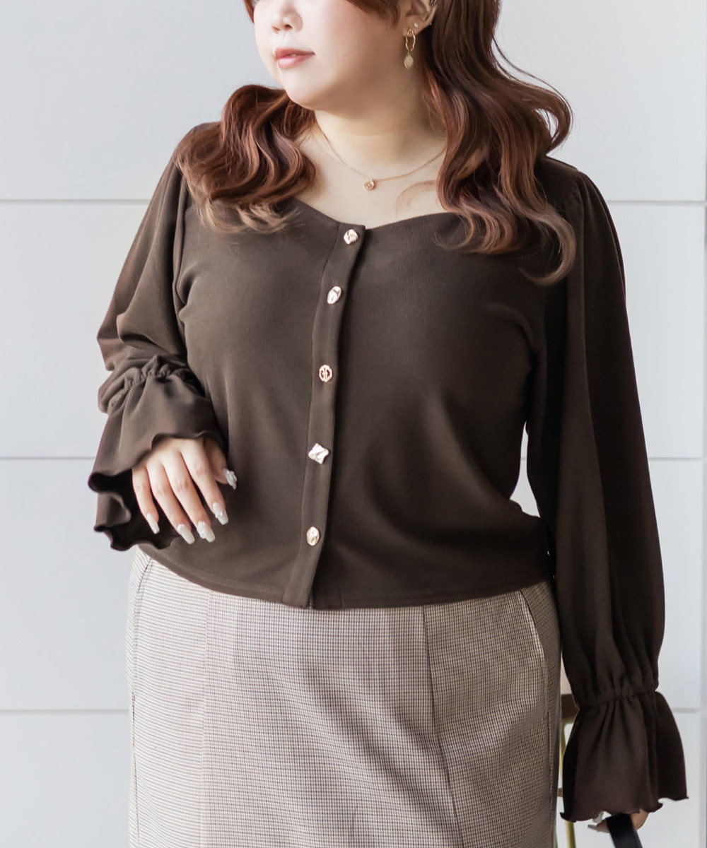 デザインちがいのアソートボタンが遊び心のあるフェミニンなプルオーバー。すっきりとした印象のスクエアネックと二の腕をカバーしつつ手元を華奢見せするキャンディースリーブで着やせ効果もアップ。