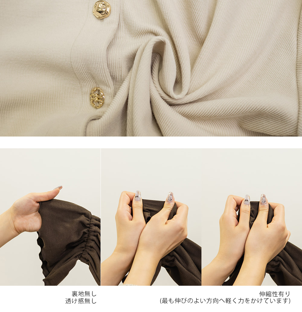 程よくしっかりとした伸縮性のある細めピッチのリブ素材。品のあるゴールドボタンが華やかなアクセントに。