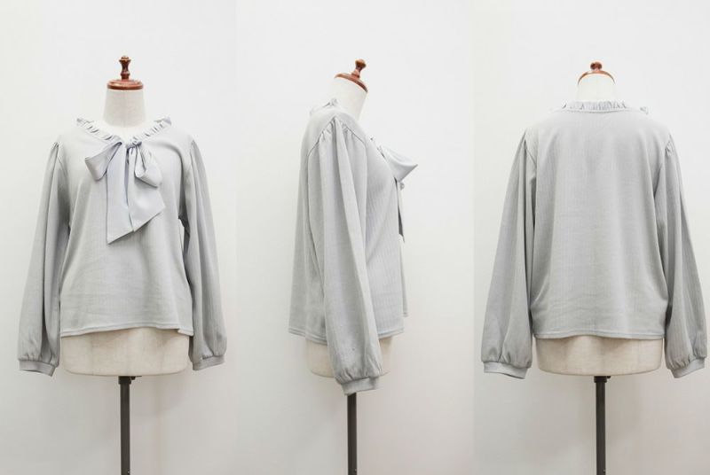 【design】襟のフリルと大きめリボンがフェミニンなポイントになったカットソー。着心地らくちんなのにデザイン性たっぷりの嬉しい1枚。【material】伸縮性があり程よくしっかりとしたリブカットソーに、襟とリボン部分には柔らかい布帛生地を使用しています。【styling】可愛らしい雰囲気なのでスカートと合わせてガーリーなスタイルにまとめるのがお勧めです。裾がごわつかないデザインなのでスカートに裾をインした、フィット&フレアシルエットで王道スタイルもしやすいアイテムです。