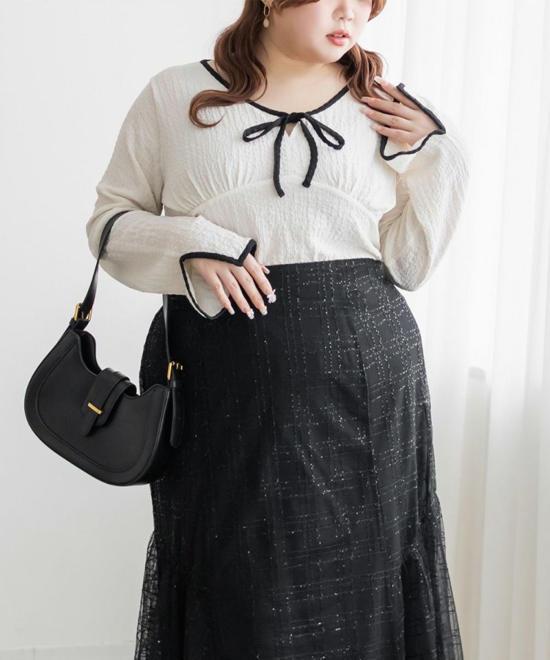 3Lサイズを着用しました。いつも着ているサイズ感と比べてちょうどよく、身幅や袖にも程よいゆとりがあって楽に着られました。配色デザインとリボン切り替えがポイントになって、1枚でしっかり着映え