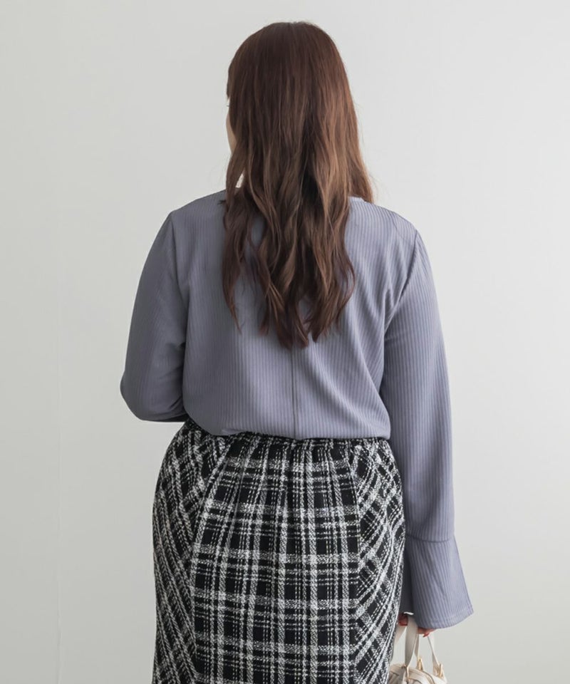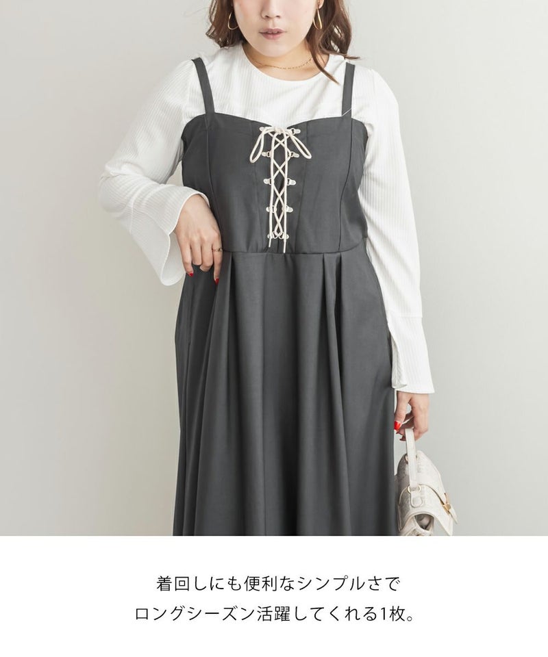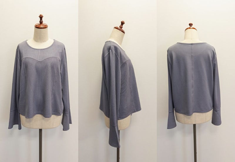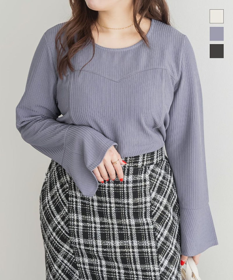 3Lサイズを着用しました。着用感はちょうどいいです。ビスチェを重ね着したような切替デザインがポイントのプルオーバーで、1枚でレイヤード風コーデが完成します。リブ素材の程よいフィット感が身体のラインをきれいに見せつつ、伸縮性があるので動きやすく快適です◎ 袖口に向かって広がるデザインが手元を綺麗にみせてくれます♪すっきりとしたシルエットで、アウターを重ねてももたつかないのが嬉しいポイントです。デニムやスカートなど、ボトムを選ばず着回しやすく、シンプルながら着映えするアイテムです。