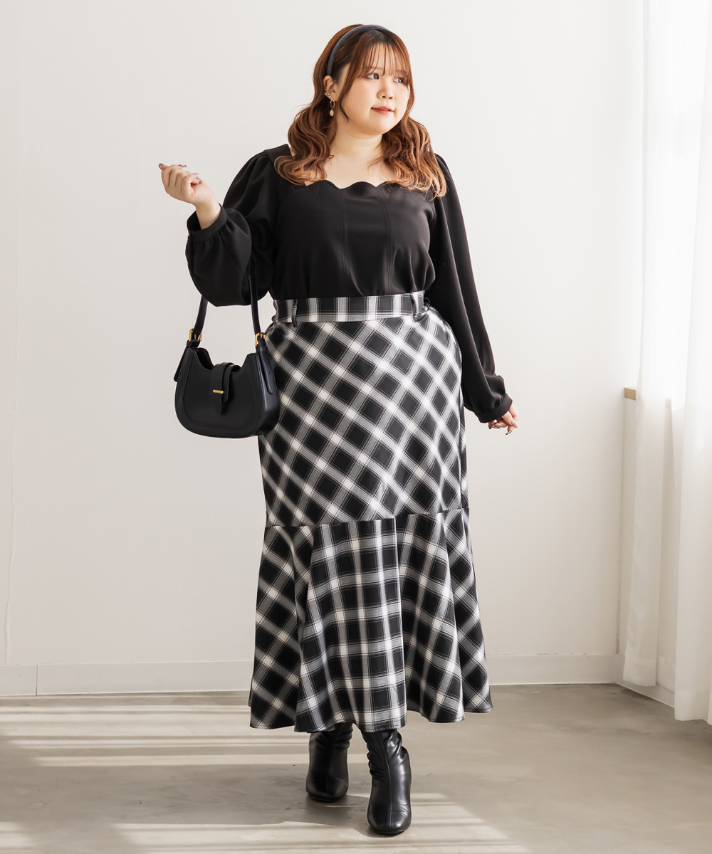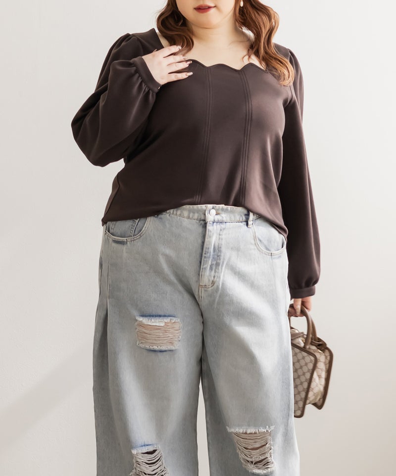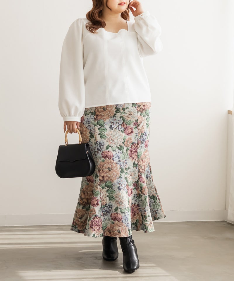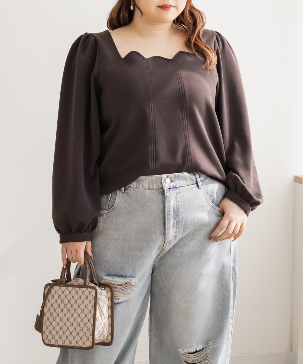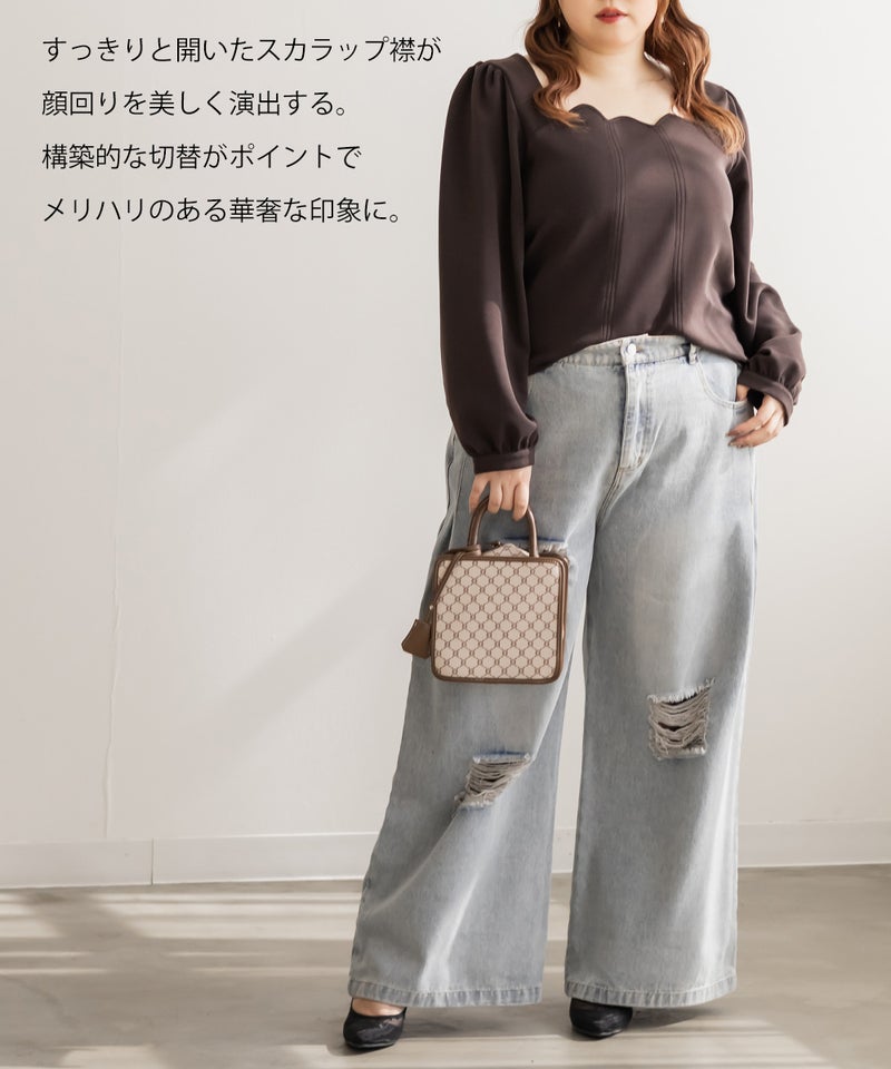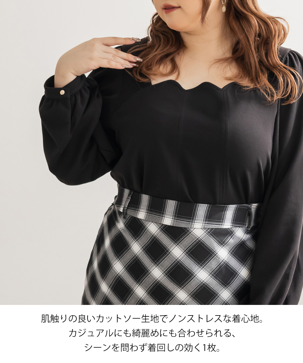 3Lサイズを着用しましたが程よくよくゆとりもあり、生地もやわらかくリラックスして着られました。構築的な切替が入っていて、自然に体型をカバーしてくれて、メリハリのある印象です!上品見えする生地・デザインでシンプルなのに特別感のある1枚です!首元はスカラップになっていてさりげなく華やかなのもポイントです。オフィスカジュアルなどにもピッタリで、普段使いはデニムパンツ合わせでカジュアルに、スカート合わせでフェミニンにも着回せる万能トップスです◎