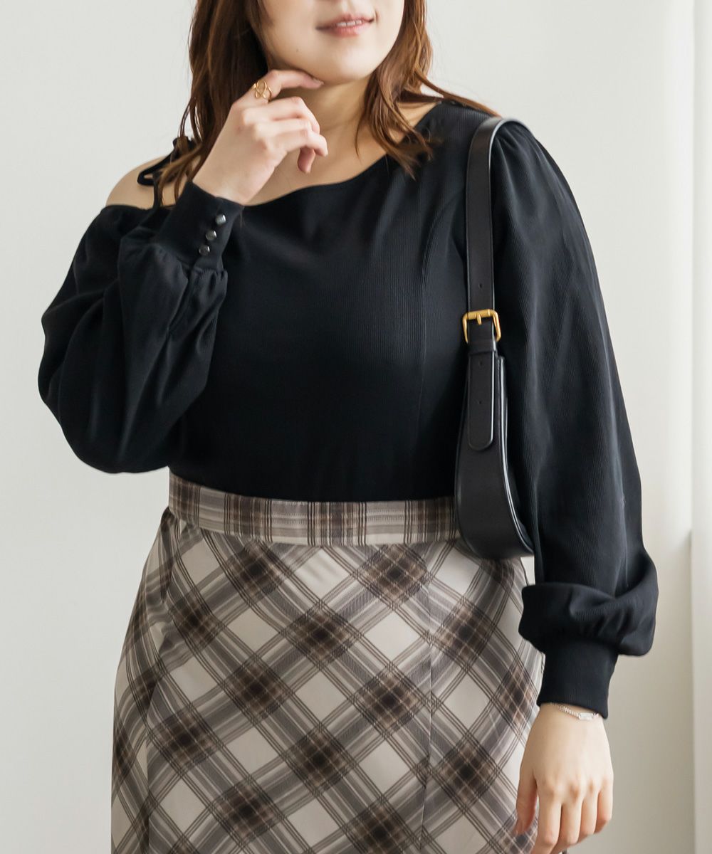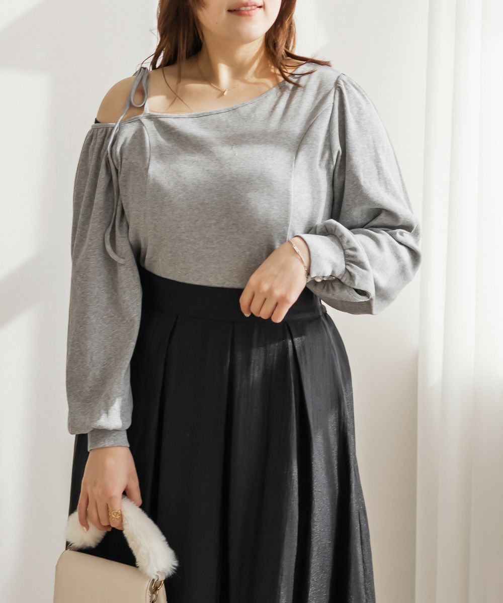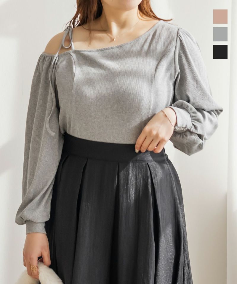 LLサイズを着用しました!生地自体も伸びがあり、窮屈感は特に無く着用出来ました。ワンショルデザインだったのでピッタリで着用したほうが綺麗に着れそうでした。 野暮ったくならず洗練された印象になるディティールがポイントで、肩はさりげないリボンがついていて可愛いです◎リブカットソーでラフなのに女っぽさ満点の1枚で、ナチュラルな肌見せが上品な雰囲気の1枚です。さらっとした生地感なので、春~秋と長いシーズンお使いいただけます!