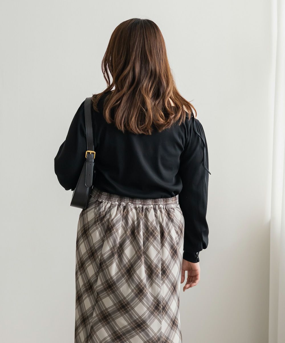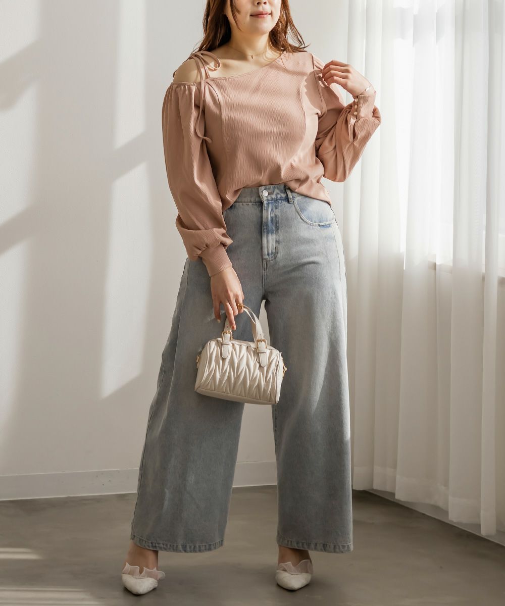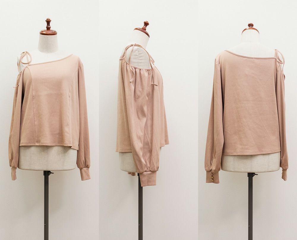 女性らしさたっぷりのデコルテデザインがポイントのカットソー。肩が全部は見えない程度の程よい肌見せでやりすぎ感なく女っぽい着こなしに。体型に合わせてリボンを調整可能で肩にはゴムが入っているから動きやすさも計算されたデザイン。ぽわんとしたシルエットの袖が手首を引き締めてメリハリのある着やせ効果をプラス。