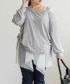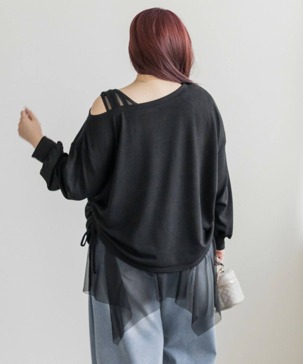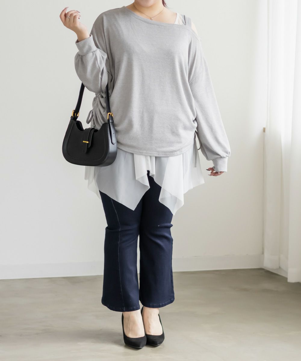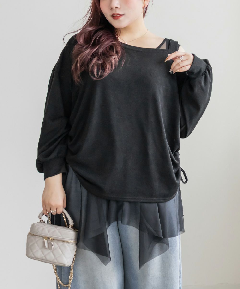 3Lサイズを着用しました!トップスはカットソー生地なのと、インナーはチュールで軽く少し伸びる生地なのでとってもラクな着心地です◎ トップスの両サイドはブラウジング出来て、リボン結びも可愛いし、お好きな丈感に少し調節できます!らくちんな着心地ですが、ワンショルデザインとレイヤードセットになっていて野暮ったくならず洗練された印象。インナーは程よく丈があるので下お腹周りも自然にカバーしてくれすっきり見えします!ラフなのに女っぽさ満点の1枚で、お出かけにぴったり!もちろんトップス・インナーは別で着回しできるので、色々なスタイリングが楽しめます♪