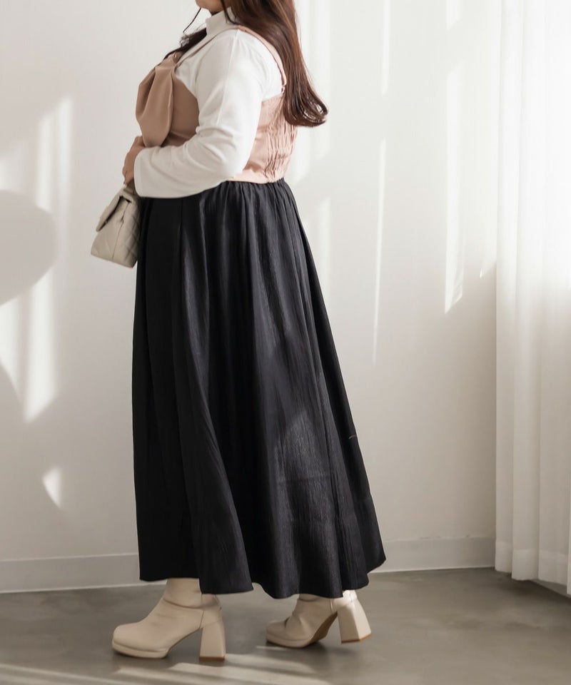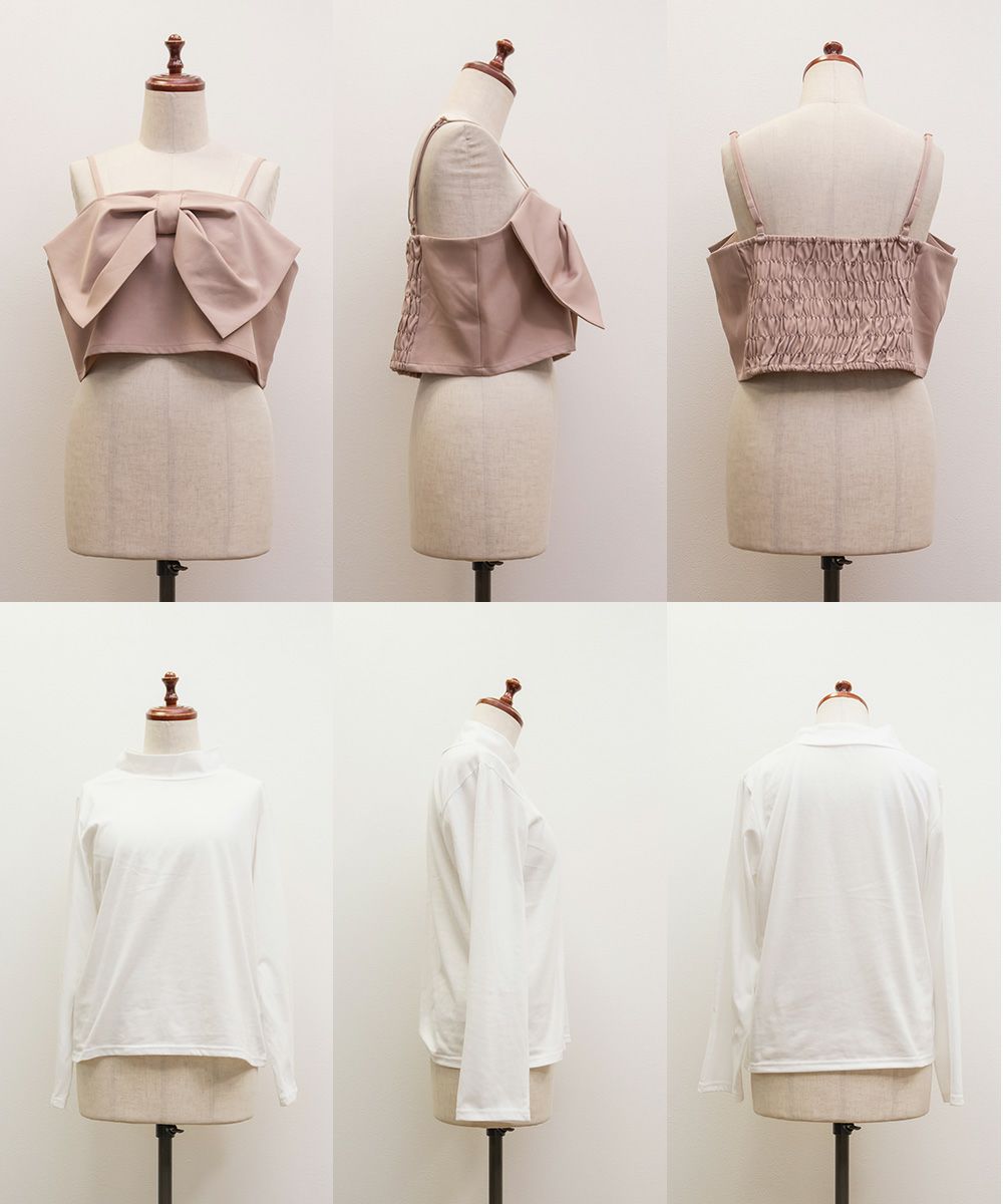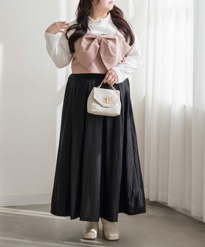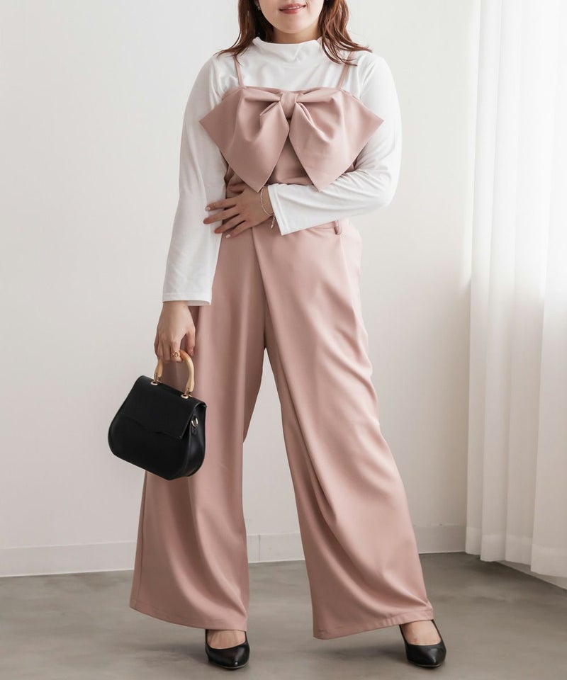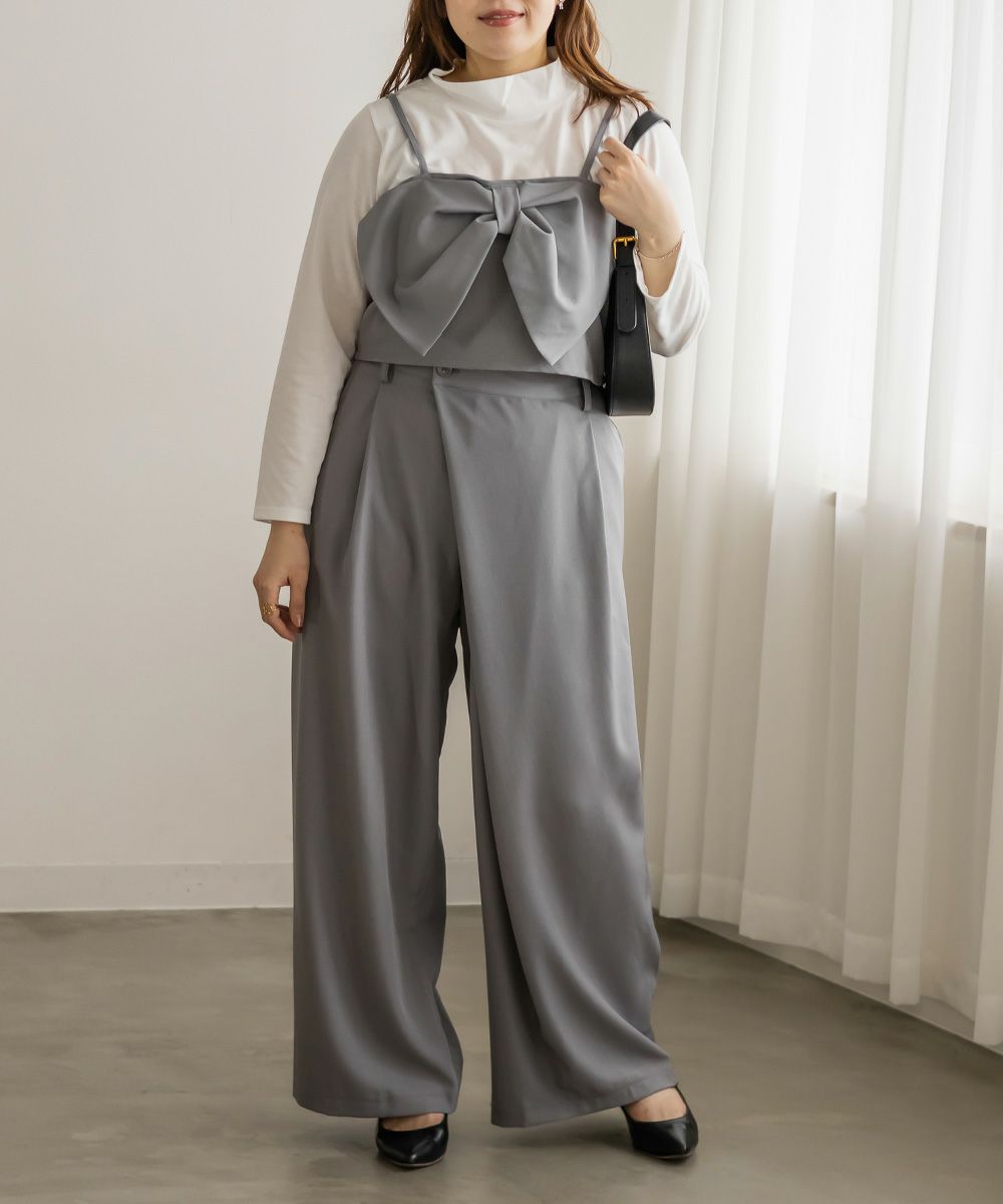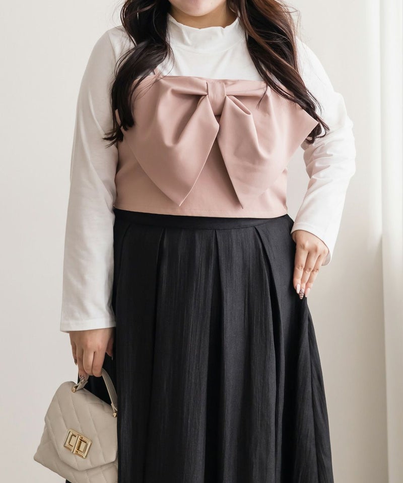 3Lサイズを着用していつもどおりのサイズ選びで問題なさそうでした!ビスチェは後ろゴム入りだけど生地自体は伸びないのでバストサイズの確認をお勧めします◎トップスとビスチェのセットでそれぞれ別のアイテムと合わせて着ても可愛いです!トップスはリブカットソーでらくちんな着心地です!大きめのリボンが目を惹くアイテムで、ガーリーなスタイルになれちゃう1枚です!ビスチェと同じ生地のパンツとセットアップで着てもお洒落な雰囲気になれてお勧めです♪