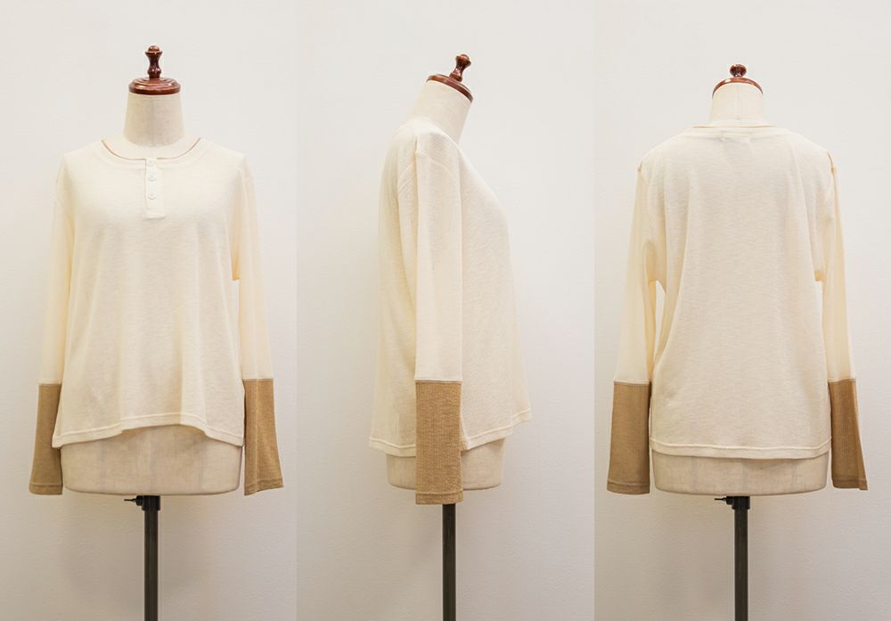 3Lサイズを着てちょうどよい着心地でした。やわらかく軽いさらっとした生地で、窮屈感も全くなく着られます◎透け感があって長袖でも涼しく着られるので、秋らしい着こなしにピッタリです!1枚でさりげないアクセントになる重ね着したようなデザインで、今っぽいヘンリーネックが大人っぽくお洒落な雰囲気です。一枚でも様になり、ワンピなどを重ね着しても可愛いと思います♪ボタンを少し開けて、抜け感のある着こなしもおすすめです。