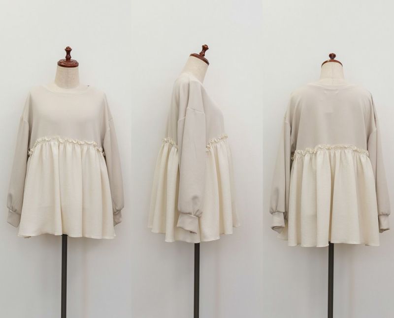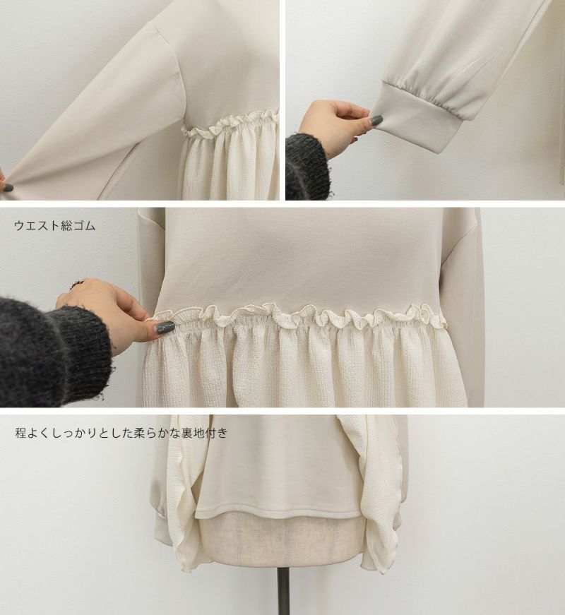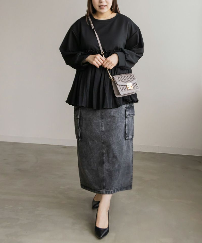 3Lを着用してちょうどいいサイズ感でした!首回りは詰まりすぎてないすっきりとしたクルーネックで顔回りもすっきり!切替がフリルっぽくなっているのもかわいいです◎ペプラムの切替は気になる部分を隠しつつ着やせできるのでおすすめです。上部分はダンボールニットになっていて着心地が良いのもポイント!すっきりめのボトムやデニムと合わせるのがお勧めです♪