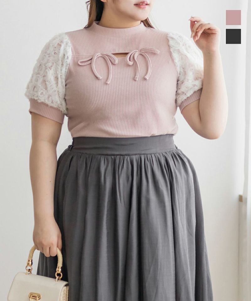 3Lサイズを着用して、ぴったりしすぎず、ちょうどいい着心地でした◎身頃はカットソー素材で柔らかく伸びるので、動きやすさも抜群♪袖は繊細なフラワーレースに切り替えられていて、肌がほんのり透けて見えるのが可愛いです!リボンデザインもガーリーでさりげないアクセントになっていて、甘いコーデがお好きな方にお勧めです◎スカートに合わせるだけで、コーデがパッと華やかになります!