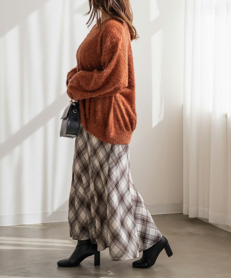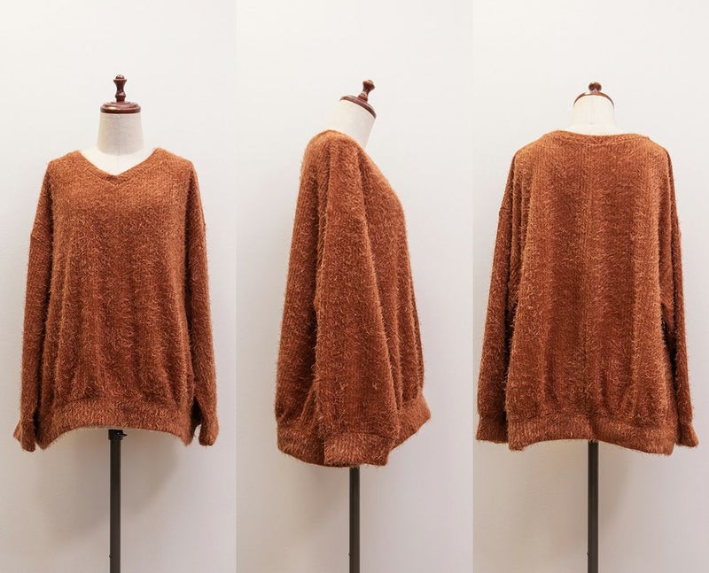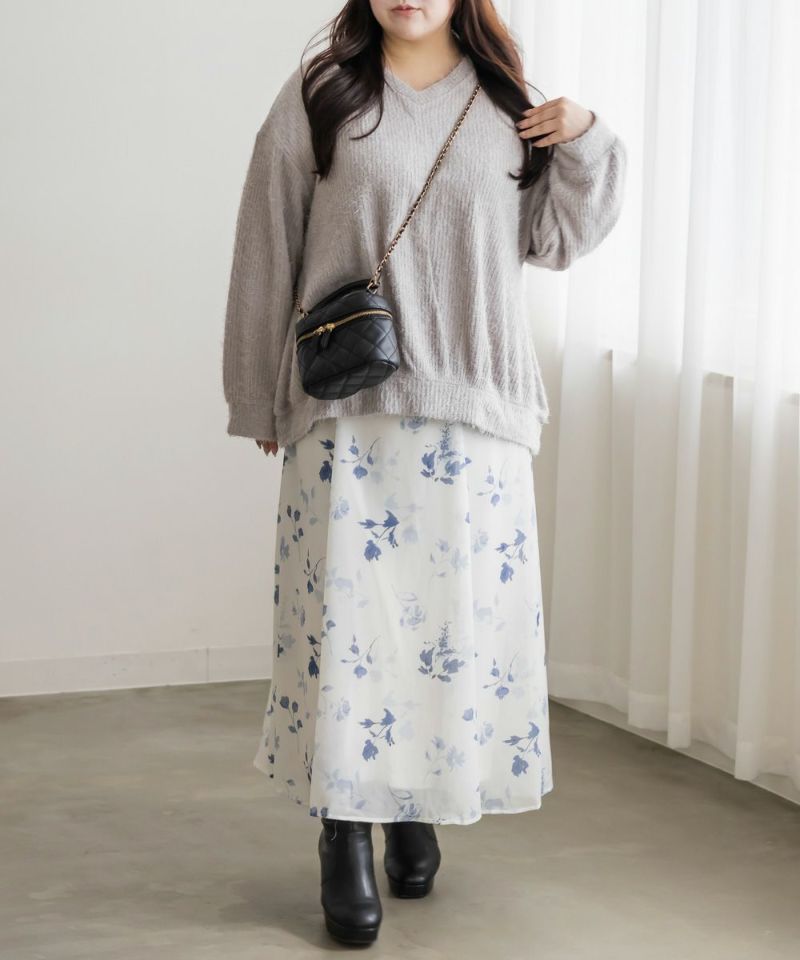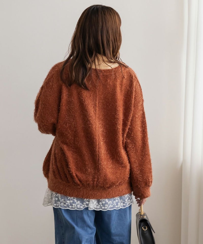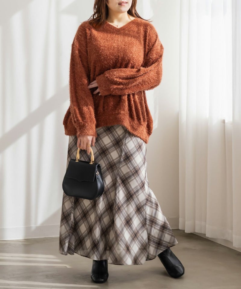 3Lを着て程よくゆるっとしたシルエットで着ることが出来ました!いつも通りのサイズ選びで問題なさそうでです◎体も腕回りもゆったりとしたサイズ感で、お尻あたりまで隠してくれる丈なので気になる部分をすっぽりカバーしてくれました!Vネックで顔回りは抜け感があるので、すっきりとした印象で着こなせます。フワフワのシャギー感が可愛いけど厚みが無く軽いので、楽で暑くならないのが嬉しい!パンツにもスカートにも、バランスよくコーディネートできました。色々着回しできる1枚です♪